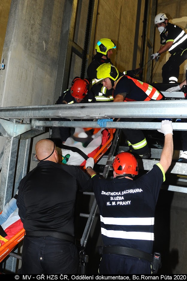 Osobu jsme pomocí lezecké techniky vyprostili a transportovali ji do sanitního vozu ZZS HMP. Poté jsme ve spolupráci se zaměstnanci firmy, která spravuje výtah, vyprostili i osobní automobil a to pomocí navijáku, hydraulických vaků a lezecké techniky. Okolnosti nehody jsou v šetření Policie ČR.