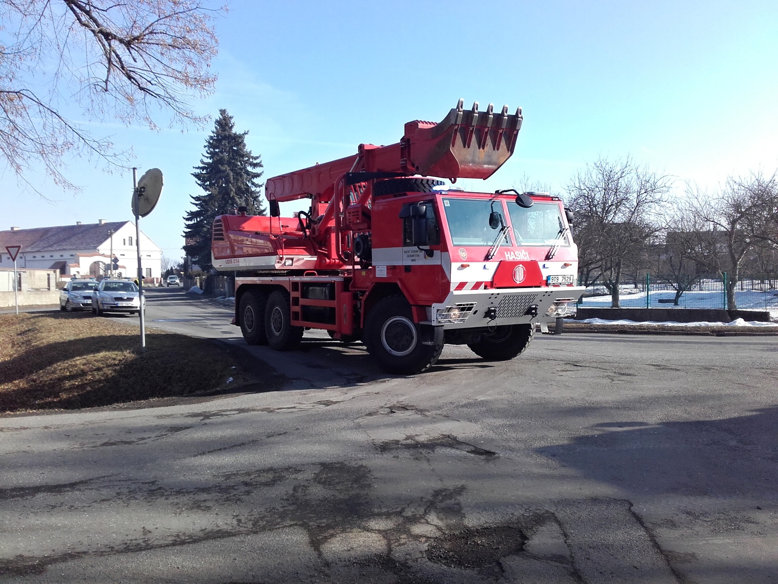 K požáru v obci Zvole na Praze – západ , který vypukl v noci po půlnoci v úterý 14.2. 2017 v průmyslovém areálu  tamější lakovny dorazila těžká technika ze Záchranného útvaru HZS ČR ze Zbirohu - T 815 6x6 UDS-214, na cestě je velký nakladač Caterpillar 329E z Hlučína.