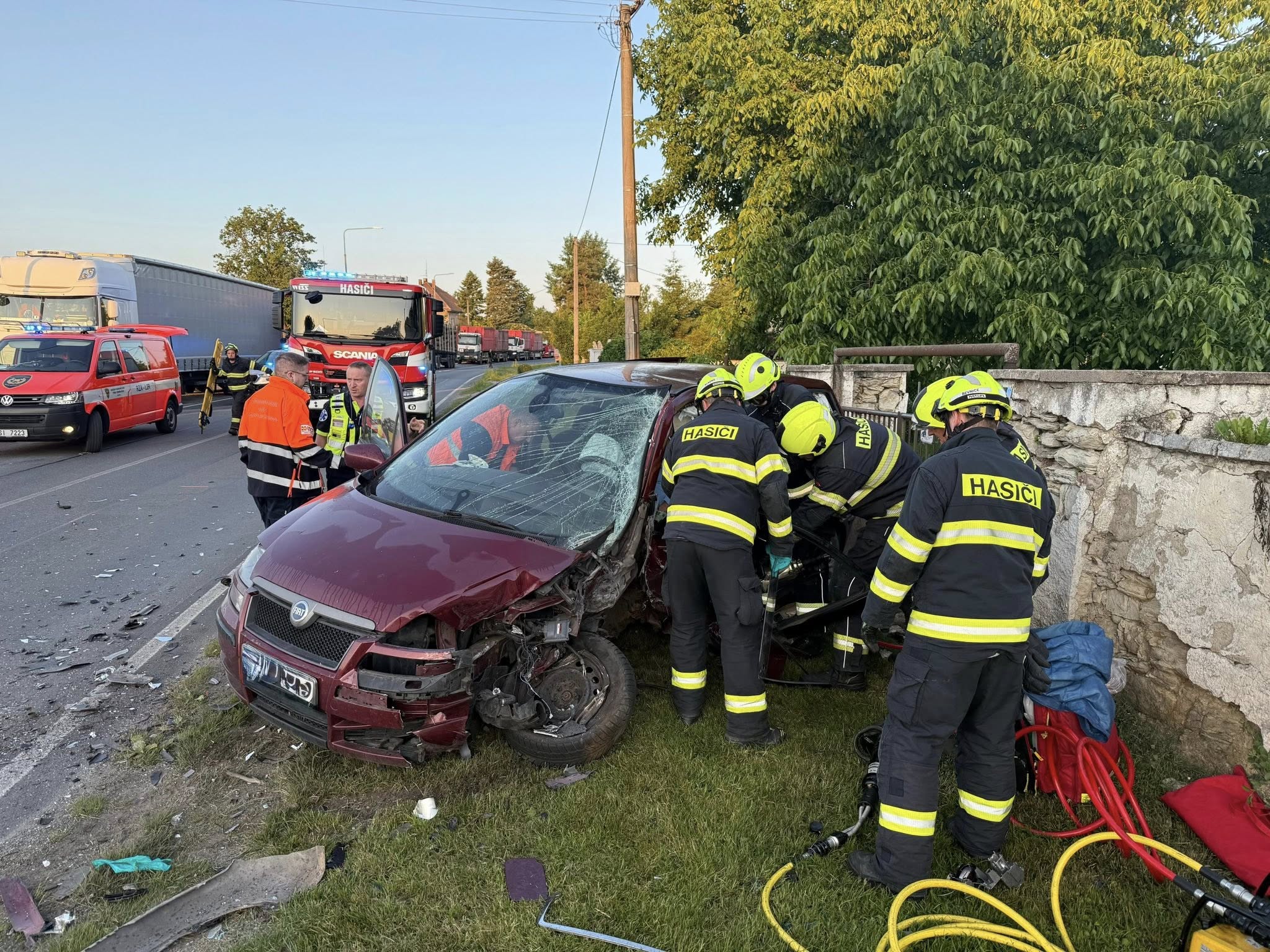 K nehodě se jako první dostavili profesionální hasiči ze stanice Slaný, jejichž výjezd následně posílily jednotky ze Stochova a Kladna. Už při příjezdu bylo jasné, že situace je vážná – kabiny obou vozidel byly silně zdeformované a pasažéři zůstali uvězněni uvnitř. Každá minuta hrála roli.