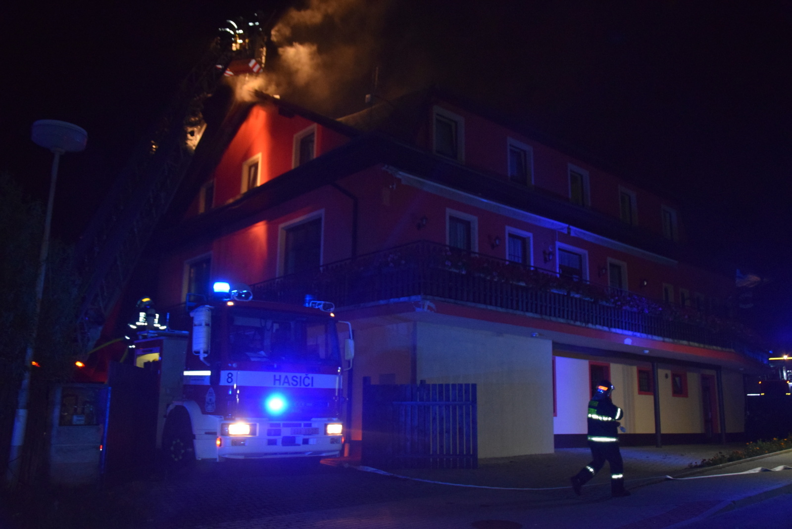 V době příjezdu první jednotky byla část třípatrové budovy zcela v plamenech a požár rychle nabíral na intenzitě. Hasičům se podařilo požár pomocí čtyř C proudů z vnější části budovy a jedním C proudem uvnitř objektu lokalizovat v 01:23 hodin. V průběhu zásahu byly z budovy vyneseny tři propanbutanové tlakové láhve. V další fázi následovalo vyhledávání skrytých ohnisek pomocí termokamery a jejich dohašování, tyto práce trvaly až ranních hodin.