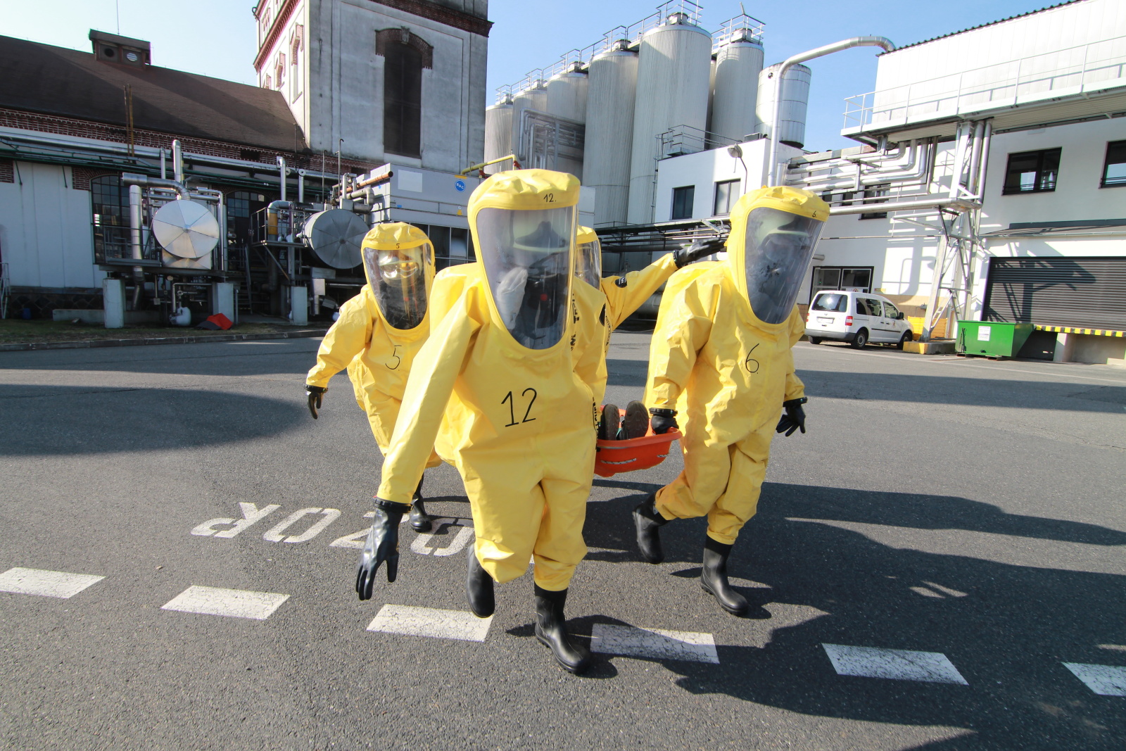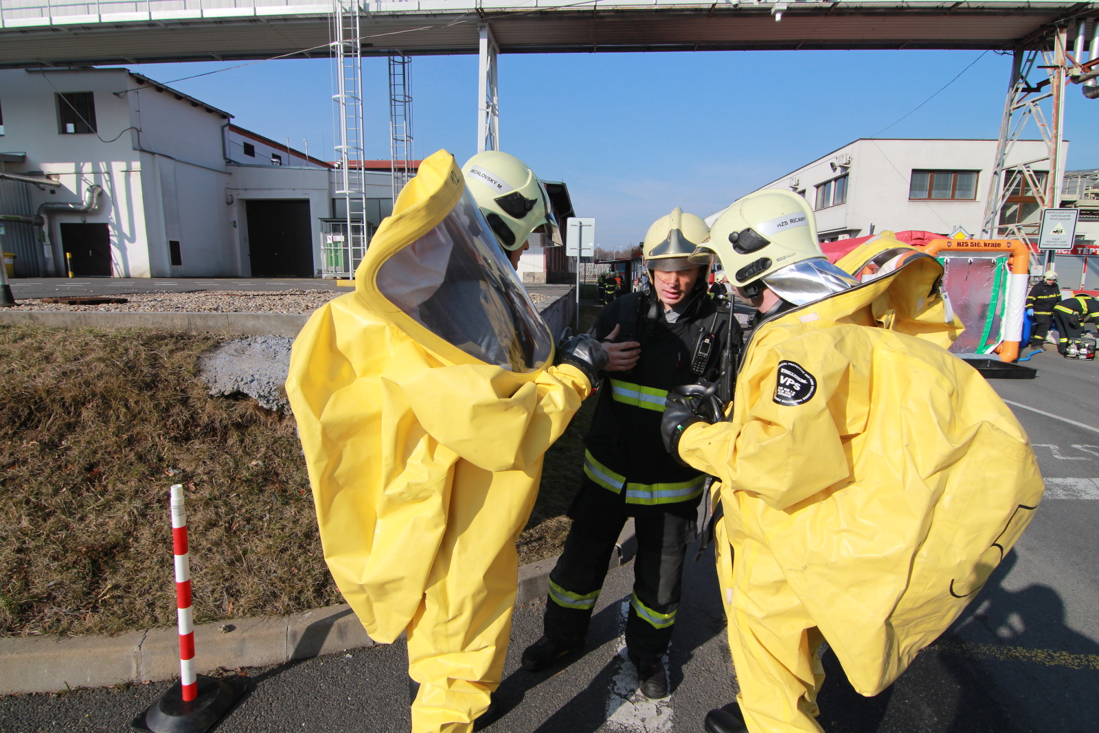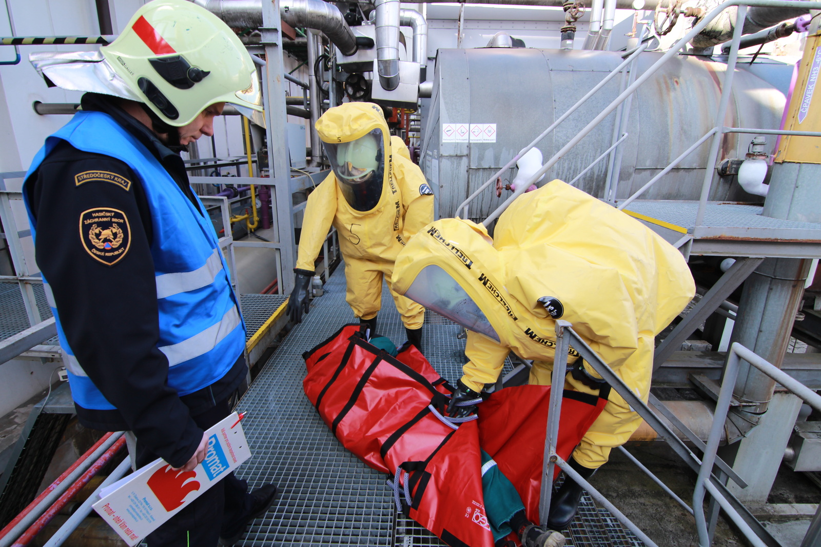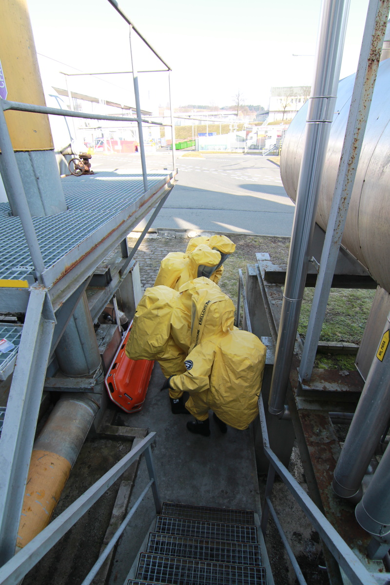 Hasiči ihned vytyčili nebezpečnou zónu a začali se stavbou dekontaminační linky. Současně s tím si už ostatní příslušníci navlékali ochranné přetlakové obleky, ve kterých následně strojovnu prozkoumali. Po chvilce hasiči nalezli pohřešovanou zraněnou osobu, kterou evakuovali do bezpečné zóny.