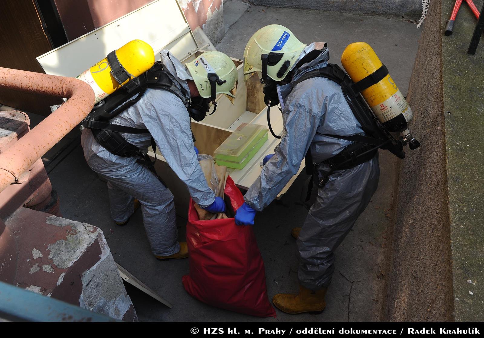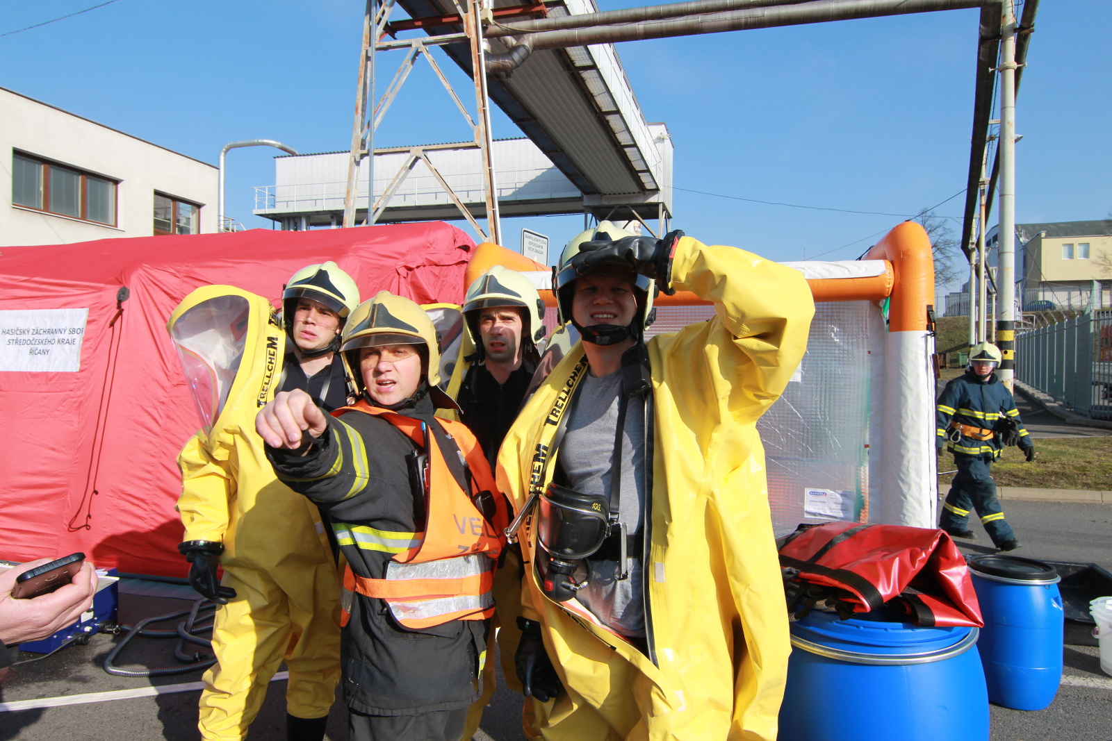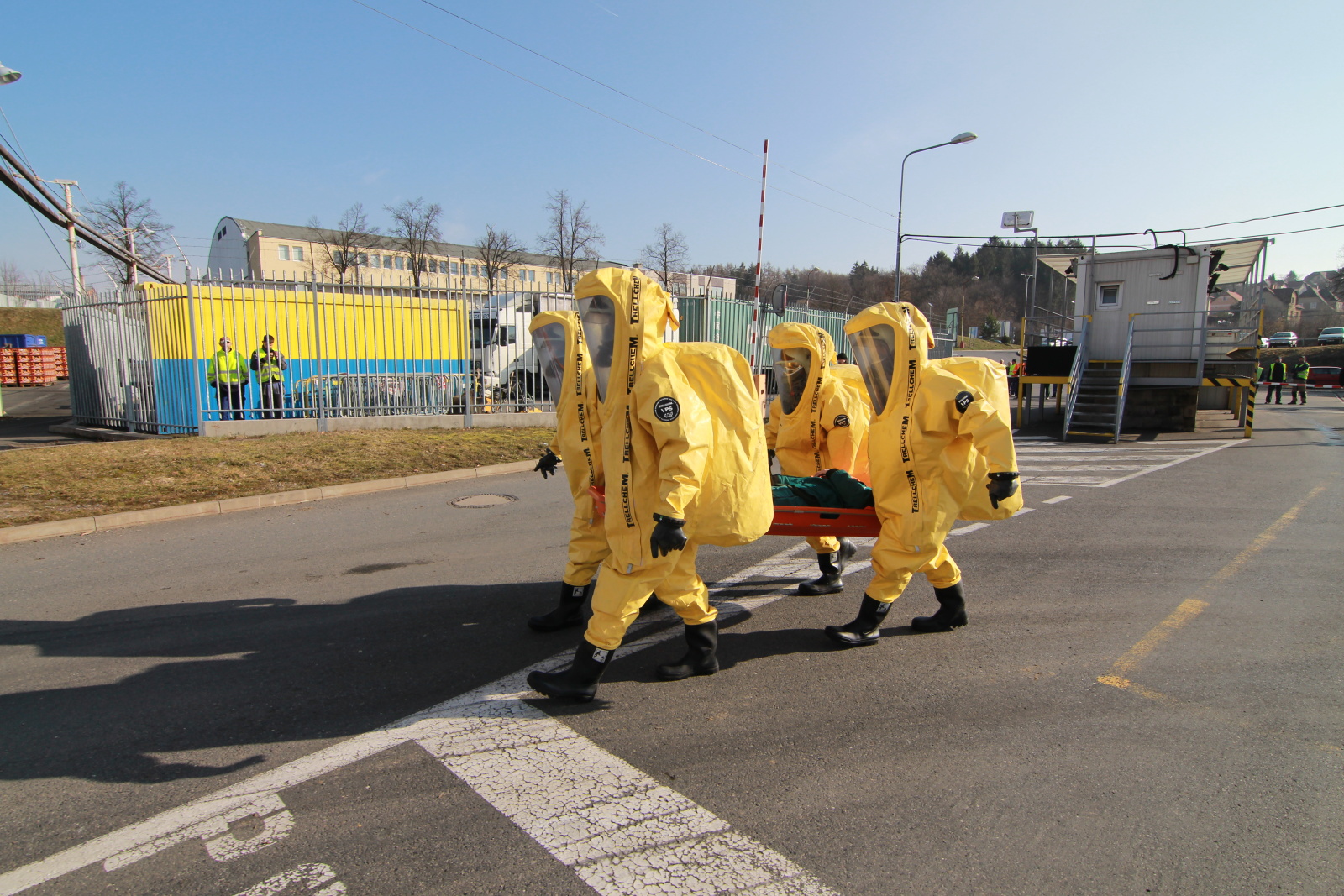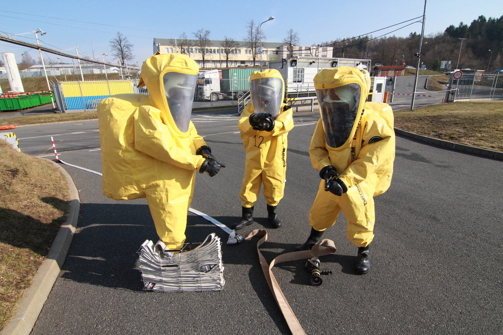 Hasiči ihned vytyčili nebezpečnou zónu a začali se stavbou dekontaminační linky. Současně s tím si už ostatní příslušníci navlékali ochranné přetlakové obleky, ve kterých následně strojovnu prozkoumali. Po chvilce hasiči nalezli pohřešovanou zraněnou osobu, kterou evakuovali do bezpečné zóny.