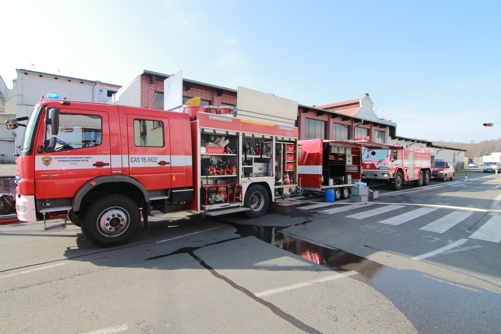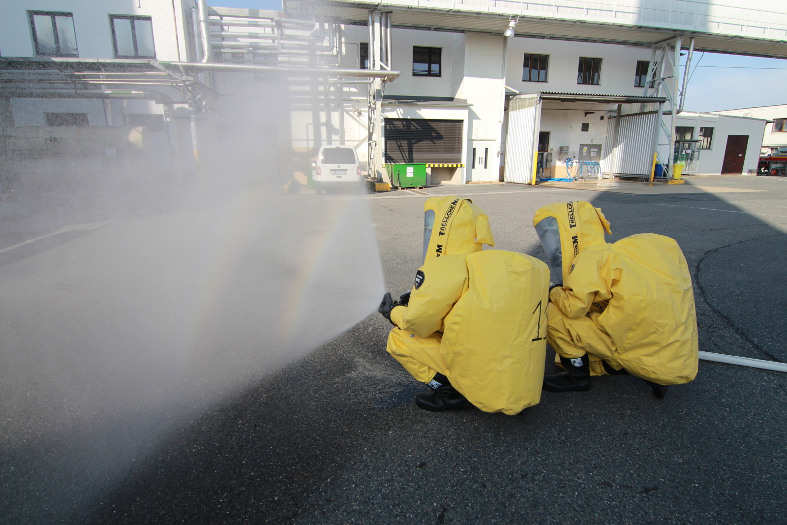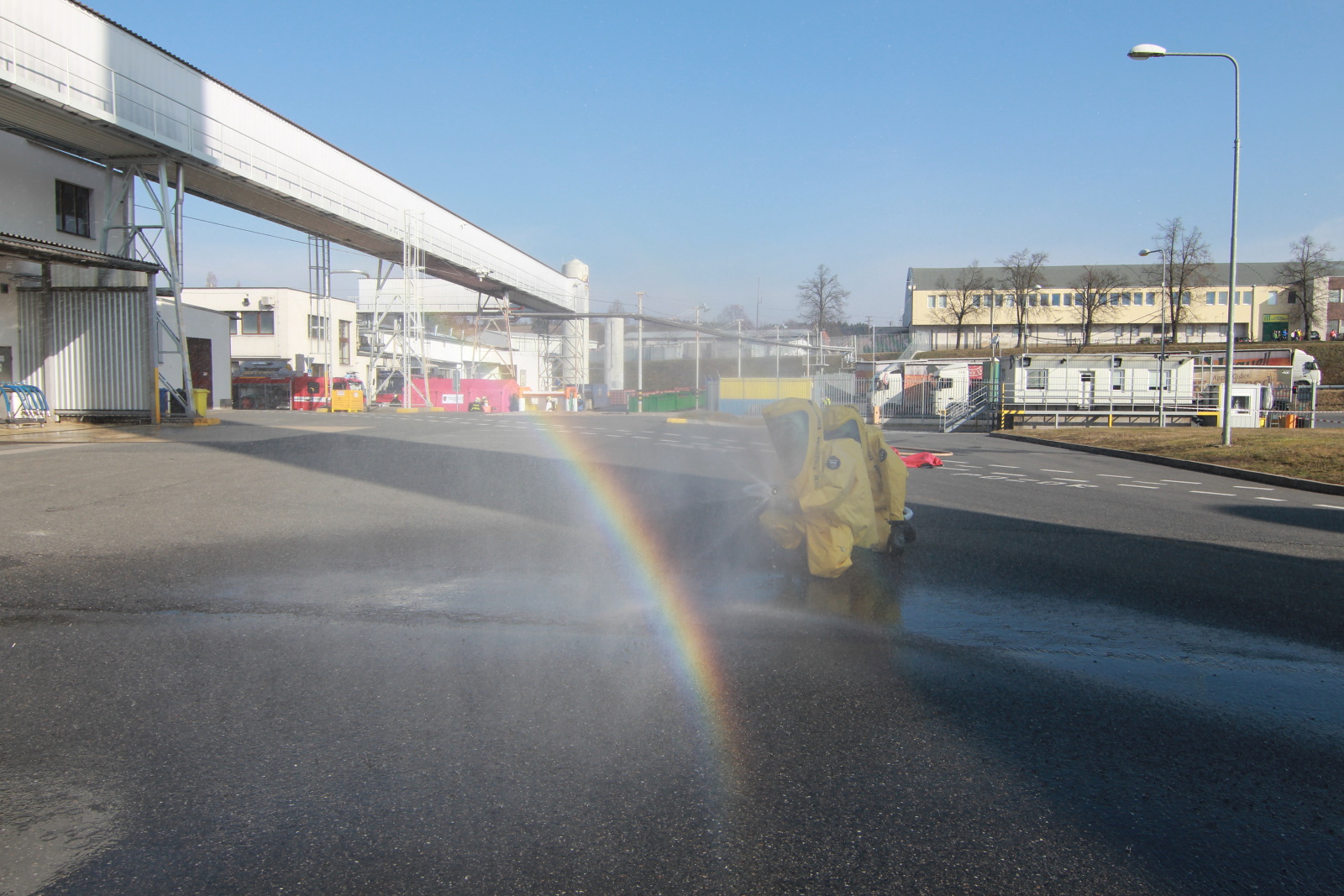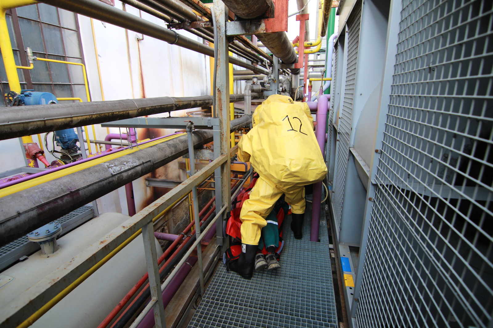 Hasiči ihned vytyčili nebezpečnou zónu a začali se stavbou dekontaminační linky. Současně s tím si už ostatní příslušníci navlékali ochranné přetlakové obleky, ve kterých následně strojovnu prozkoumali. Po chvilce hasiči nalezli pohřešovanou zraněnou osobu, kterou evakuovali do bezpečné zóny.