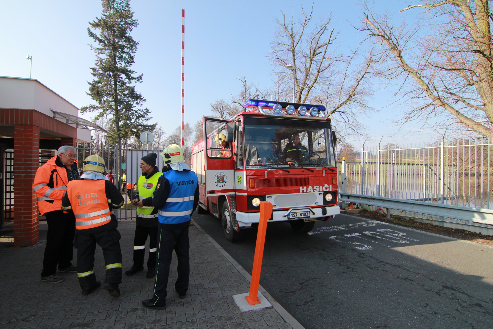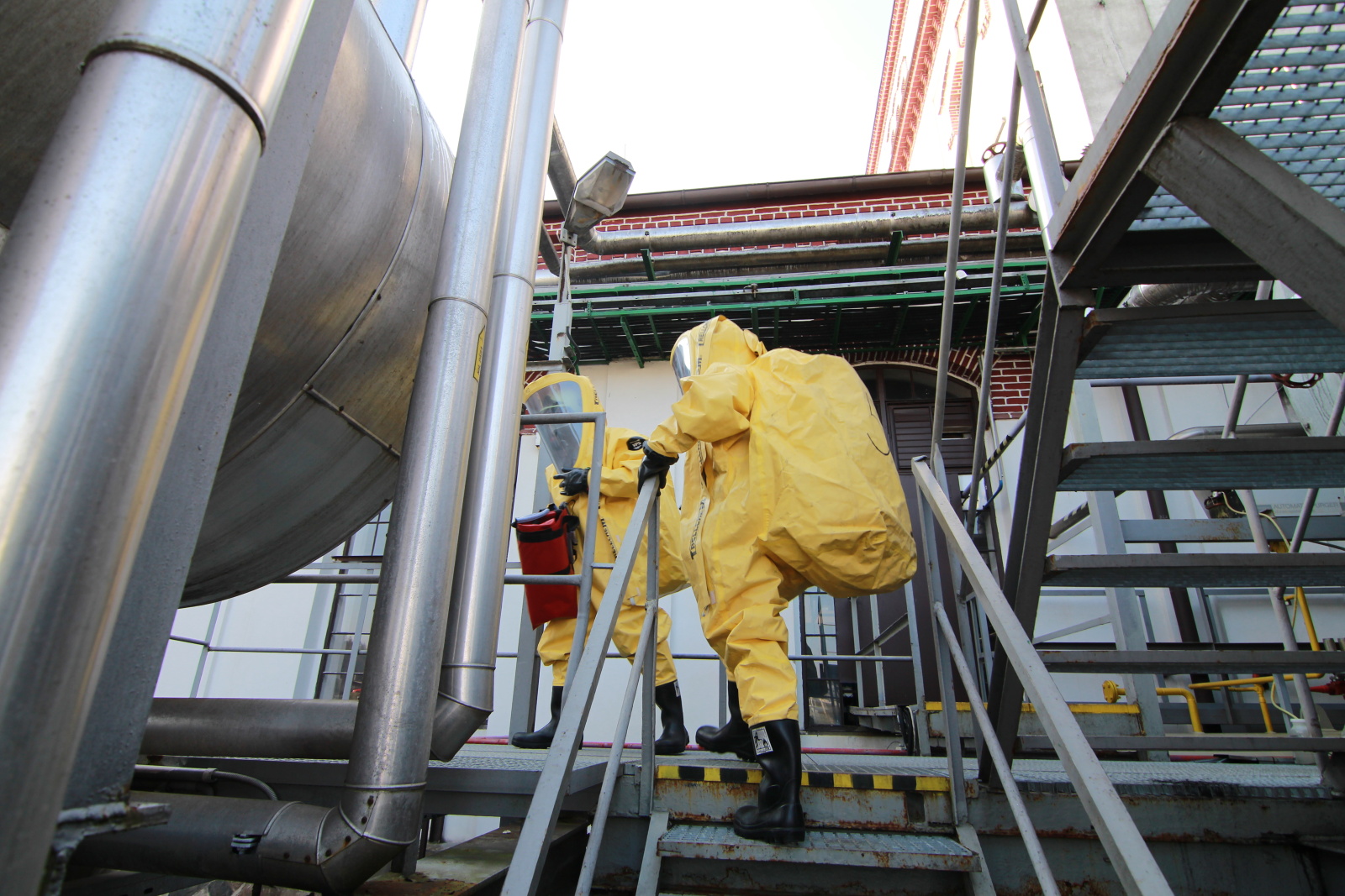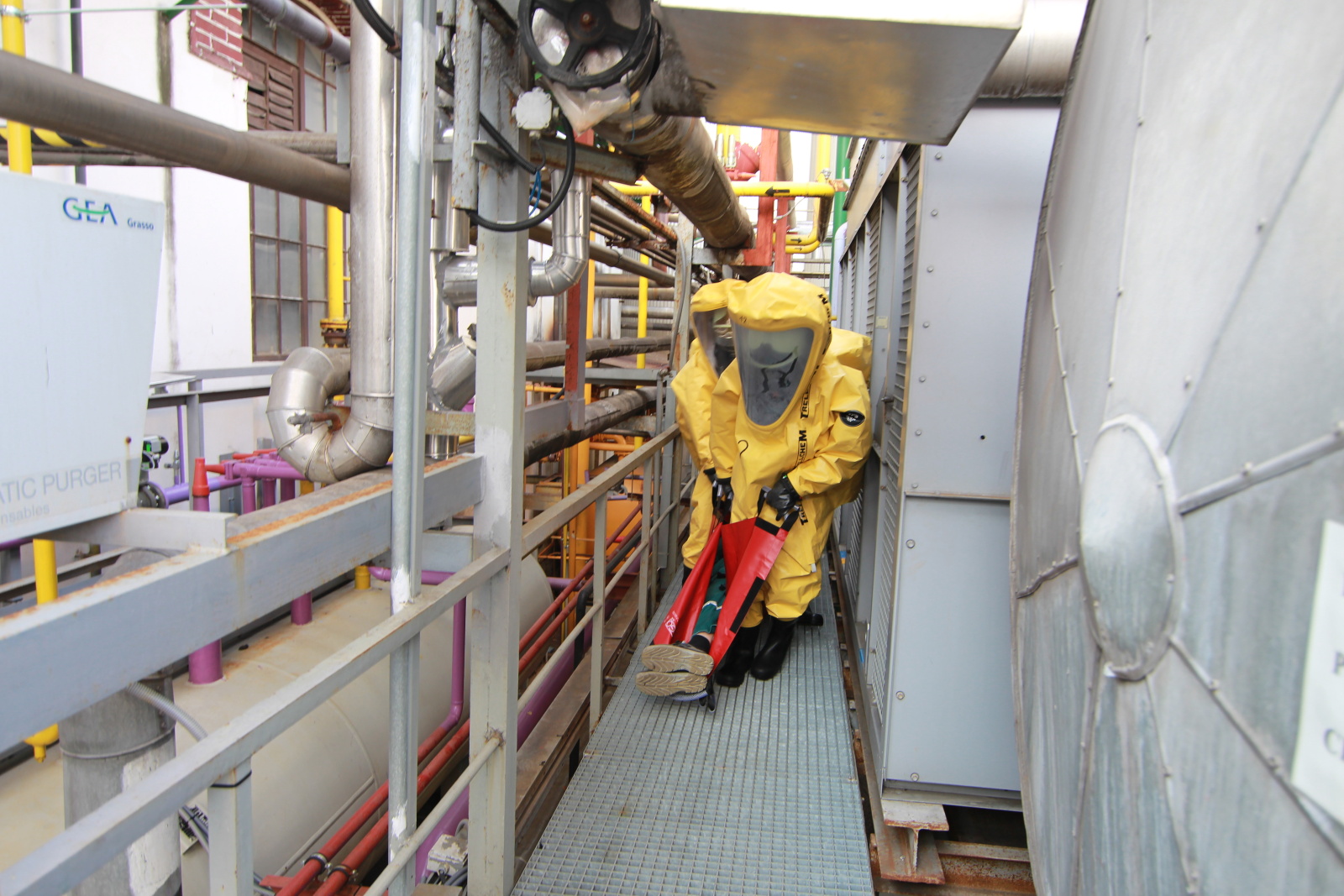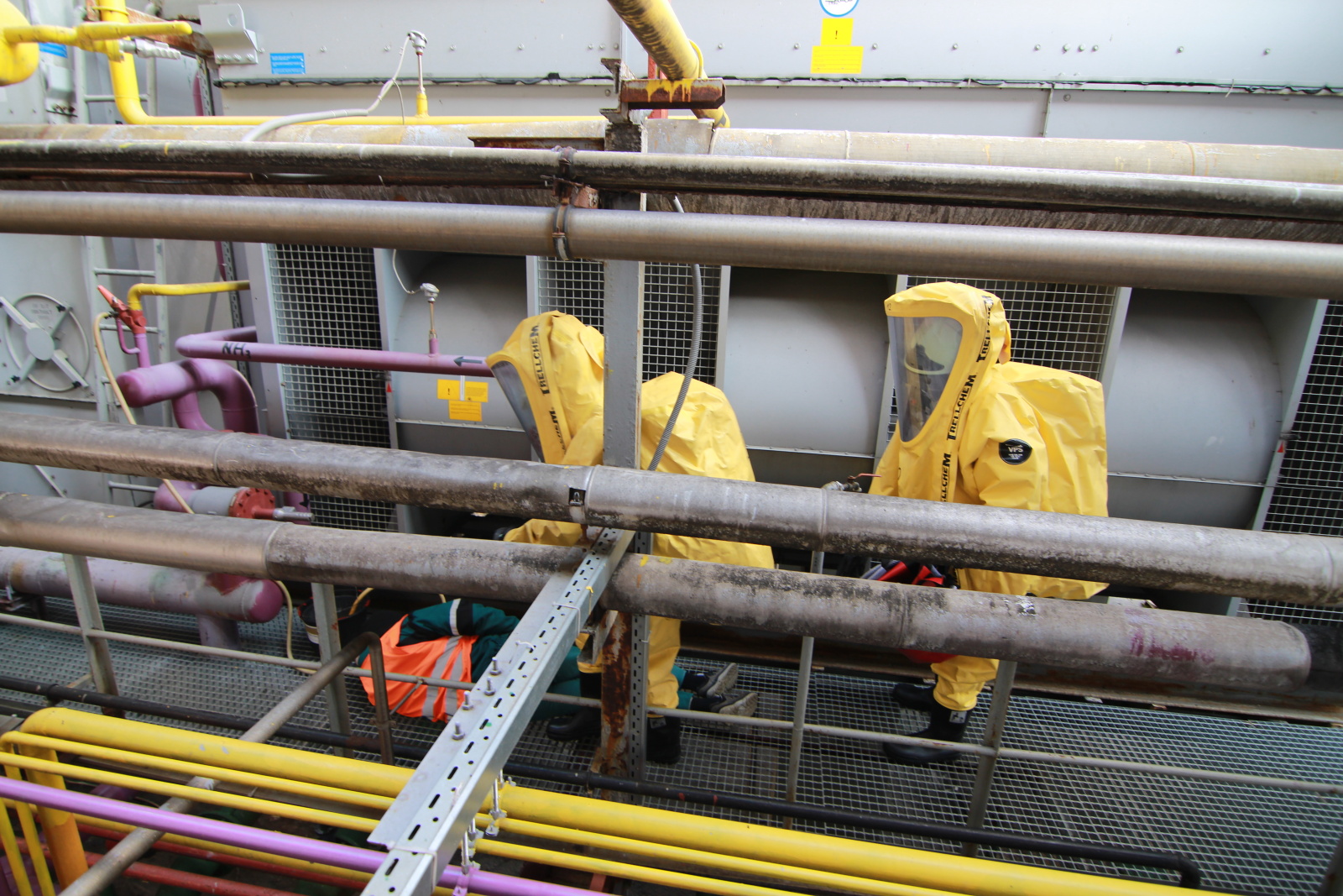 Hasiči ihned vytyčili nebezpečnou zónu a začali se stavbou dekontaminační linky. Současně s tím si už ostatní příslušníci navlékali ochranné přetlakové obleky, ve kterých následně strojovnu prozkoumali. Po chvilce hasiči nalezli pohřešovanou zraněnou osobu, kterou evakuovali do bezpečné zóny.