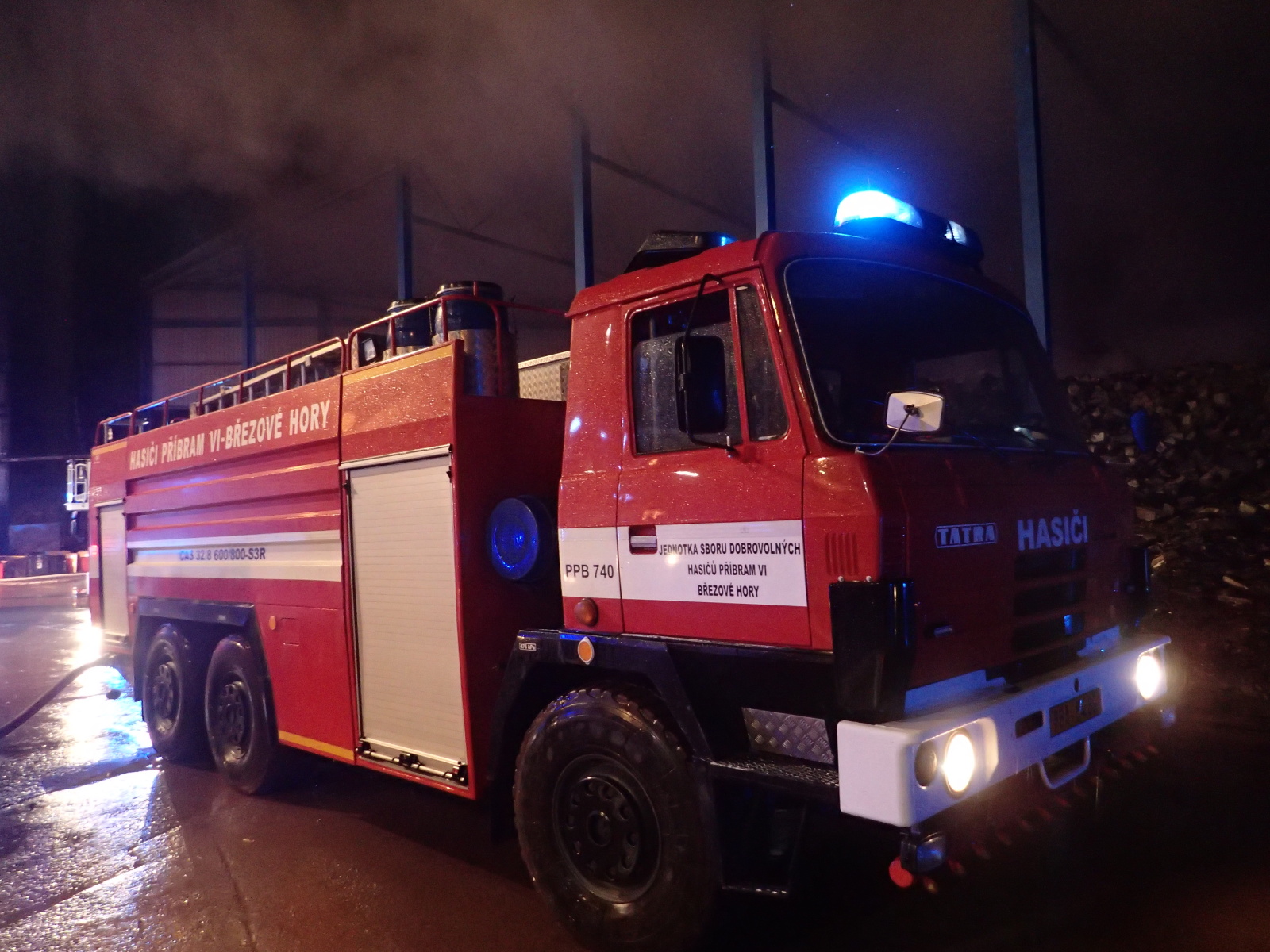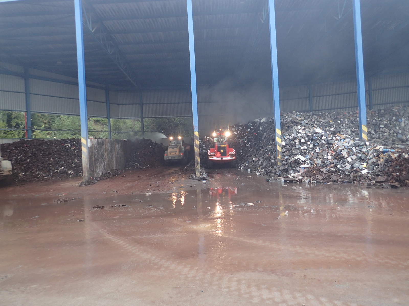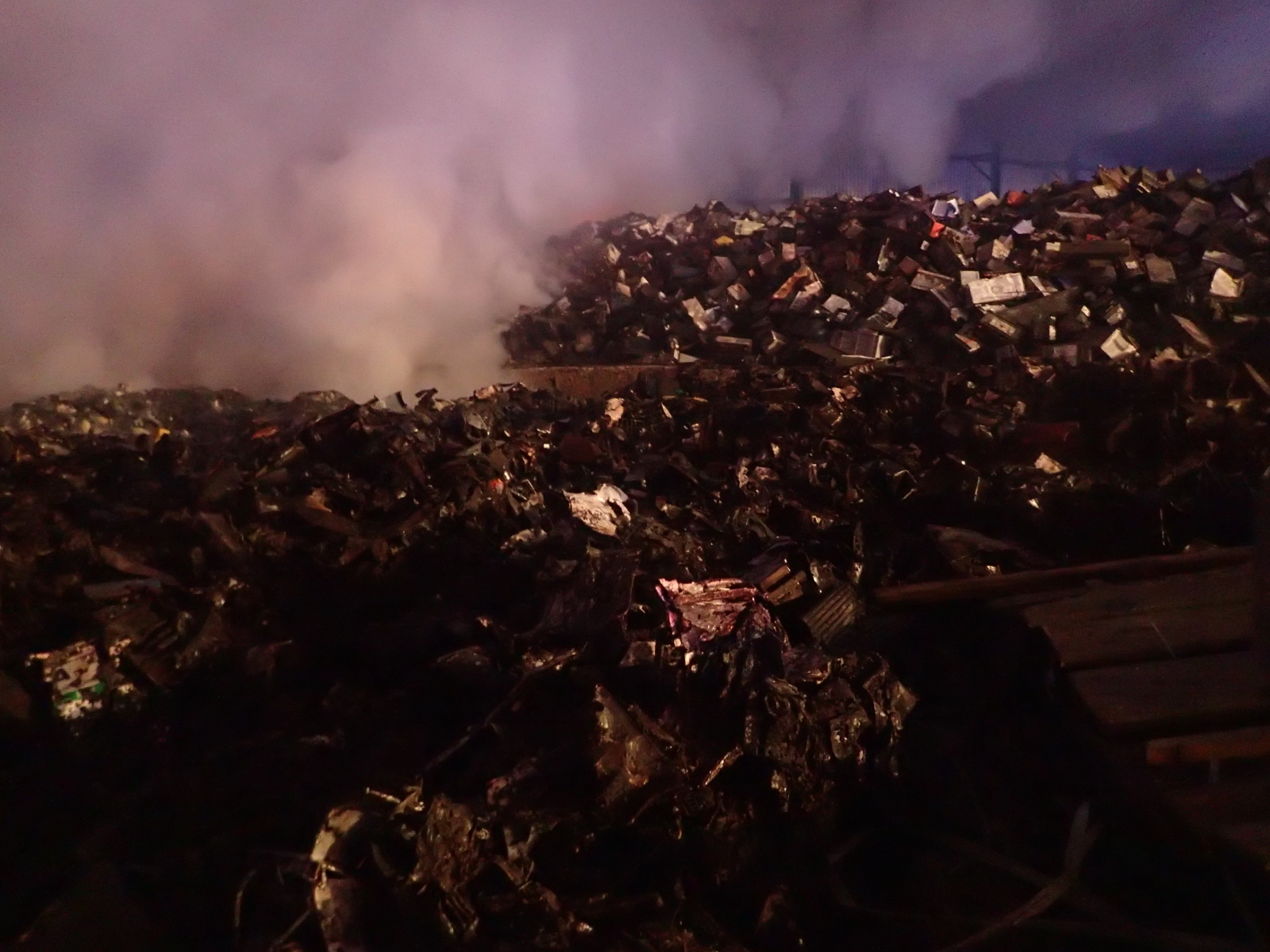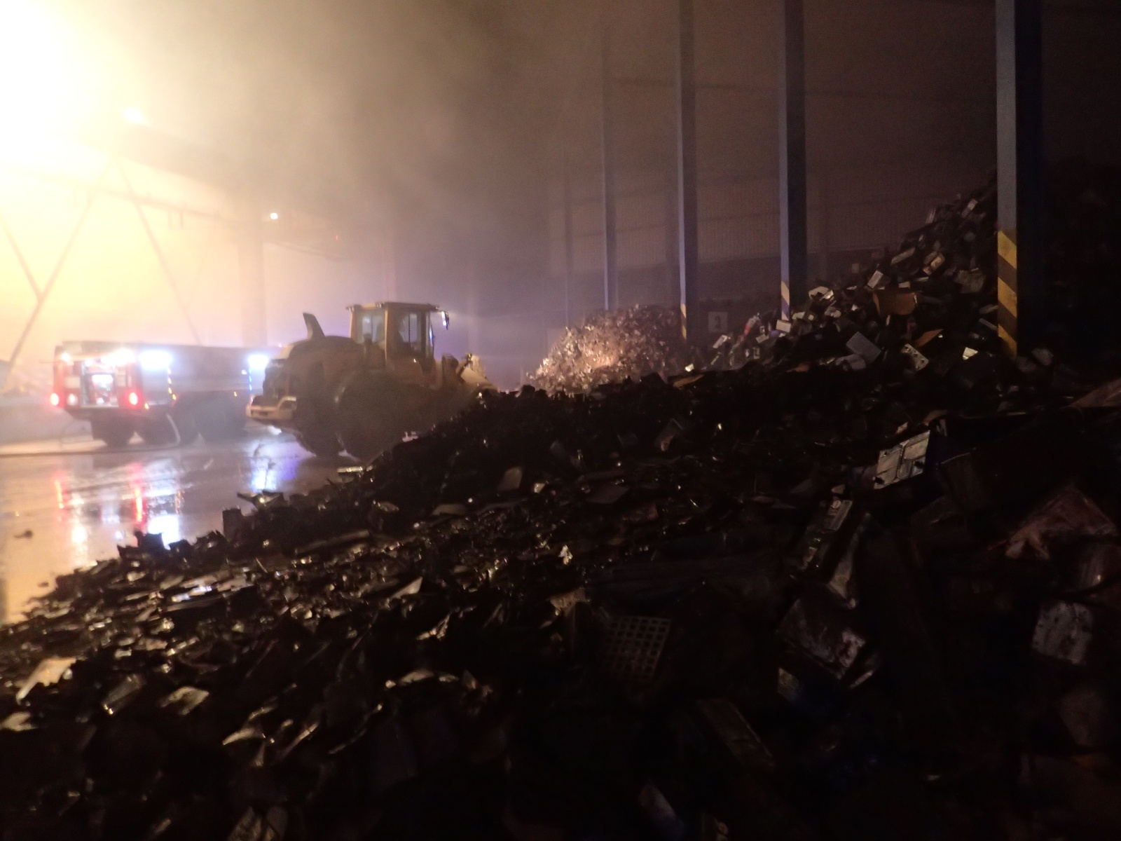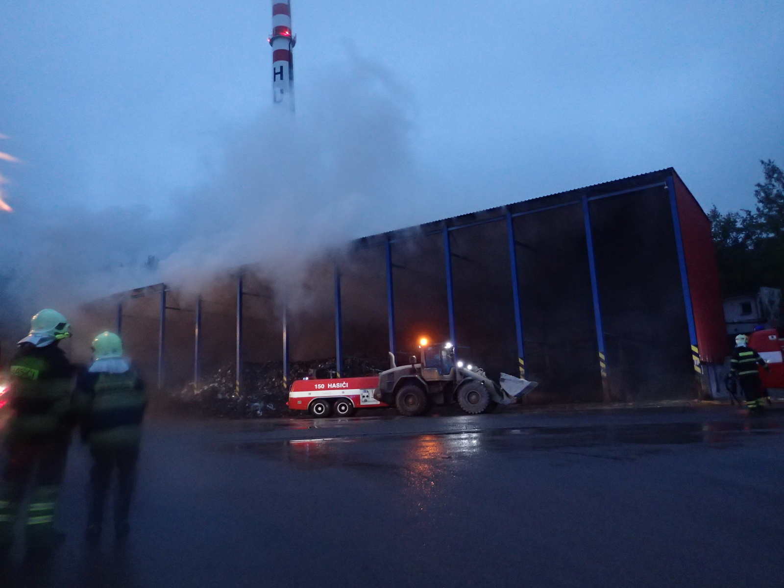 poplachu. Hasiči na místě zřídili čerpací stanoviště a zahájili hasební práce. Protože šlo o obrovskou hromadu, bylo zapotřebí začít s jejím postupným rozebíráním pomocí těžké techniky, vyvážením zasaženého materiálu a jeho dohašováním. Velitel zásahu tak požádal o vyslání speciálního nakladače JCB ze ZÚ HZS ČR ve Zbirohu, který už za hodinu dorazil na místo a ihned se plně zapojil do likvidačních prací.