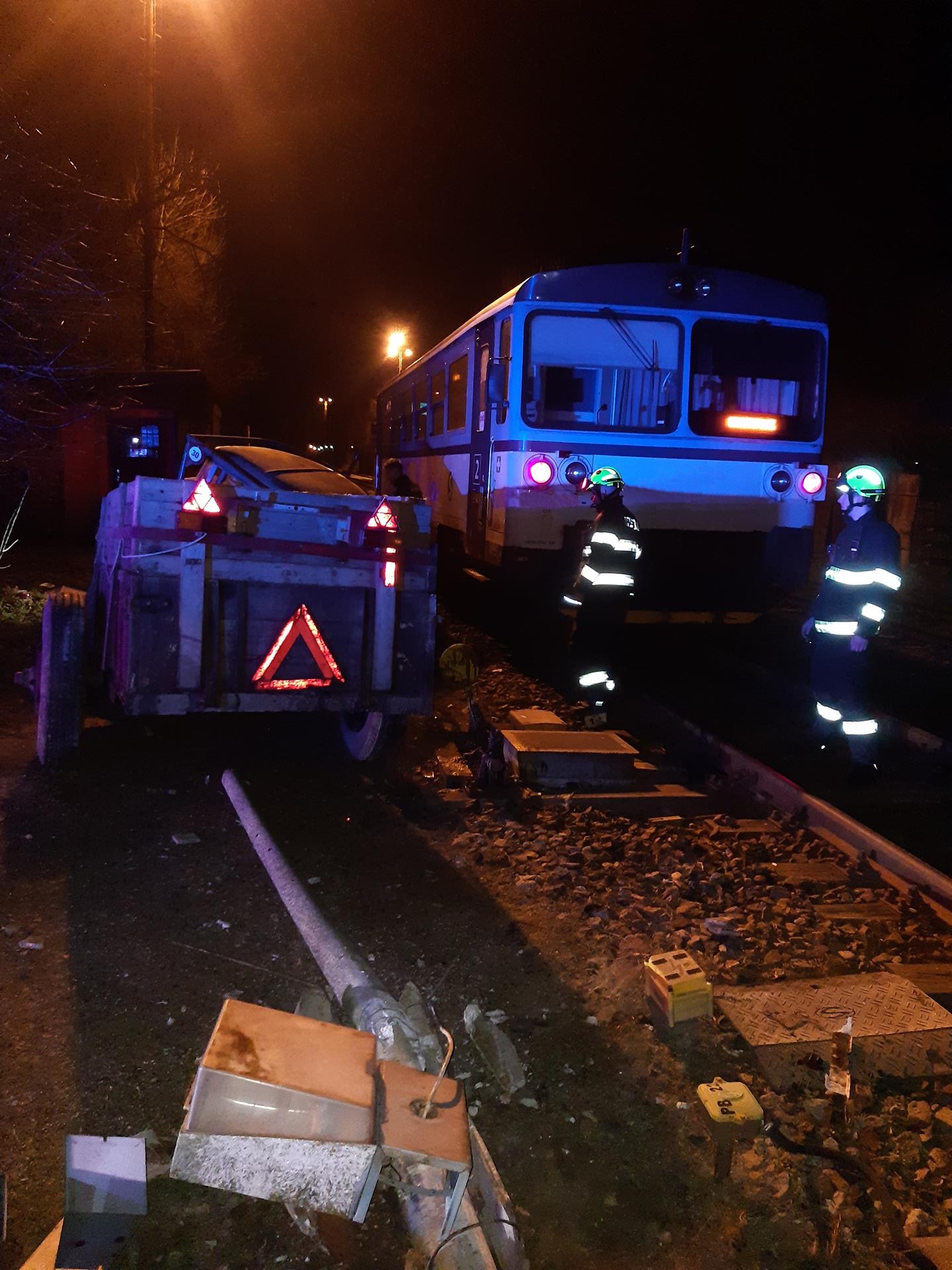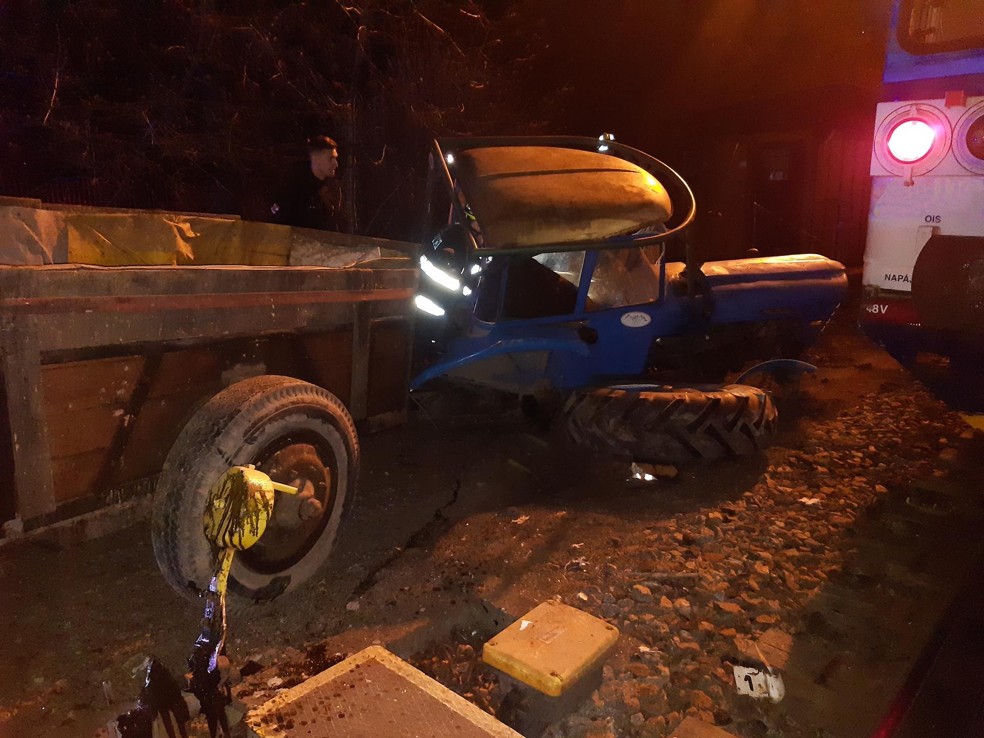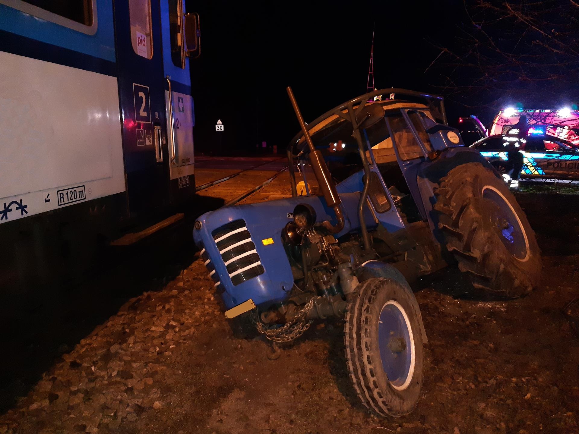 Traktor s malým vlekem byl po nárazu odhozen těsně vedle kolejí...