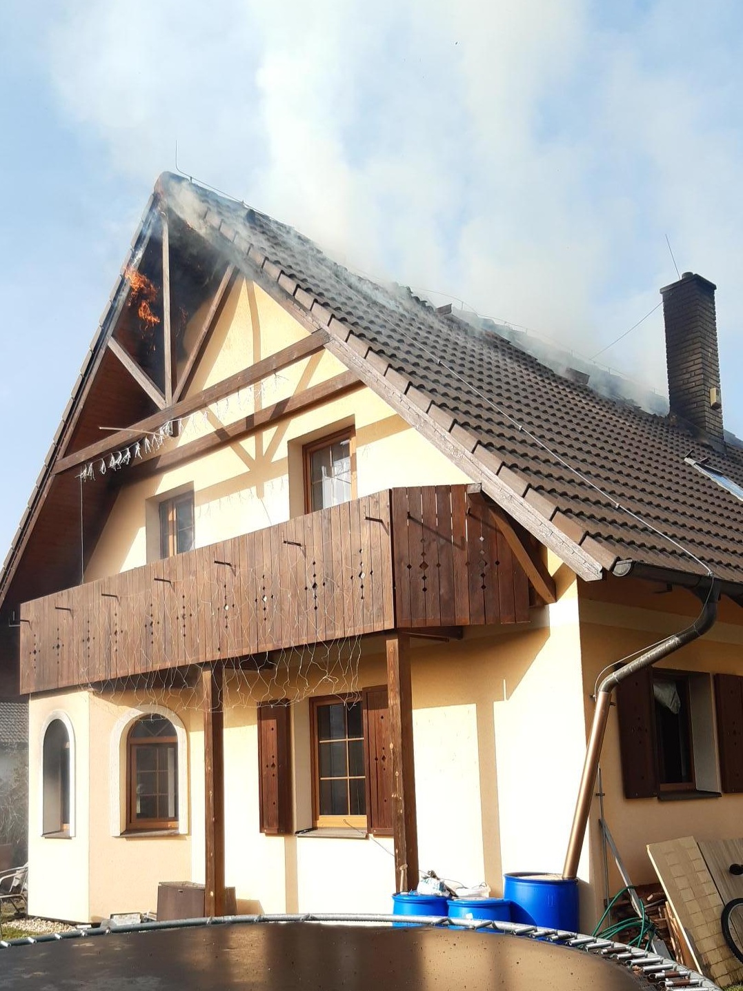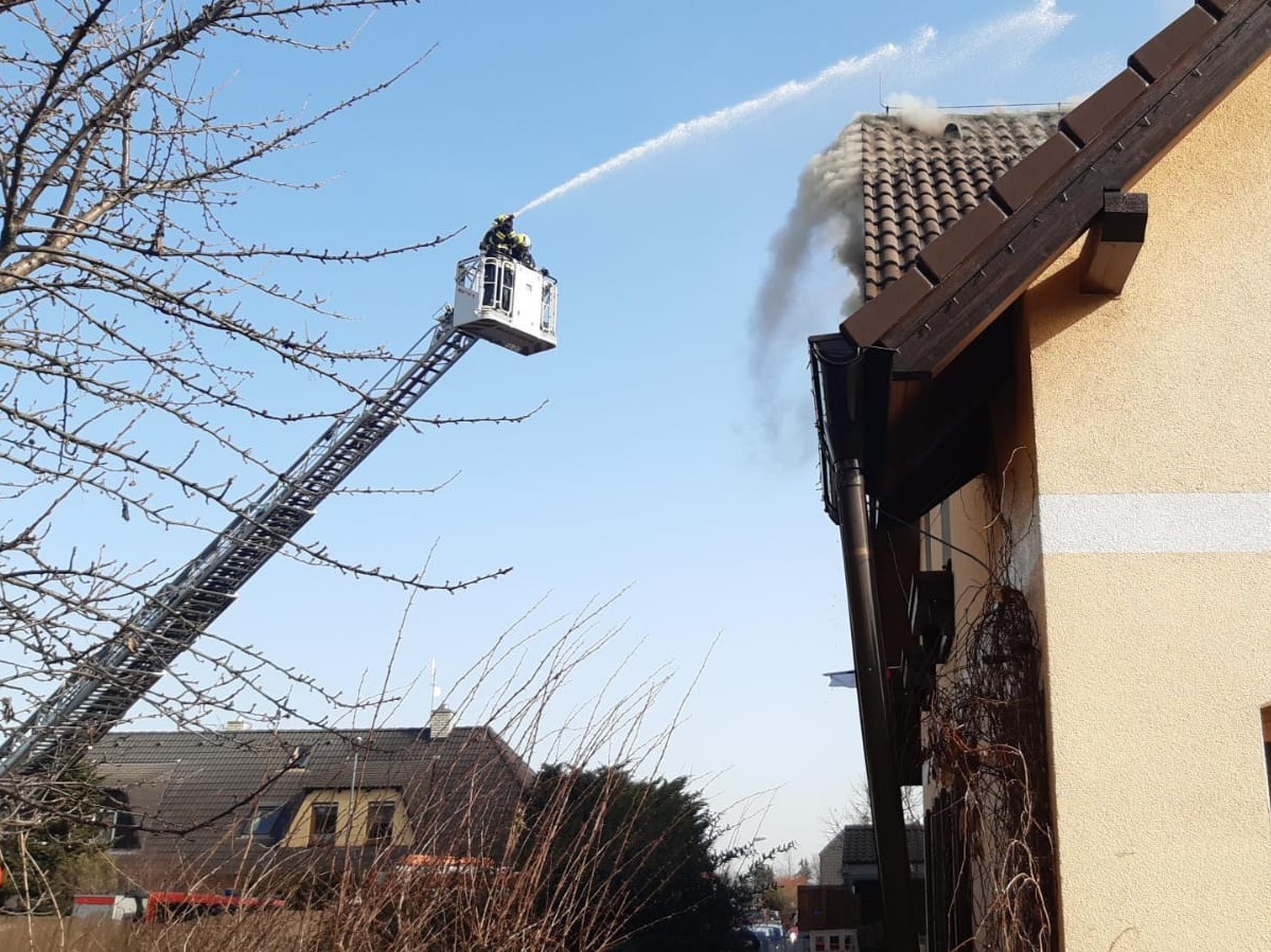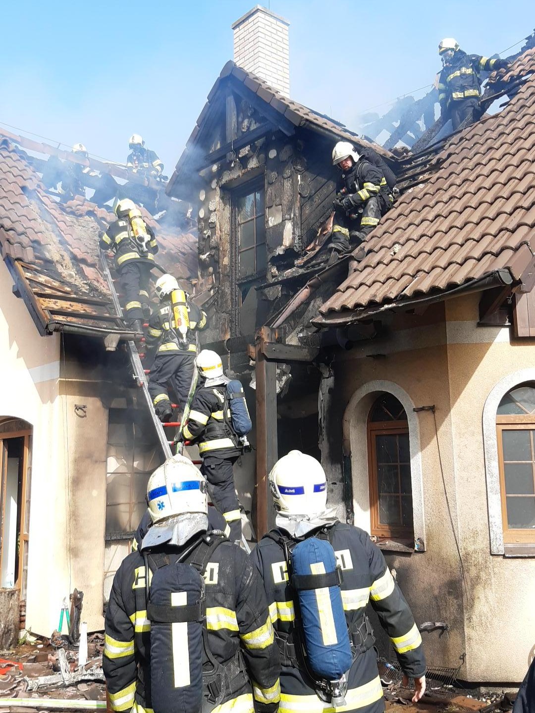 Při příjezdu na místo byl vidět hustý černý dým vycházející ze střechy rozlehlého rodinného domu. Velitel zásahu nechal okamžitě zvednout poplachový stupeň na druhý a povolat další jednotky. Současně zazněl požadavek o zálohování stanic pro případ dalšího výjezdu. Hasiči nejprve nasadili dopravní vedení, z kterého přes rozdělovač natáhli útočné vodní proudy. Další proud byl natažený z výškové techniky. Postupně se jednotky pokoušely dostat oheň pod kontrolu pěti vodními proudy. Z důvodu silného zakouření byl zásah prováděn v dýchací technice. Z nastavovacích žebříků pak hasiči udělali do střešní krytiny několik otvorů, aby bylo hašení efektivnější.