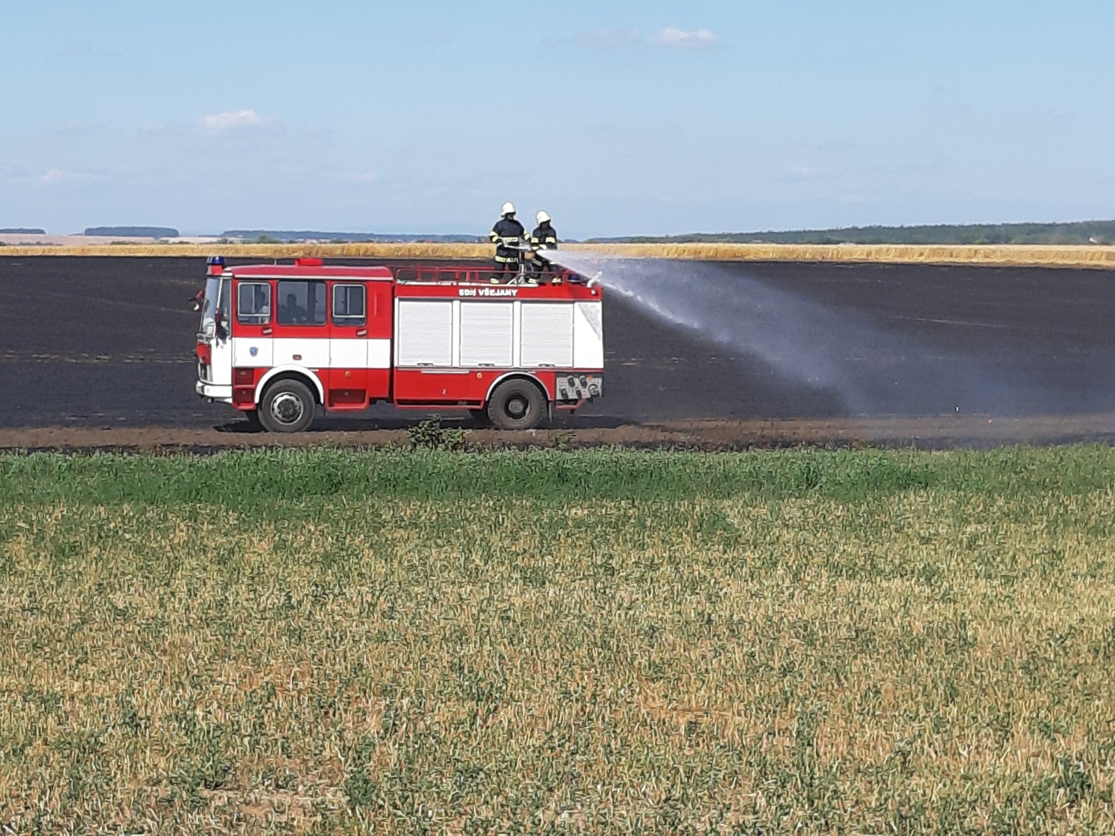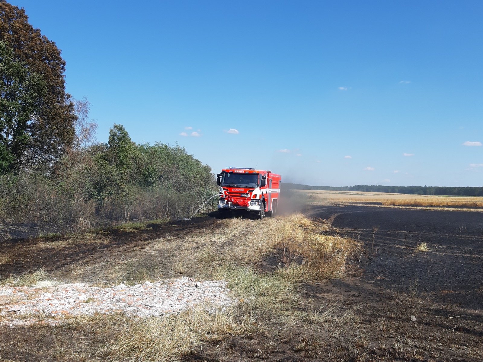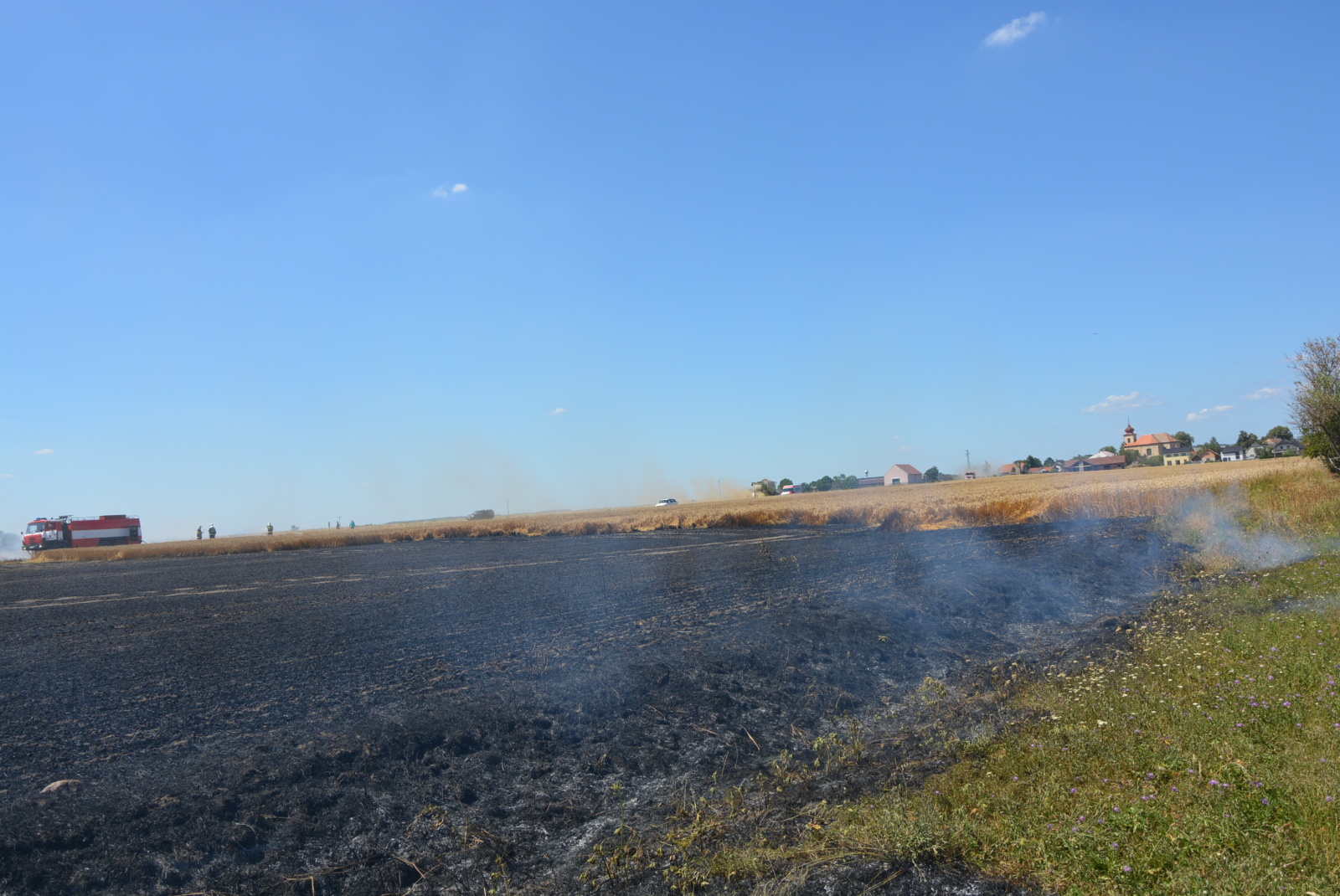 Po příjezdu prvních jednotek na místo bylo zjištěno, že se požár vlivem silného větru rychle rozšiřuje a už zasáhl i část dalšího pole s neposekanou pšenicí. Protože panovala obava, že plameny přeskočí na les, který se nacházel na konci hořícího pole, vyhlásil velitel zásahu třetí poplachový stupeň, a k požáru tak vyrazily další jednotky. Nakonec se jich u události sjelo dvanáct se třinácti cisternami.