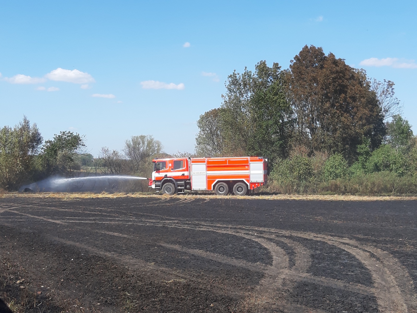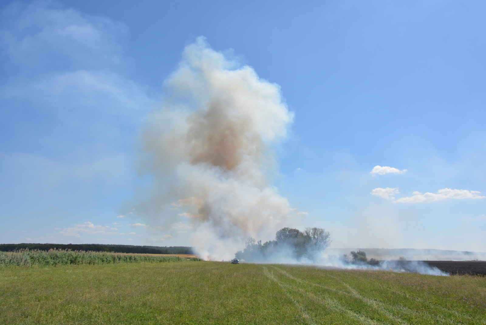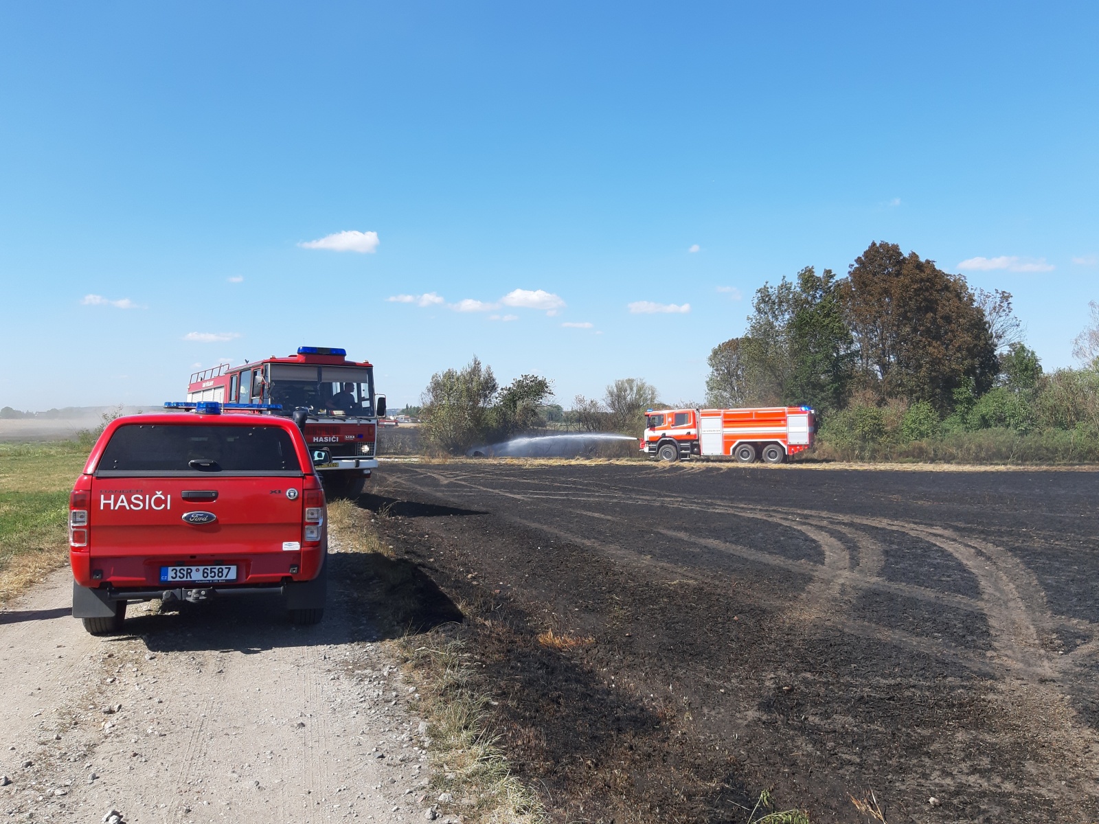 Po příjezdu prvních jednotek na místo bylo zjištěno, že se požár vlivem silného větru rychle rozšiřuje a už zasáhl i část dalšího pole s neposekanou pšenicí. Protože panovala obava, že plameny přeskočí na les, který se nacházel na konci hořícího pole, vyhlásil velitel zásahu třetí poplachový stupeň, a k požáru tak vyrazily další jednotky. Nakonec se jich u události sjelo dvanáct se třinácti cisternami.