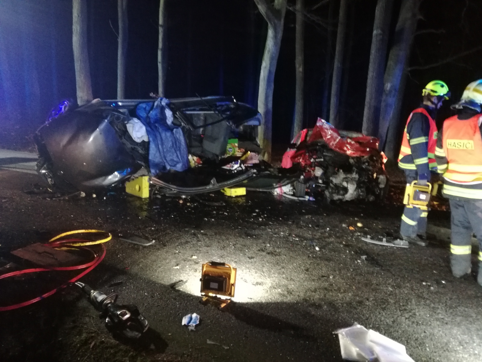 Po silném nárazu skončilo jedno ze zdeformovaných aut ležet na boku uprostřed vozovky a uvnitř vozidla zůstaly zaklíněné tři těžce zraněné osoby. Druhý vůz se dvěma zaklíněnými osobami byl po nárazu odhozen částečně mimo vozovku.