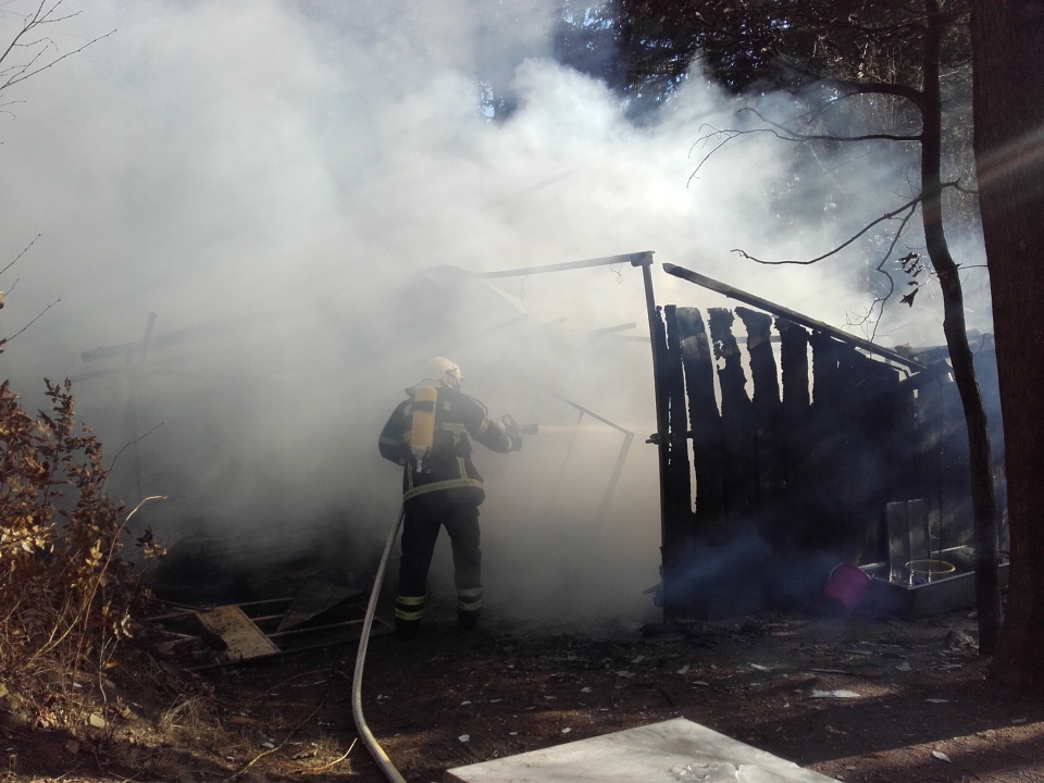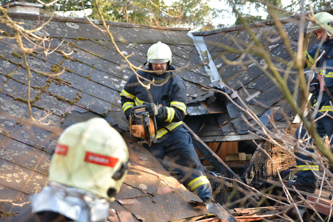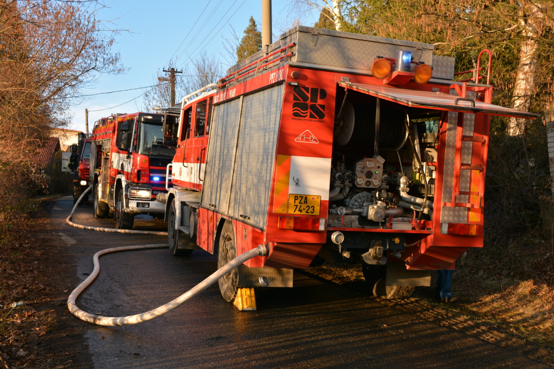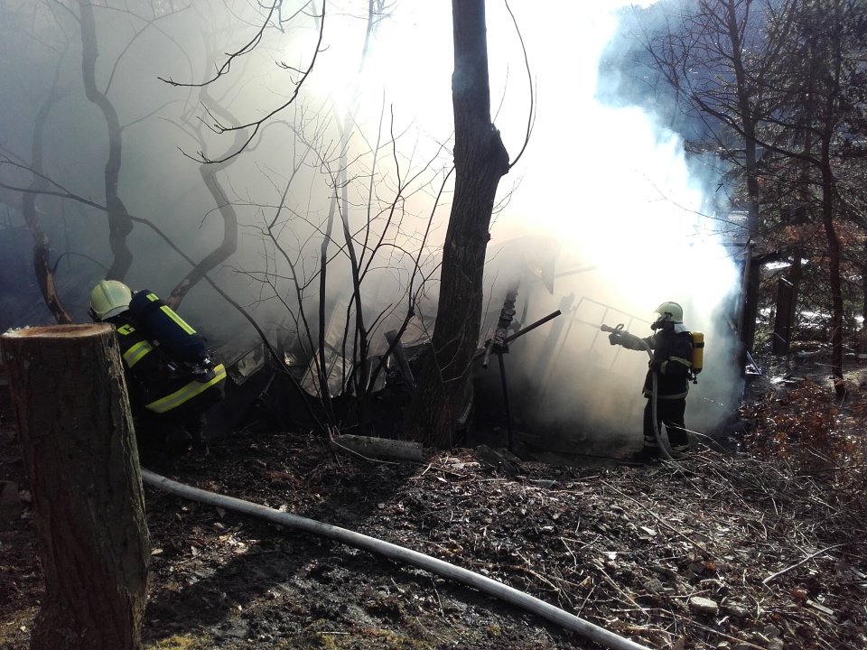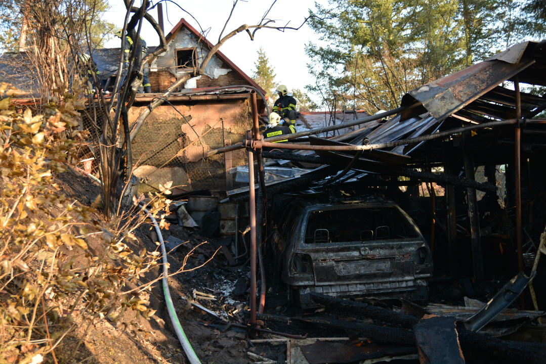 První jednotka vyjela za necelou minutu od vyhlášení poplachu a na místě byla za osm minut. Při příjezdu byl zjištěn rozvinutý požár garážového přístřešku s osobním automobilem uvnitř, který se šířil na střechu přilehlého objektu. Hasiči v dýchací technice zasahovali pomocí tří vodních proudů a podařilo se jim zabránit rozvoji požáru, který přeskočil na část střechy vedlejší chaty.