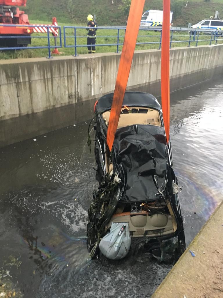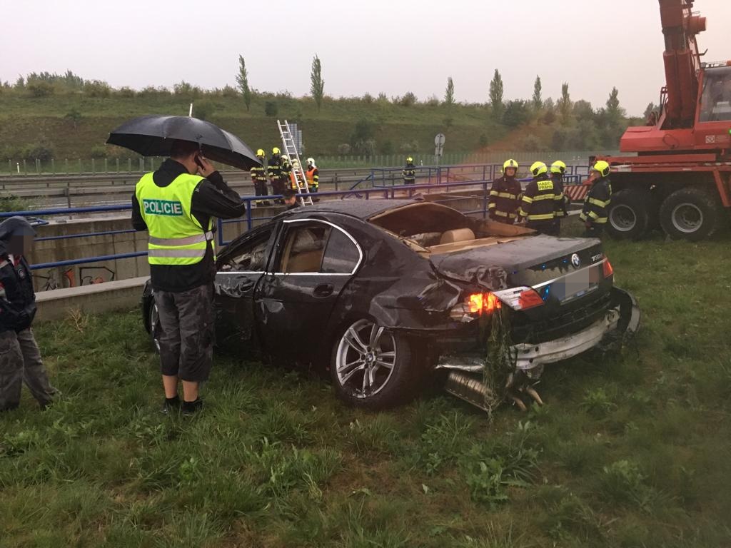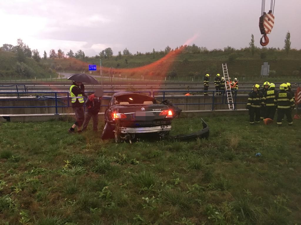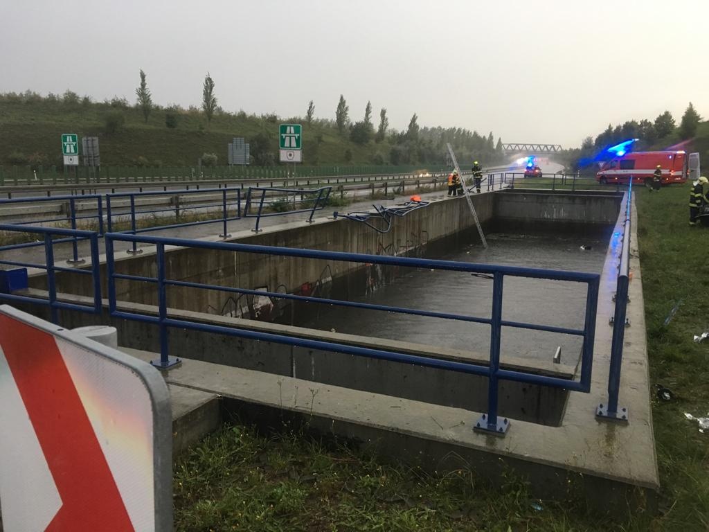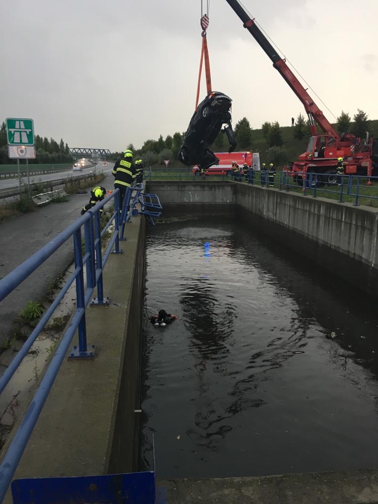 Podle oznamovatele vozidlo vyletělo z dálnice, přerazilo zábradlí a střechou dolů spadlo do retenční nádrže, ve které byly asi dva metry vody. Shodou okolností okolo právě projíždělo reprezentační družstvo HZS Středočeského kraje, které se vracelo z víkendového Mistrovství ČR v požárním sportu. Hasiči neváhali ani minutu a ještě s několika kolemjedoucími skočili do nádrže a vytáhli osoby, které zůstaly v kabině zaklíněné. Vozidlo bylo nutné ve vodě otočit a nadlehčovat, aby jedna osoba, kterou se nedařilo vyprostit, měla hlavu nad vodou. Mezitím se hasiči dostali do vozu a podařilo se jim uvolnit opěradlo, čím uvězněnou osobu uvolnili a následně vyndali i ven z vody.