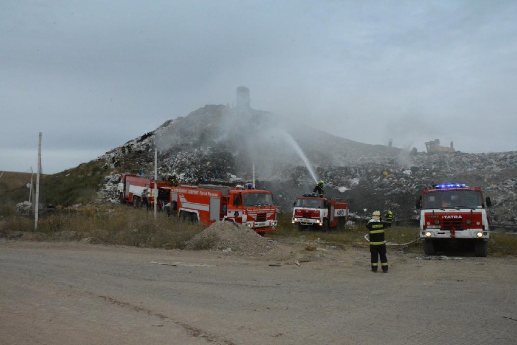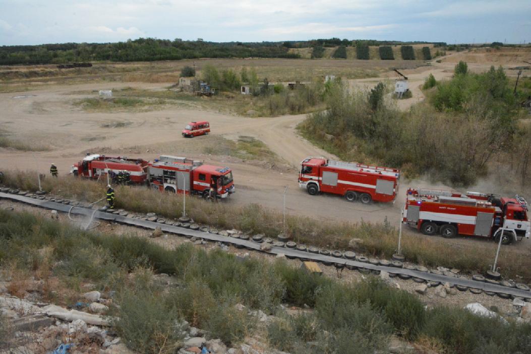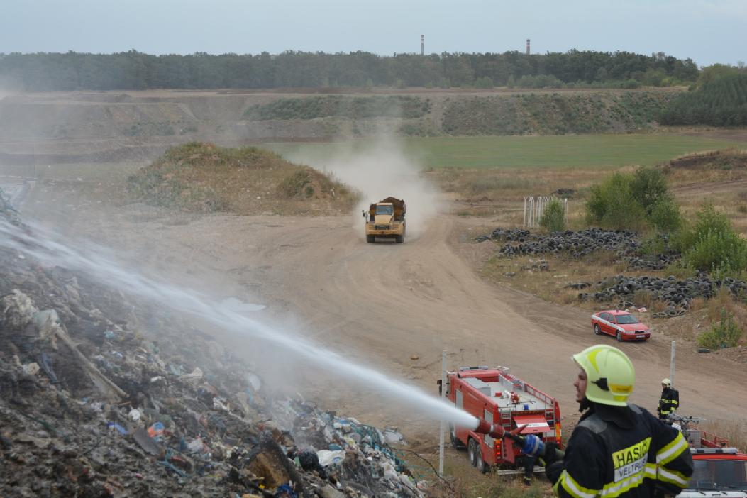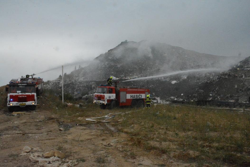 Po příjezdu byl zjištěn rozvinutý požár na okraji skládky v příkrém svahu. Velitel zásahu vyhlásil druhý stupeň poplachu a nechal na místo povolat dalších 10 cisteren. Kyvadlová doprava vody byla zajištěna z centrálního tankoviště ropy v katastru obce Nelahozeves. Hašení probíhalo pomocí dvou proudů „C“ a dvou lafetových proudnic z CAS 32. Zaměstnanci skládky spolupracovali s velitelem zásahu, těžkou technikou dováželi zeminu a uhašené části zahrnovali.