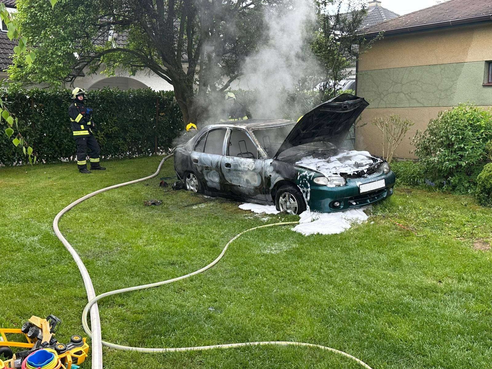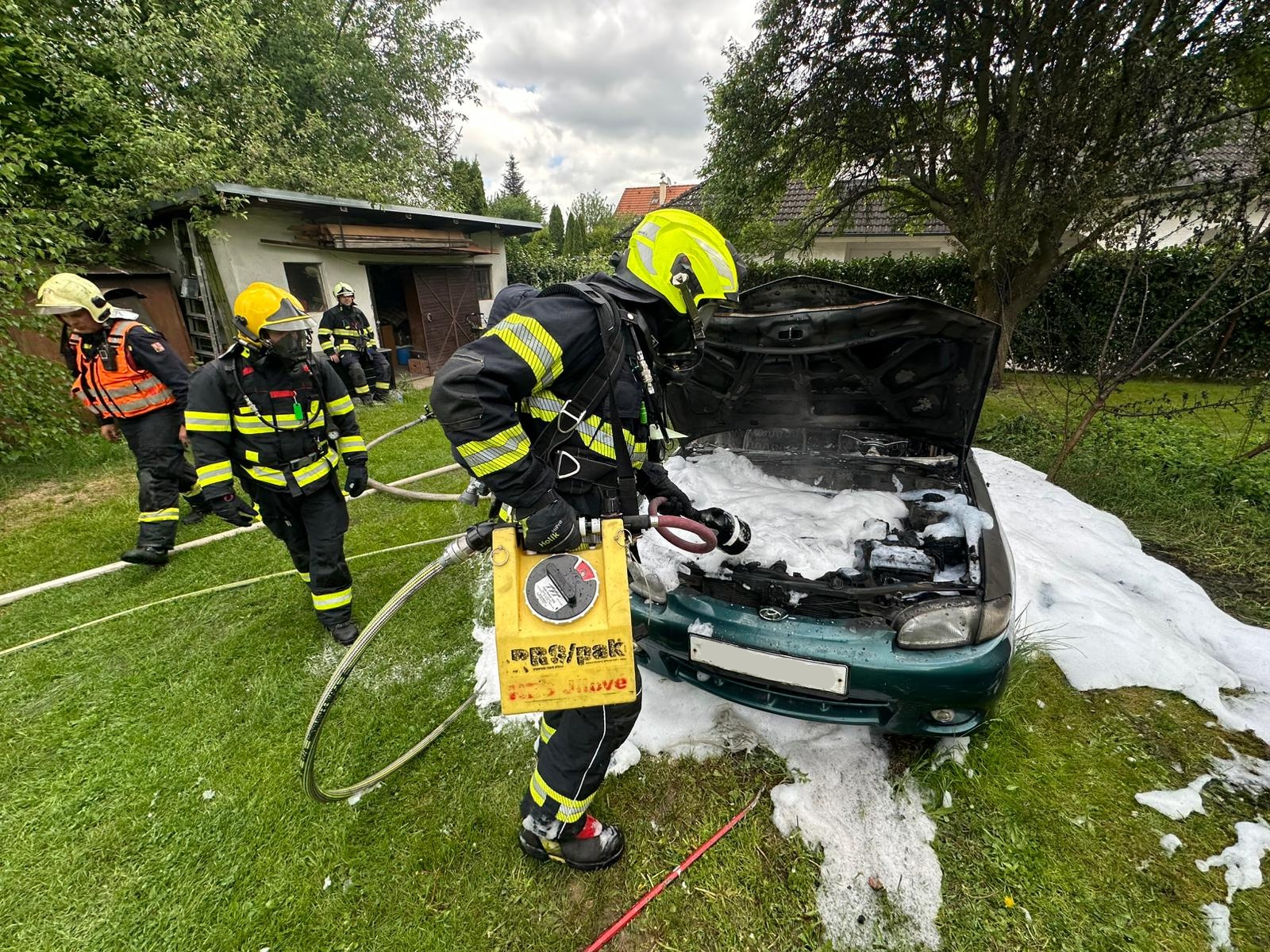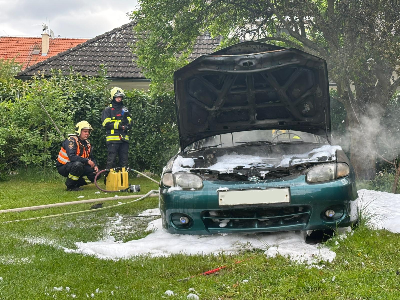 Hustá pěna rychle pokryla zbytky hořícího vozu. V 11:31 byl požár lokalizován – to znamená, že se dál nešířil. A jen o pět minut později byl zcela zlikvidován.