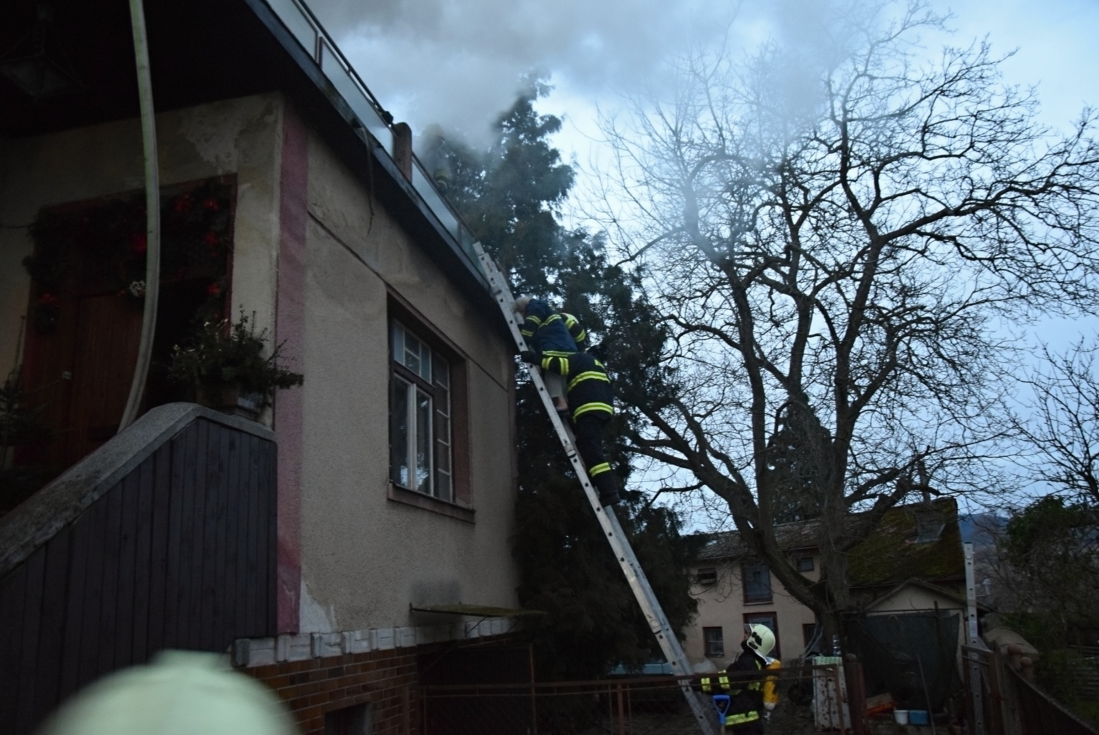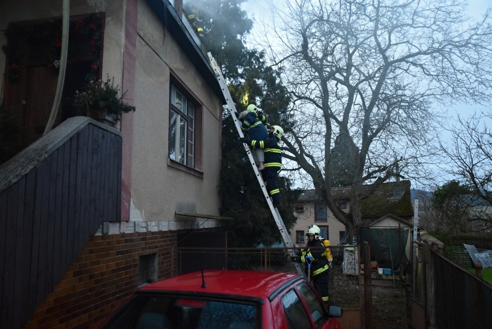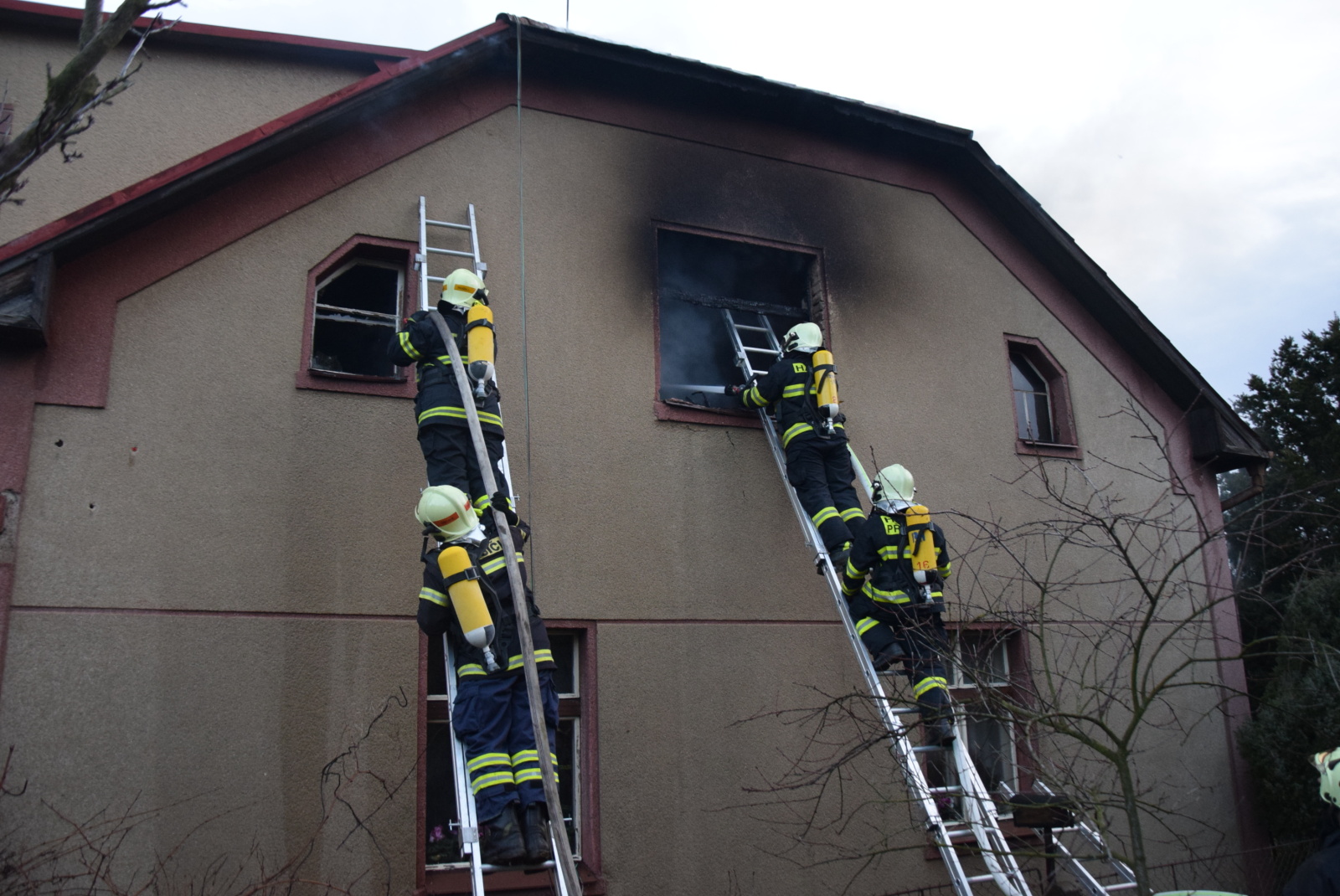 Při příjezdu první jednotky na místo už z oken v prvním patře šlehaly několikametrové plameny a v nebezpečí byla žena, které se nepodařilo včas sejít do přízemí a objekt opustit. Protože k domu nebylo možné přistavit zmíněnou výškovou techniku, zachránili hasiči majitelku domu z terasy po nastavovacím žebříku. Následně ženu předali do péče posádce zdravotnické záchranné služby, která ji převezla s podezřením na intoxikaci zplodinami hoření do příbramské nemocnice.