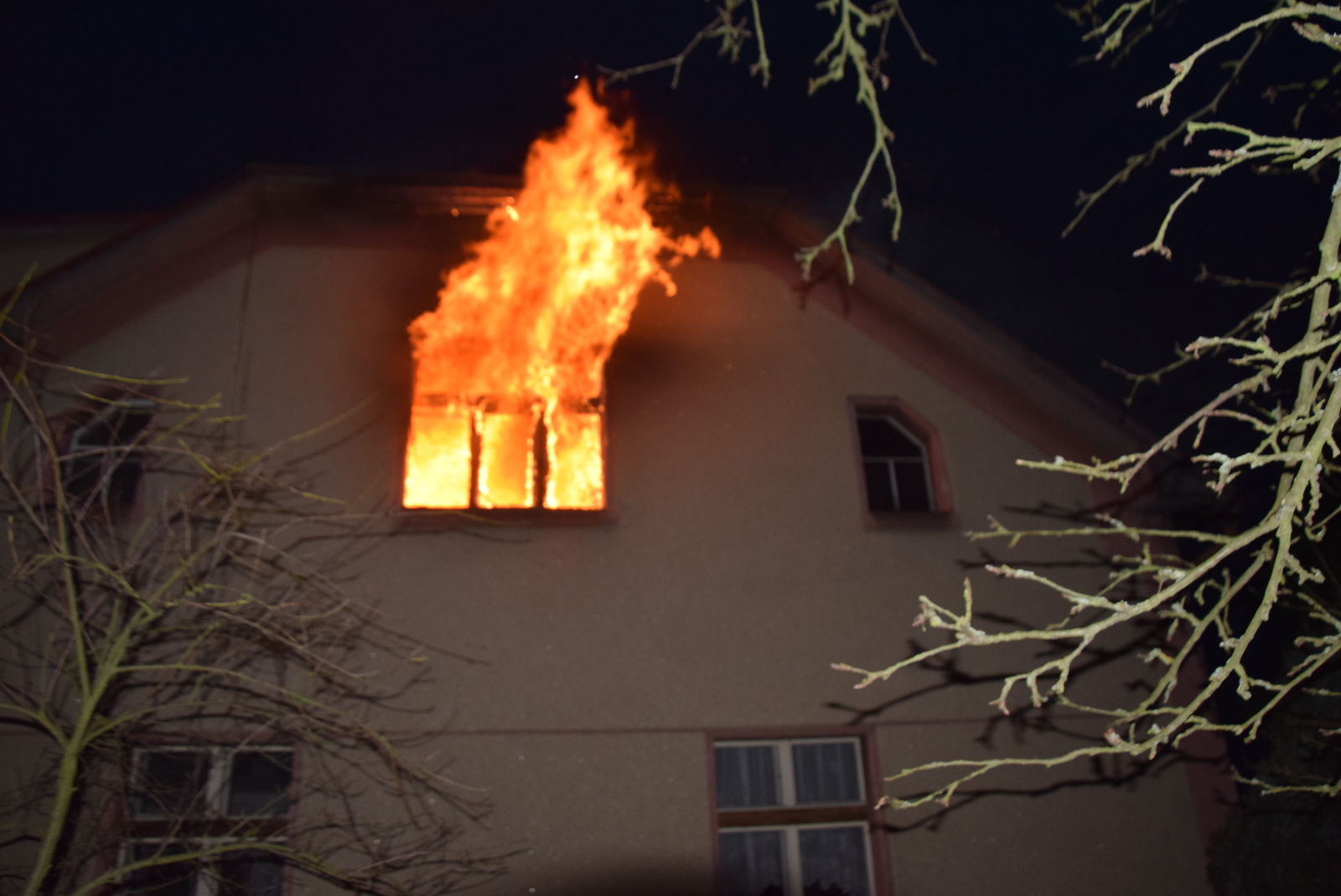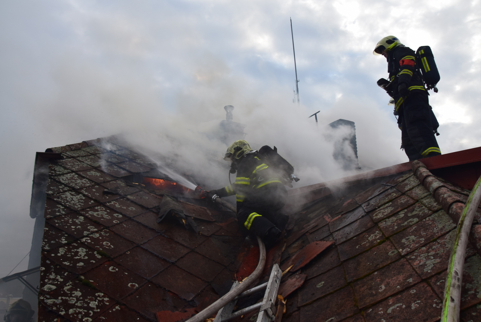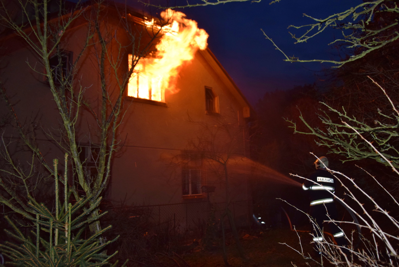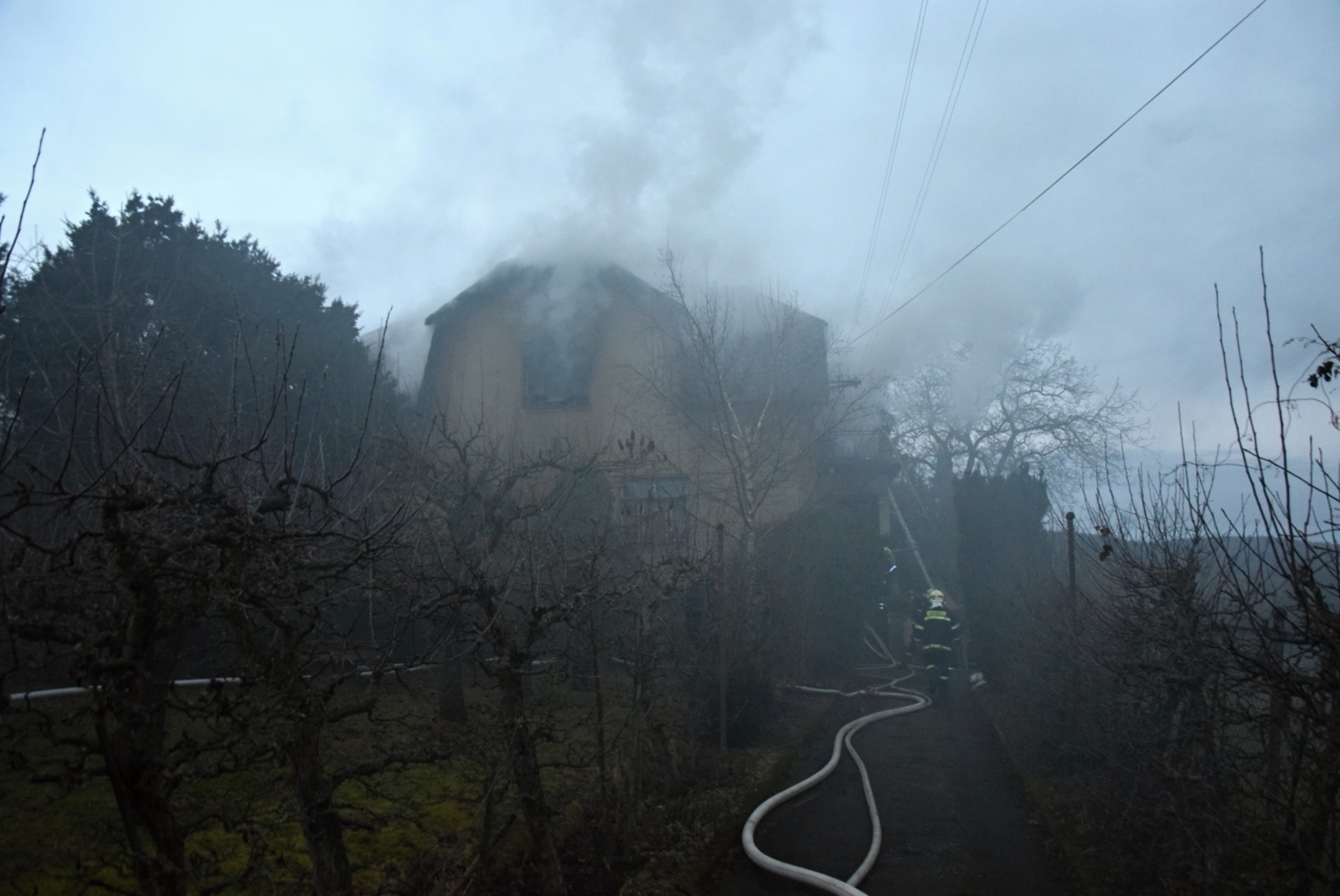 Při příjezdu první jednotky na místo už z oken v prvním patře šlehaly několikametrové plameny a v nebezpečí byla žena, které se nepodařilo včas sejít do přízemí a objekt opustit. Protože k domu nebylo možné přistavit zmíněnou výškovou techniku, zachránili hasiči majitelku domu z terasy po nastavovacím žebříku. Následně ženu předali do péče posádce zdravotnické záchranné služby, která ji převezla s podezřením na intoxikaci zplodinami hoření do příbramské nemocnice.