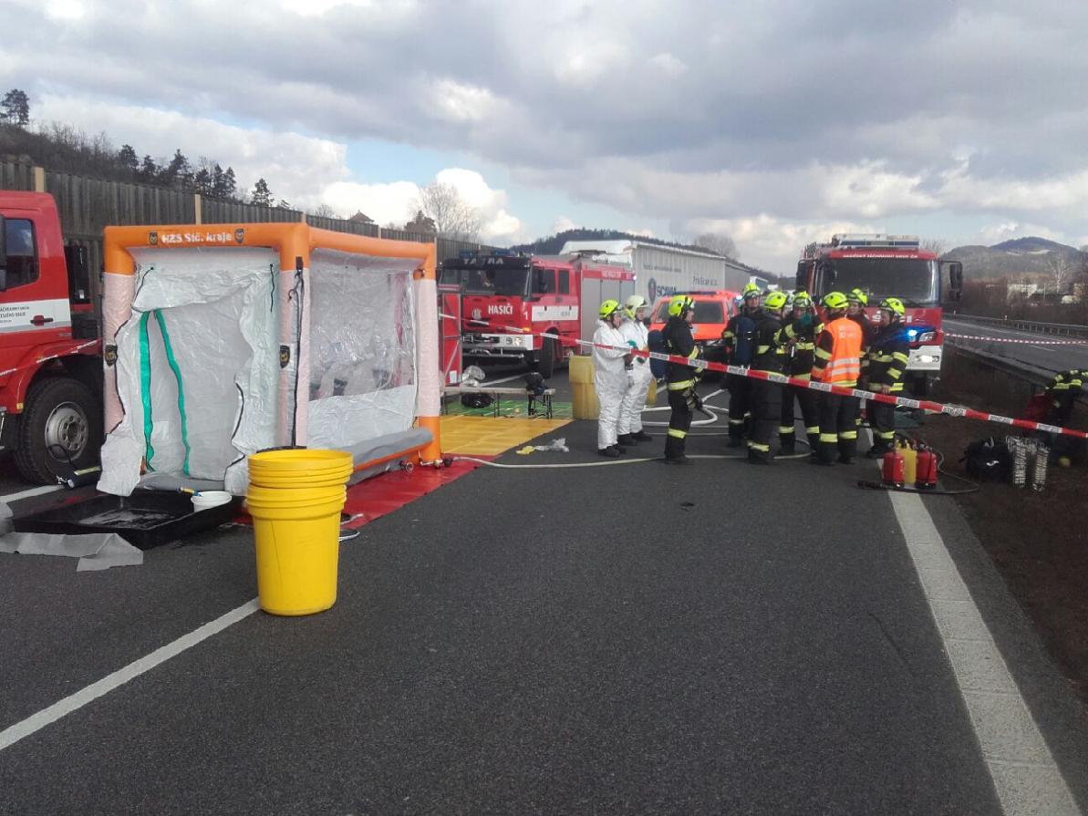Dvě nasazené skupiny hasičů v kompletní protichemické ochraně (přetlakový protichemický oděv a dýchací přístroj) pak postupně uniklou látku zajistily, uzavřely do speciálního obalu a byla provedena dekontaminace zasahujících.