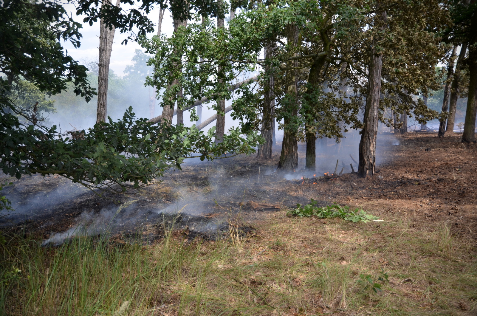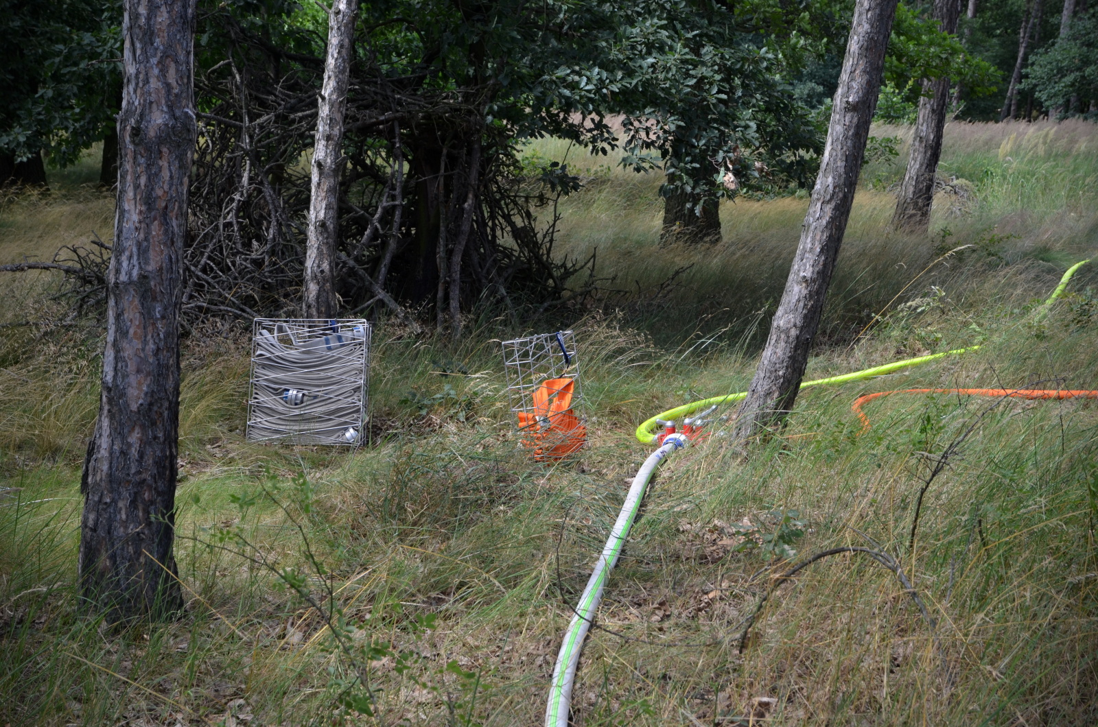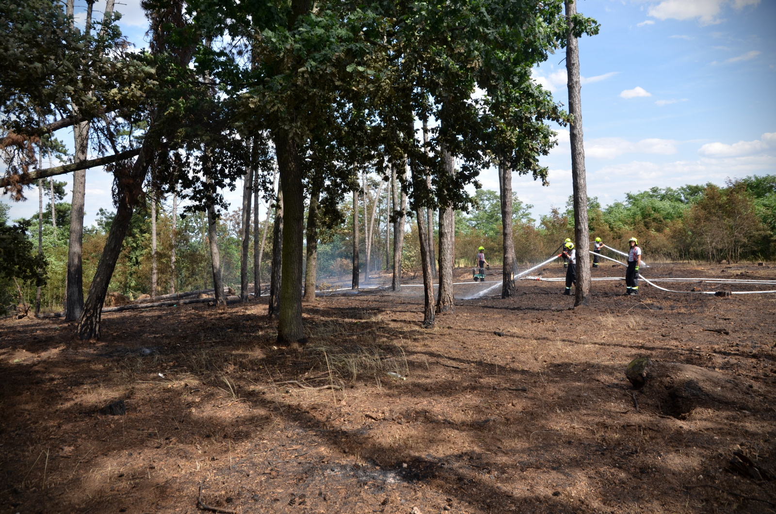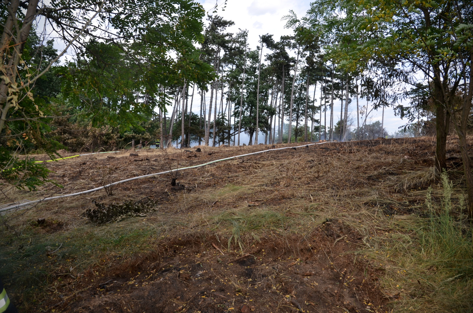 Celkem se tak k požáru sjelo jedenáct cisteren a další hasičská vozidla. Hasiči postupně rozvinuli dvě dopravní vedení a pomocí čtyř vodních proudů dostali plameny do půl hodiny pod kontrolu. Požár se vlivem silného větru rozšířil na plochu jednoho a půl hektaru. V horkém počasí při teplotách nad třicet stupňů Celsia následovalo vyčerpávající tříhodinové dohašování a kontrola požářiště pomocí termokamer.