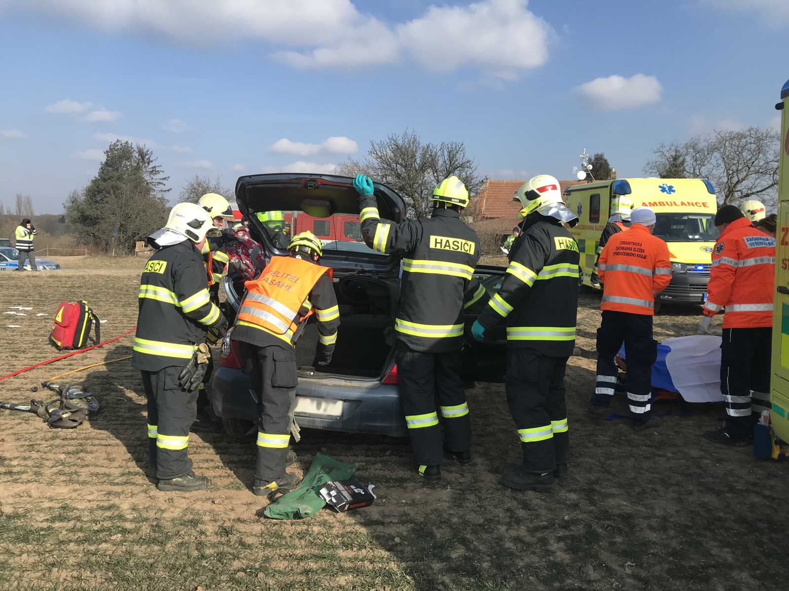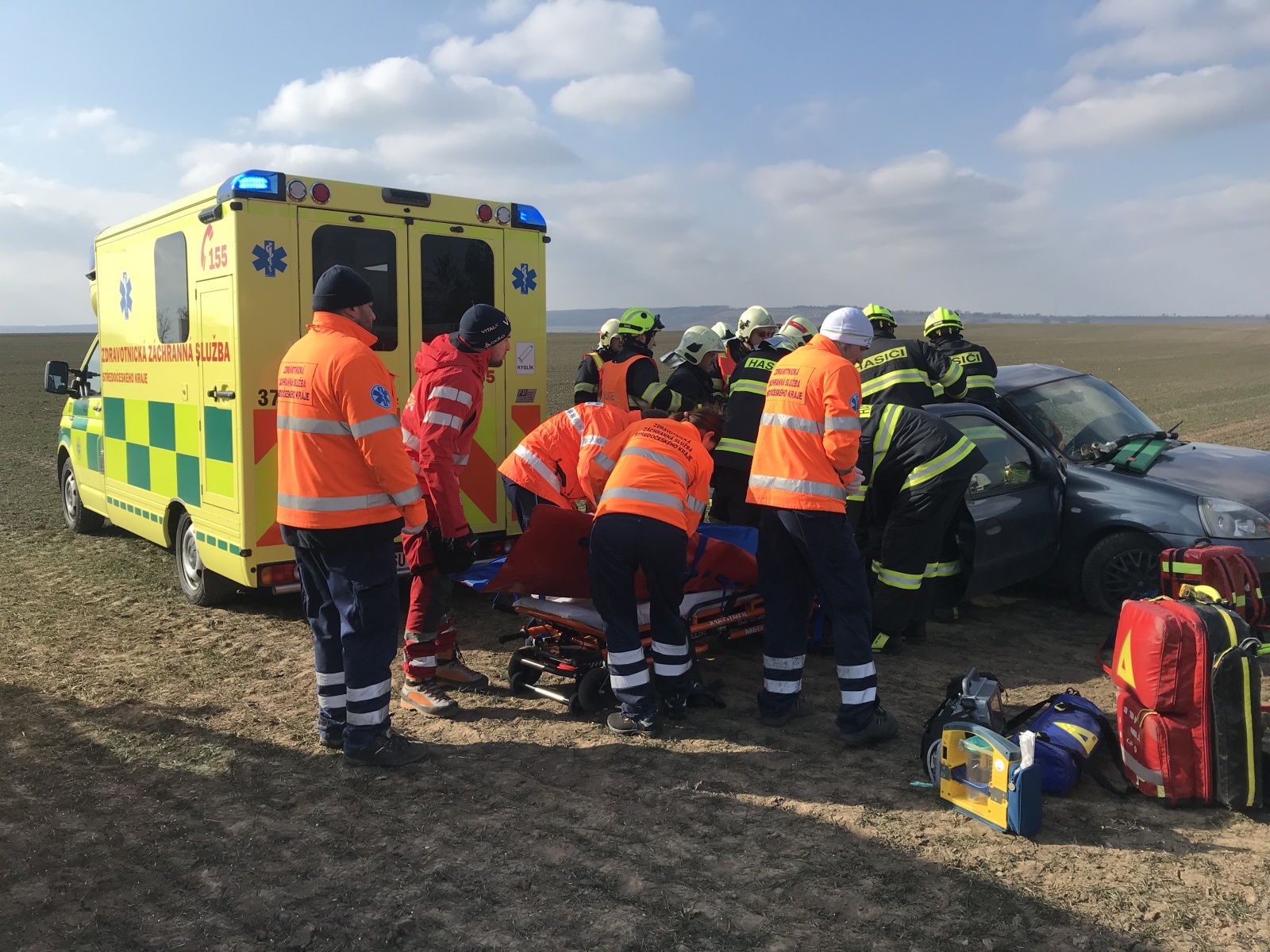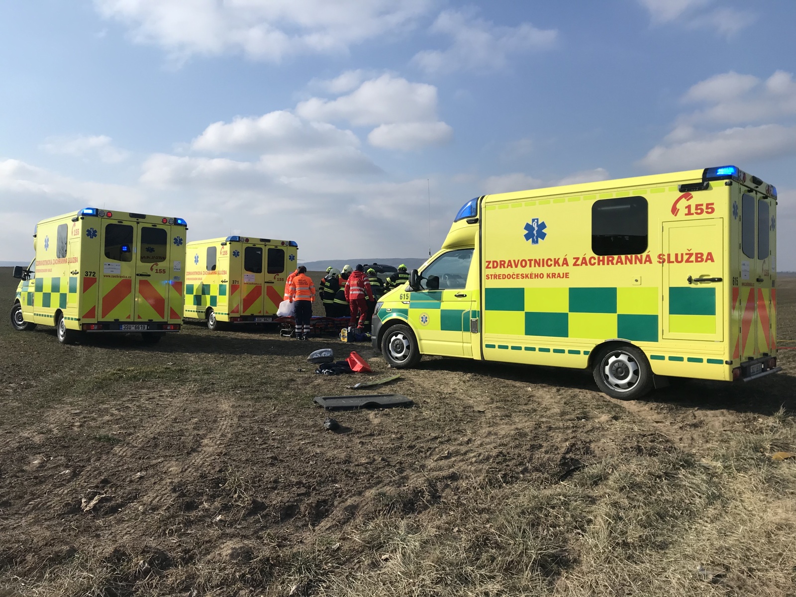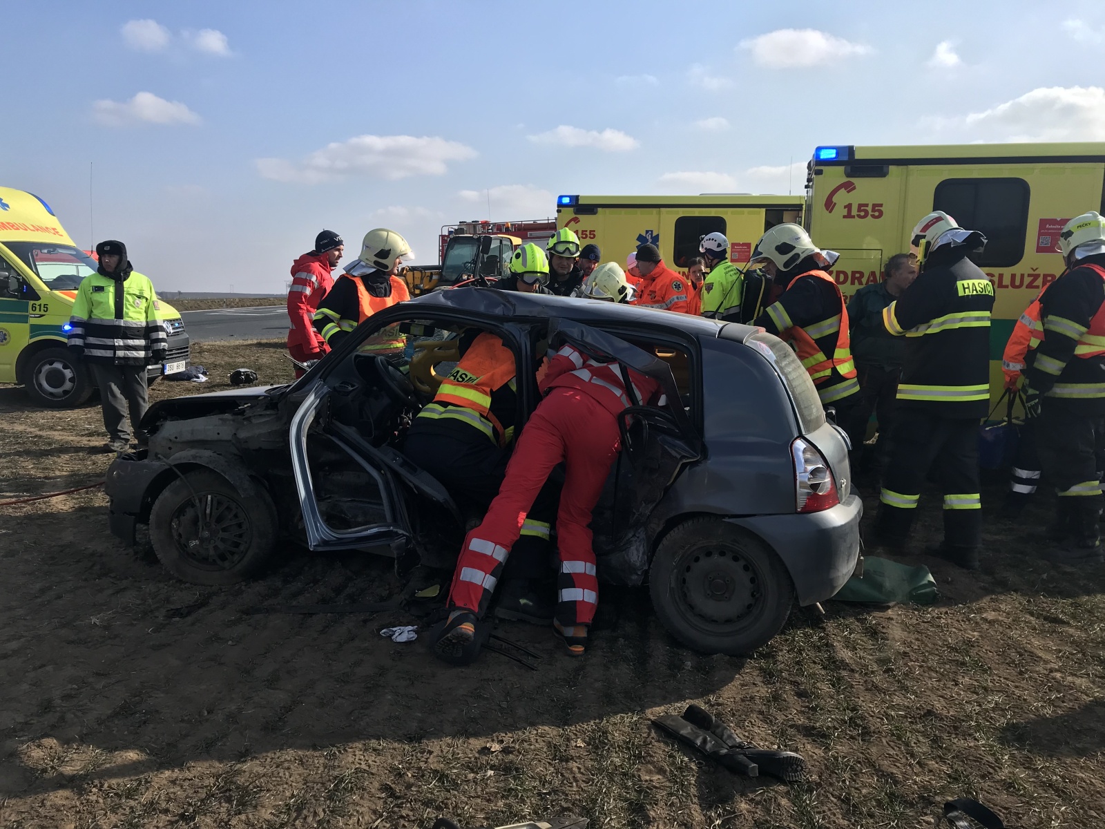 V době příjezdu první jednotky k události bylo zjištěno, že obě vozidla se nacházejí mimo komunikaci, přičemž v jednom, které stálo za krajnicí, se nacházela jedna zraněná osoba. Druhé auto skončilo v poli a uvnitř byly dvě vážně zraněné osoby.