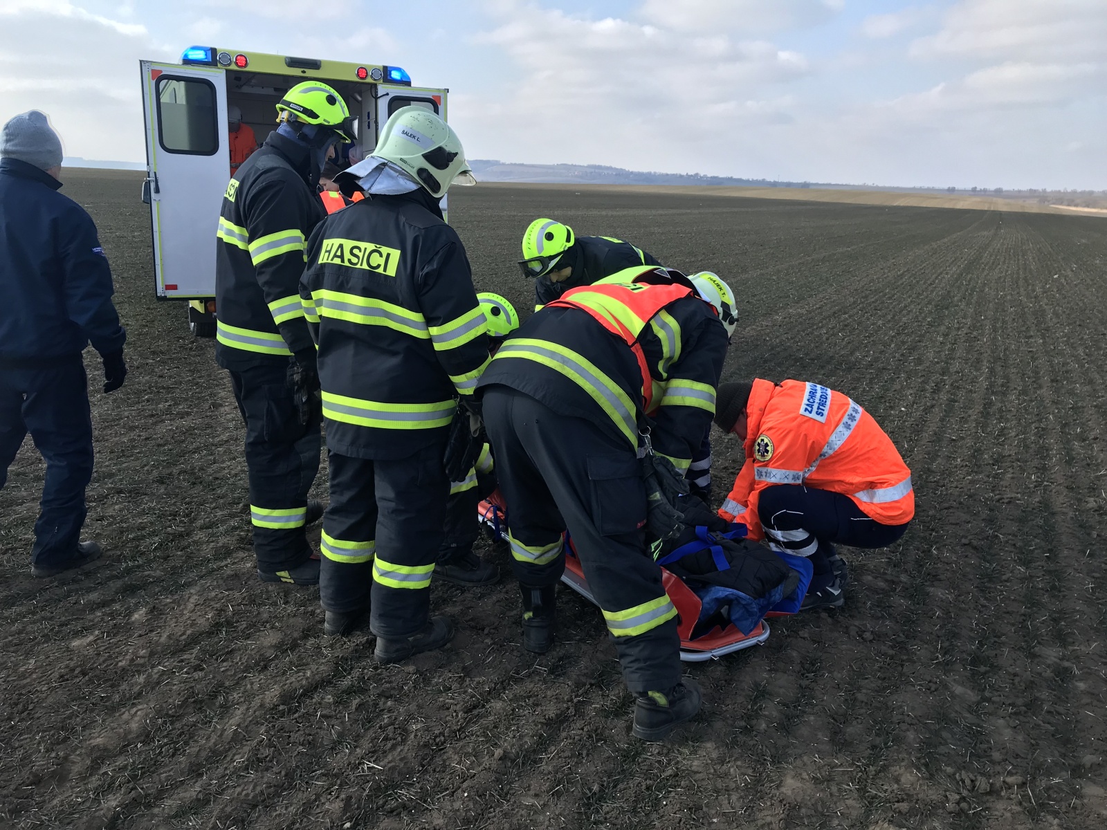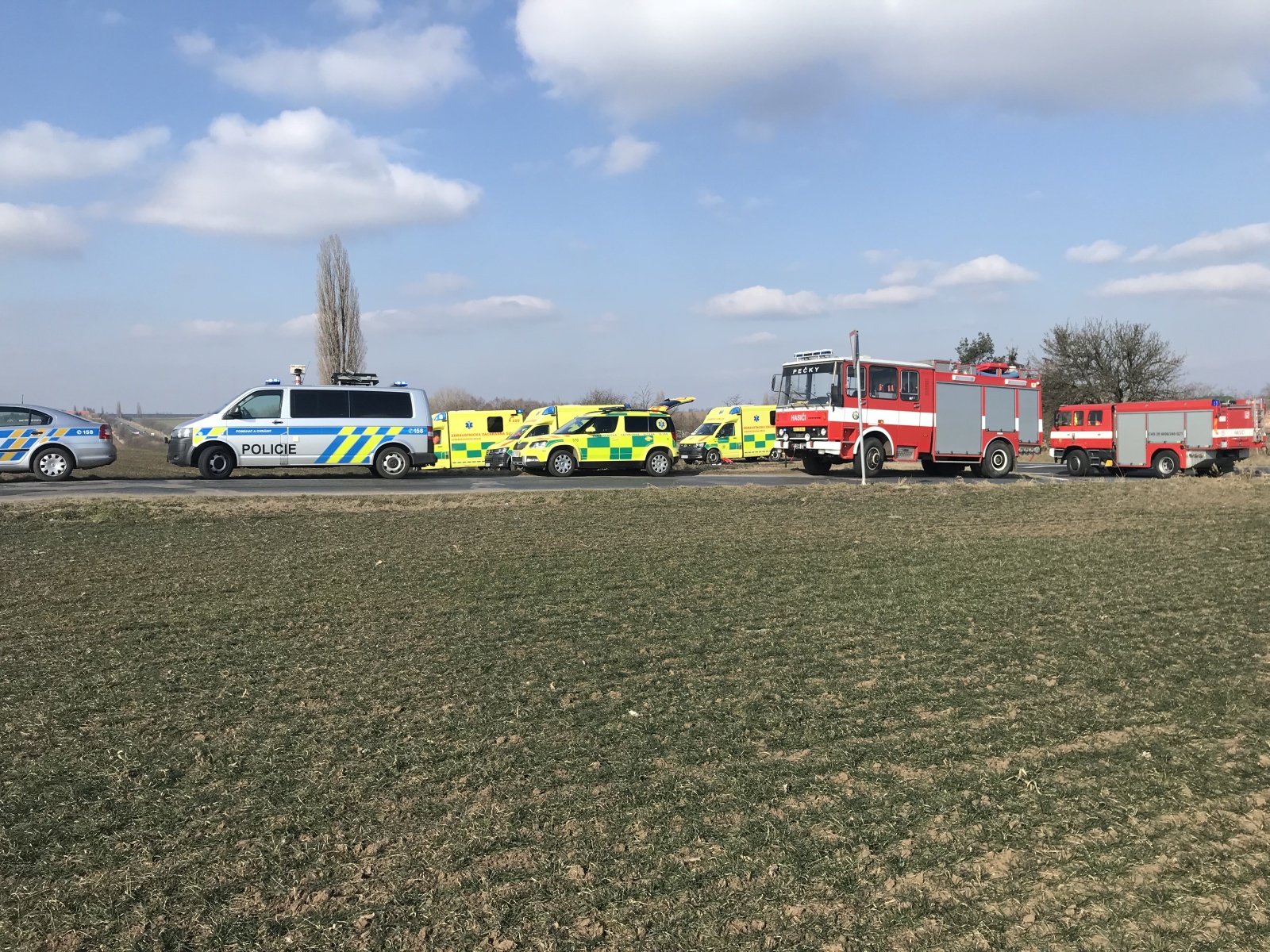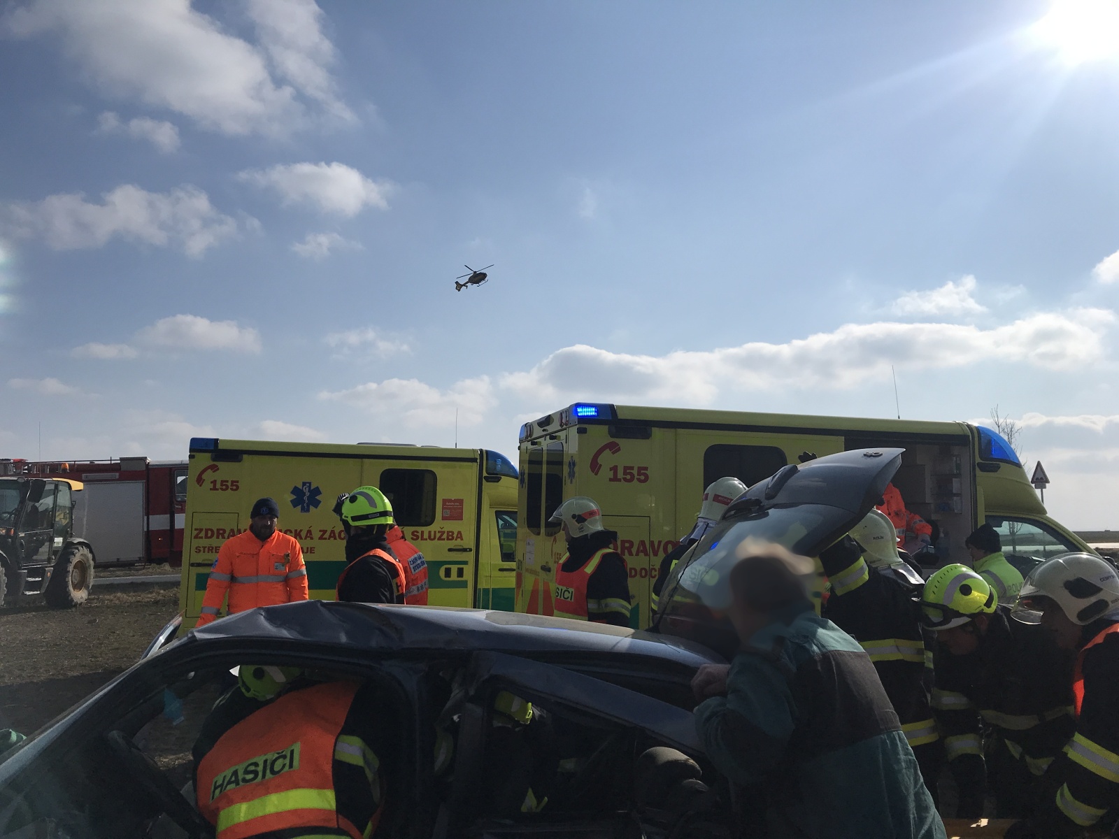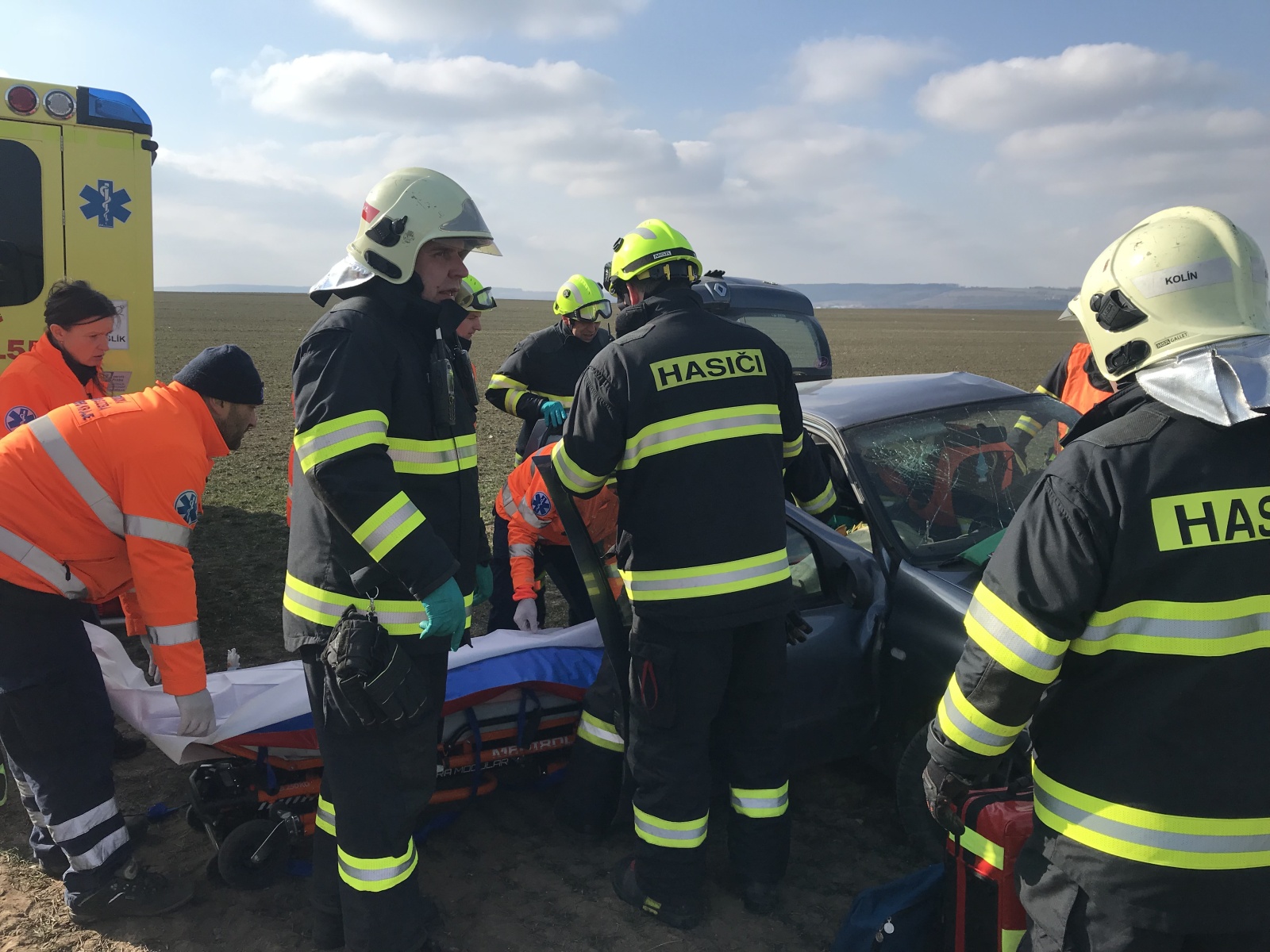 V době příjezdu první jednotky k události bylo zjištěno, že obě vozidla se nacházejí mimo komunikaci, přičemž v jednom, které stálo za krajnicí, se nacházela jedna zraněná osoba. Druhé auto skončilo v poli a uvnitř byly dvě vážně zraněné osoby.