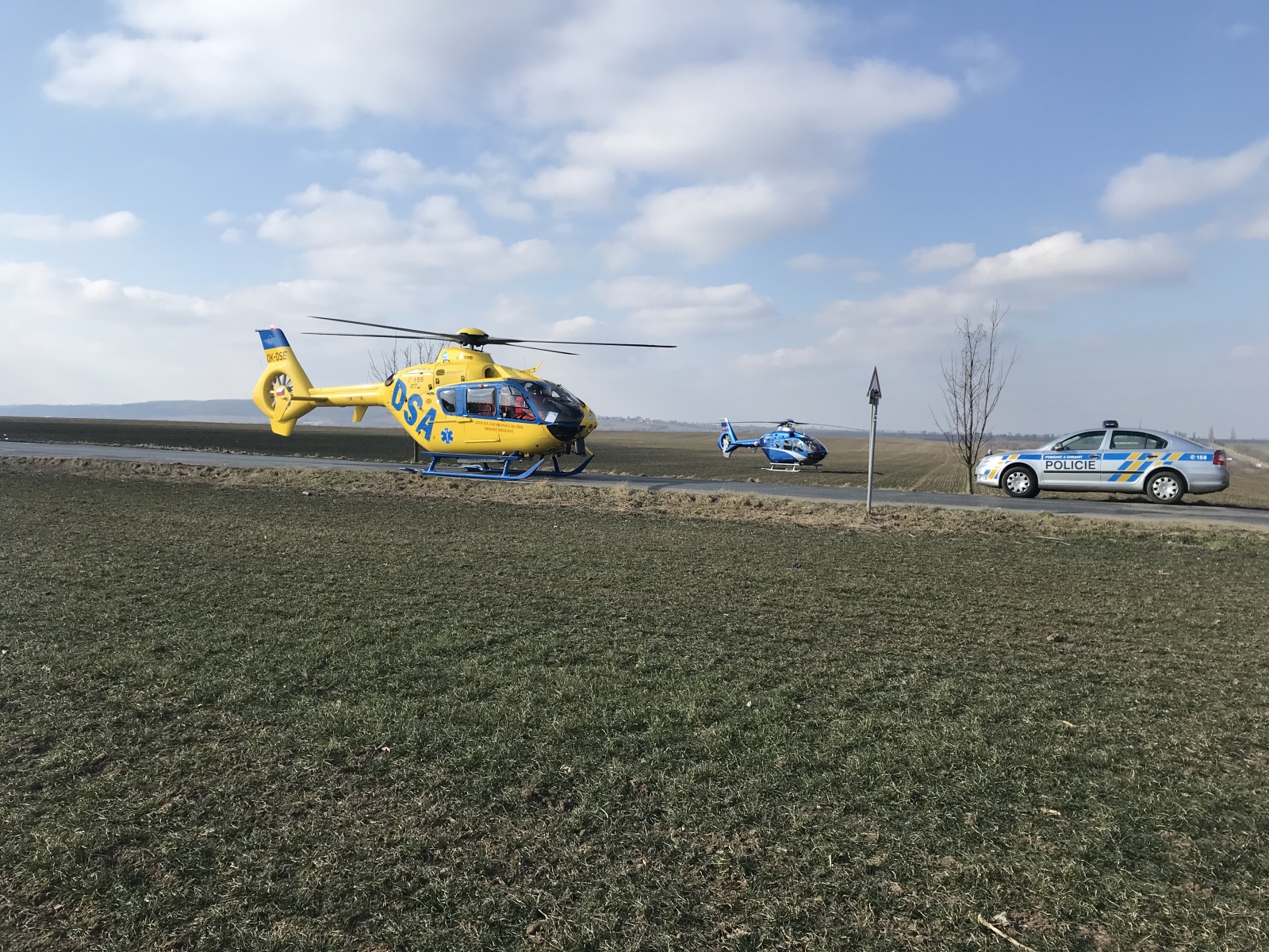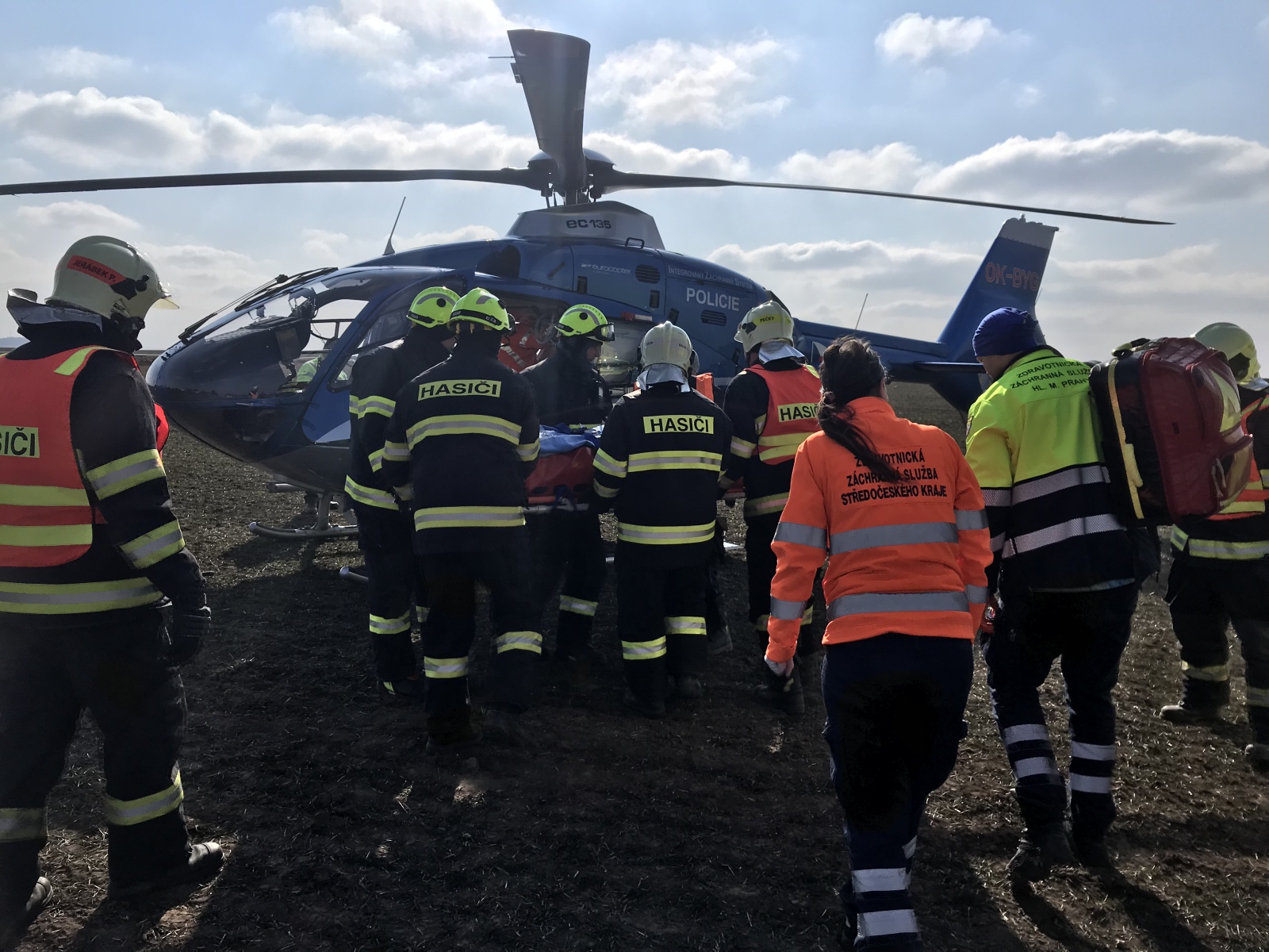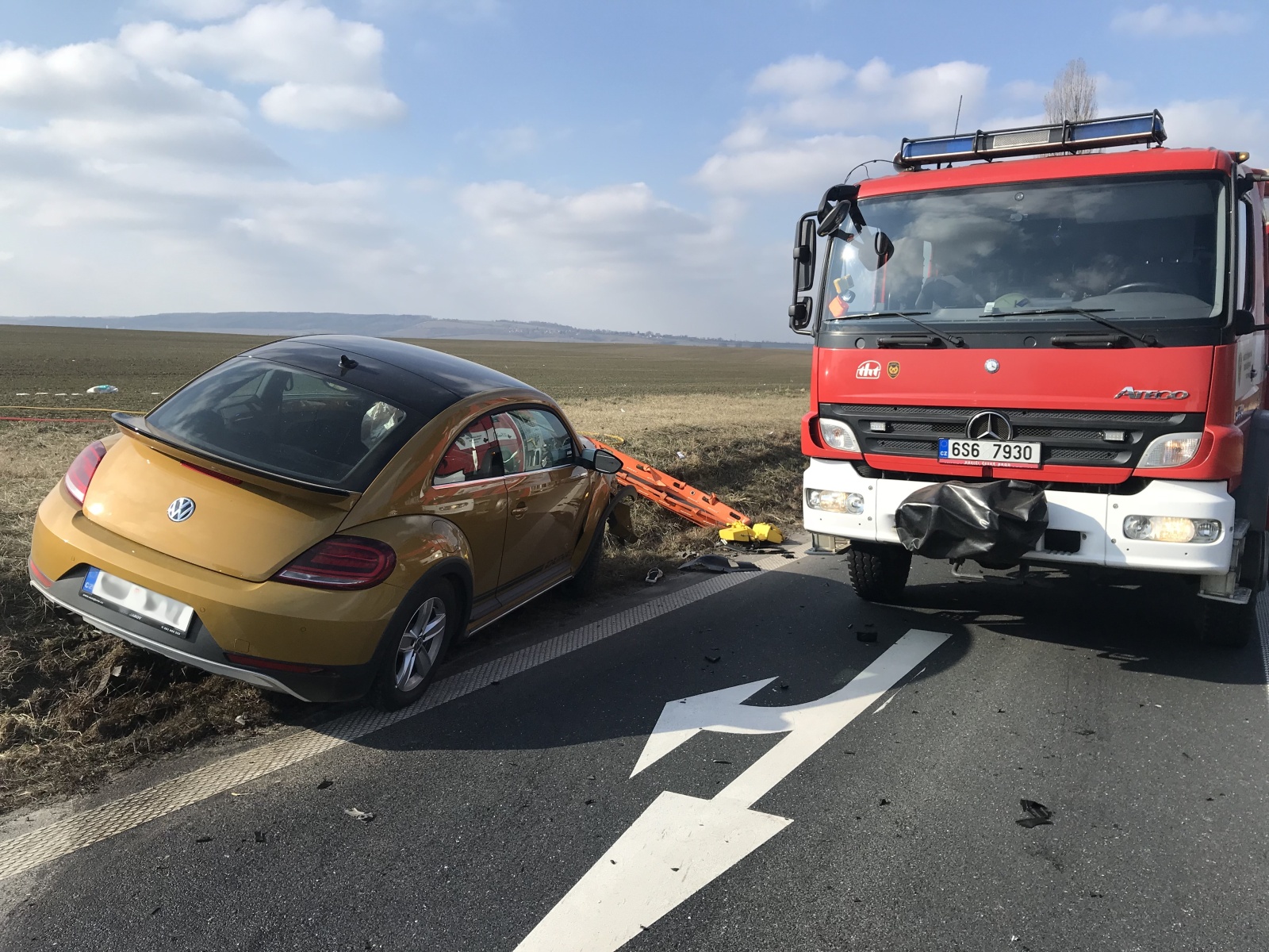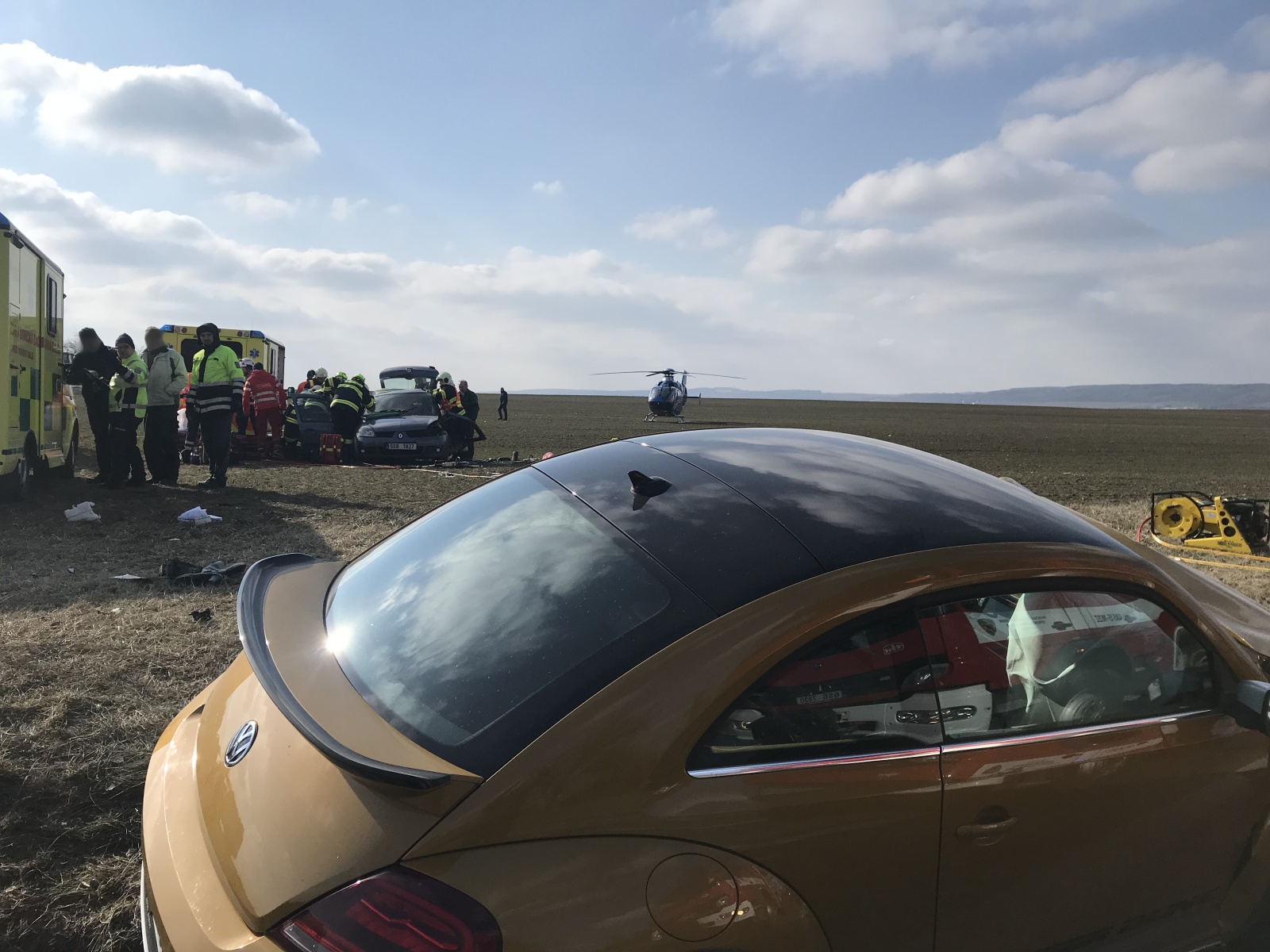 V době příjezdu první jednotky k události bylo zjištěno, že obě vozidla se nacházejí mimo komunikaci, přičemž v jednom, které stálo za krajnicí, se nacházela jedna zraněná osoba. Druhé auto skončilo v poli a uvnitř byly dvě vážně zraněné osoby.
