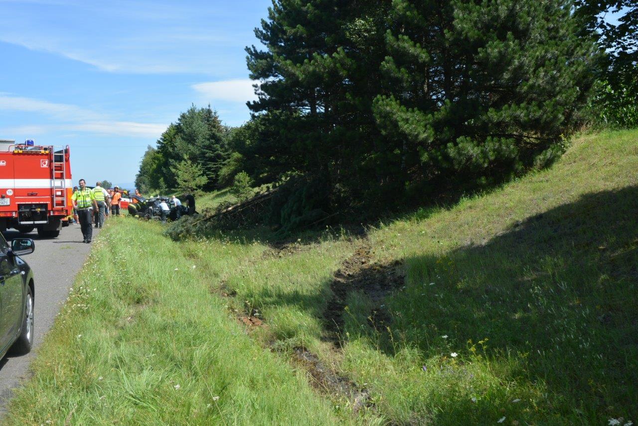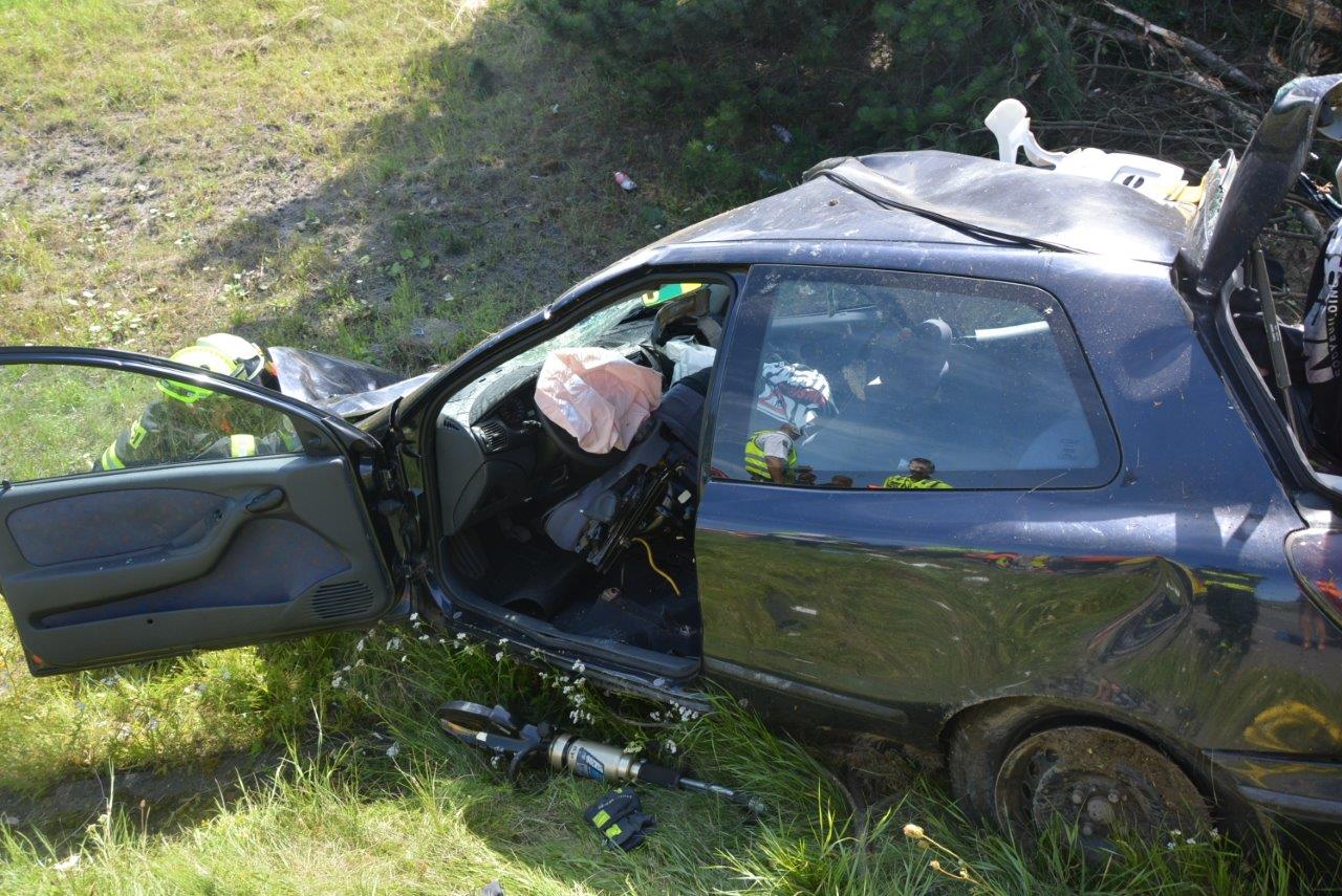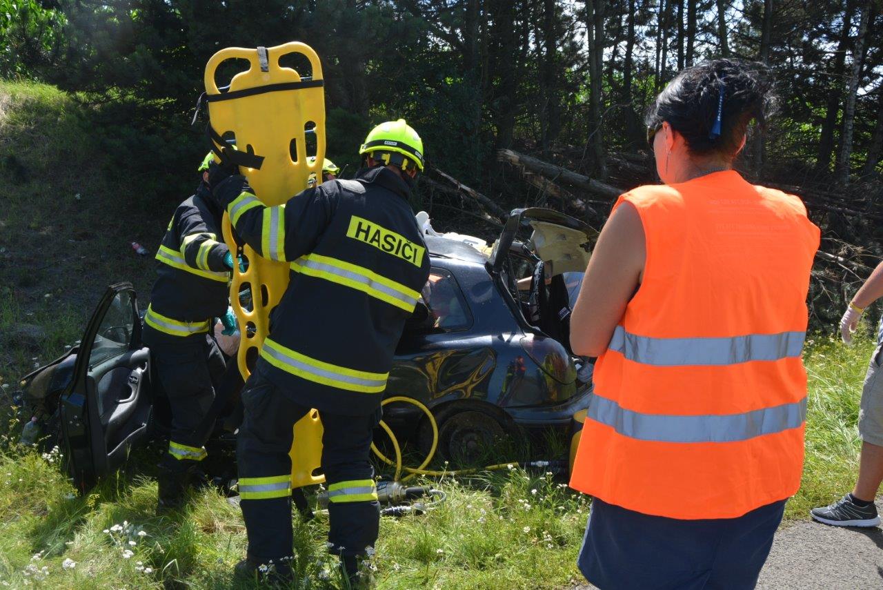 Průzkumem bylo zjištěno, že vozidlo patrně ve vysoké rychlosti vyjelo z dálnice a přerazilo několik stromů na travnatém svahu. Následně zůstalo na kolech v příkopu. Dvě zraněné osoby opustily zdemolovaný vůz samy, ale na zadním sedadle zůstala zaklíněna mladá žena. Hasiči použili k jejímu vyproštění hydraulické vyprošťovací zařízení. V průběhu celého zásahu obě jednotky spolupracovaly s několika posádkami zdravotnické záchranné služby.