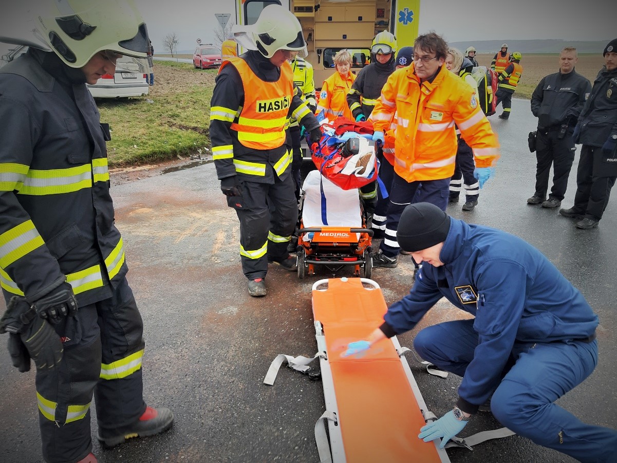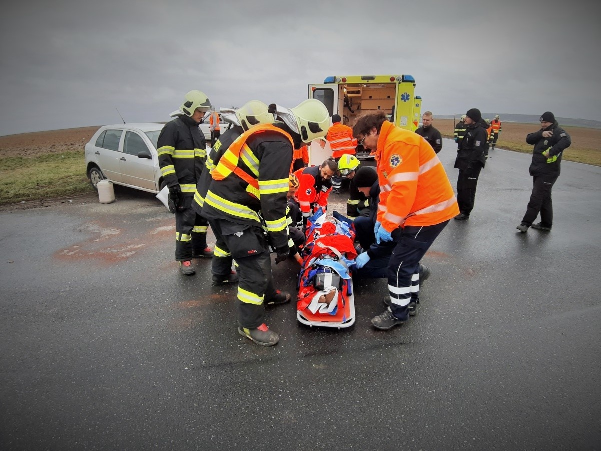 První jednotka hasičů byla na místě za deset minut od ohlášení události. Provedeným průzkumem bylo potvrzeno, že na kolínské silnici číslo 12 došlo na křižovatce u Vrbčan ke střetu dvou osobních vozidel se zraněním tří osob, přičemž dvěma z nich nejprve poskytli pomoc okolo jedoucí řidiči. Třetí zraněnou osobu, která zůstala ve vozidle, vyprostili hasiči bez použití vyprošťovacího hydraulického zařízení. Po nezbytném ošetření byl nejvážněji zraněný pacient transportován vrtulníkem do jedné z pražských nemocnic, další dvě osoby byly převezeny sanitními vozidly do nemocnice v Kolíně.