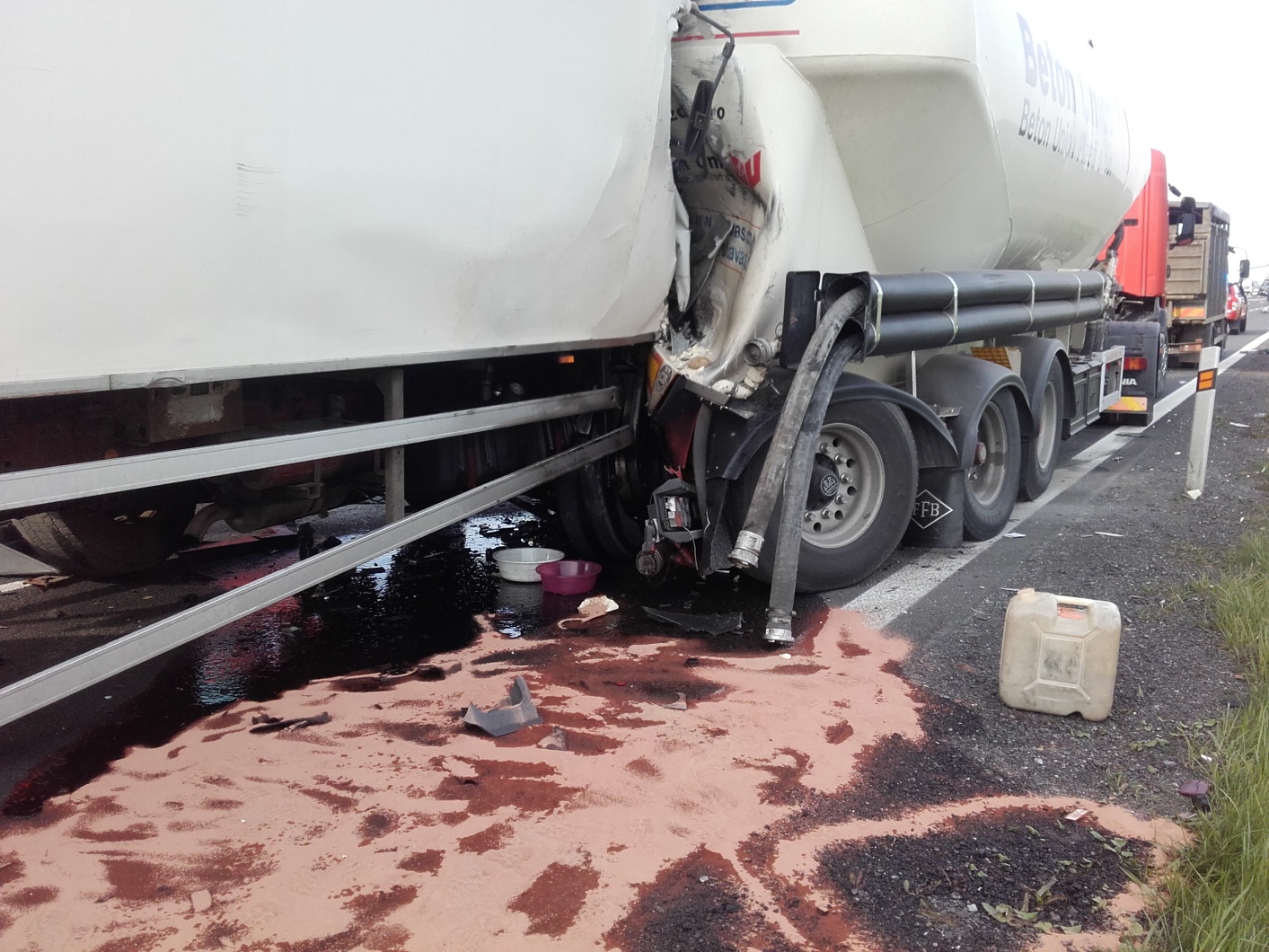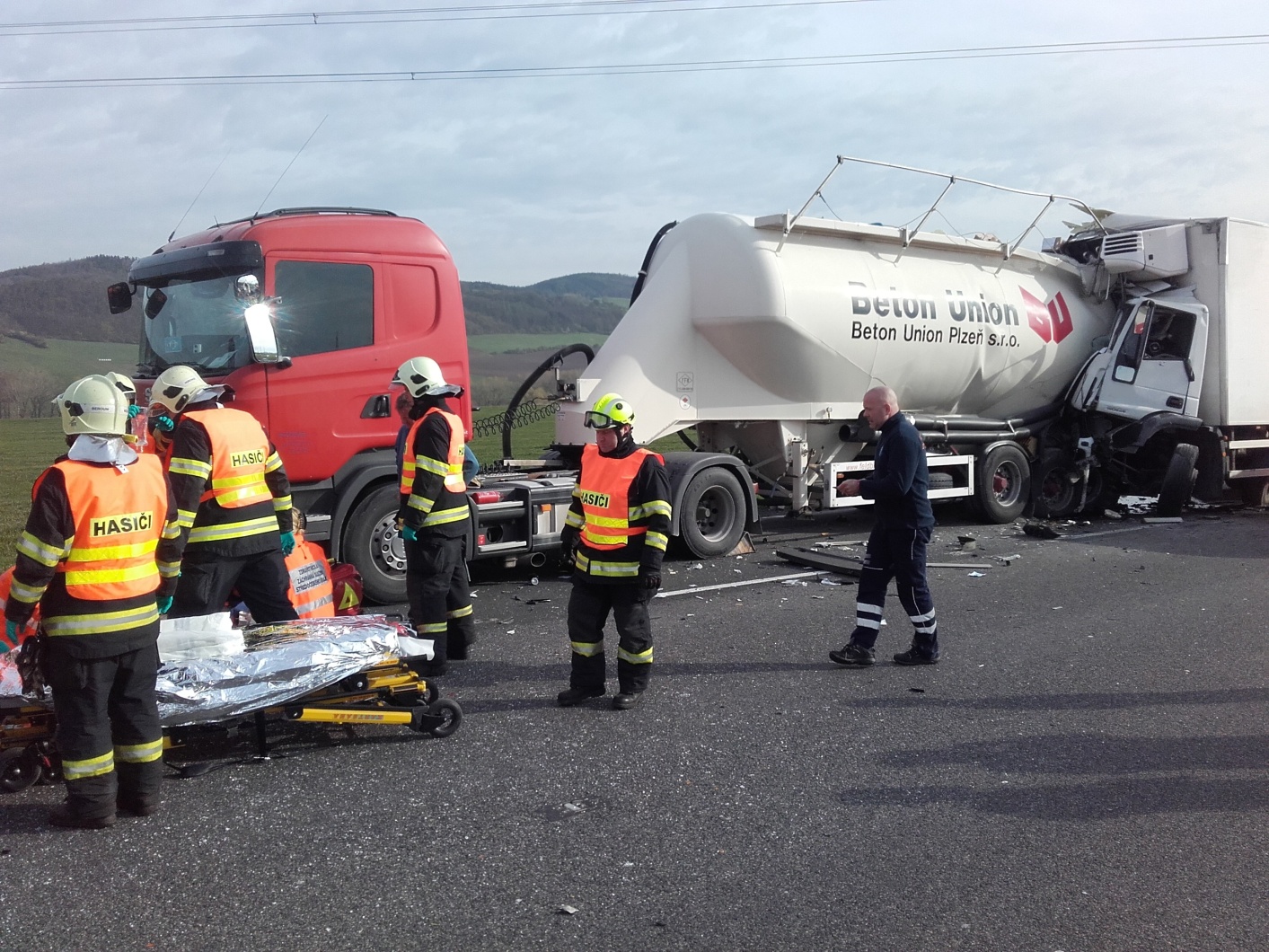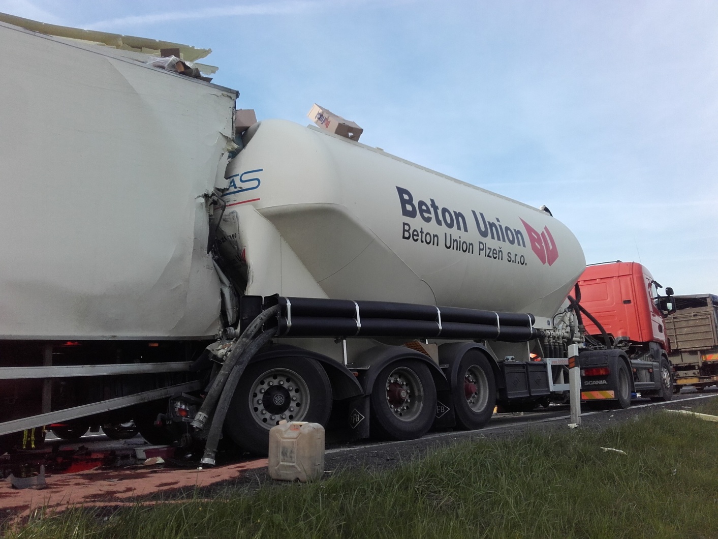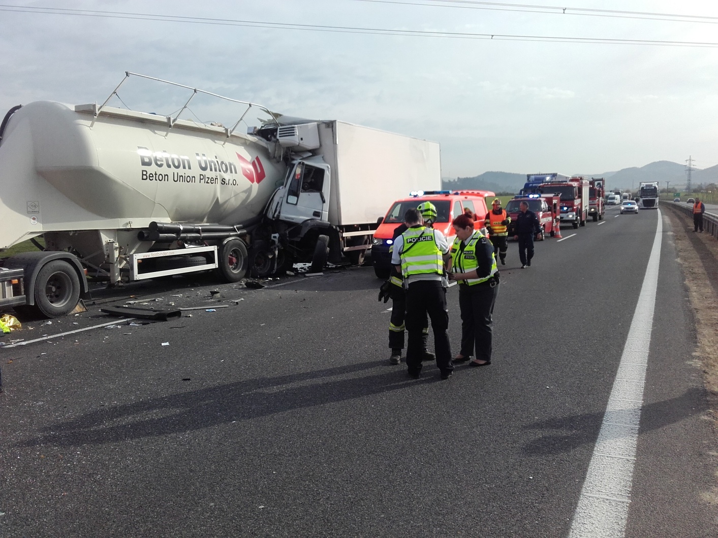 K události vyrazily profesionální jednotky z Berouna a Hořovic. Hasiči na místě zjistili, že v jízdním pruhu pro pomalá vozidla narazil zřejmě z nepozornosti řidič skříňového nákladního automobilu do odstavené porouchané cisterny pro převoz betonářských příměsí.