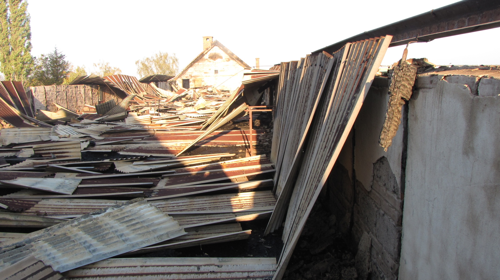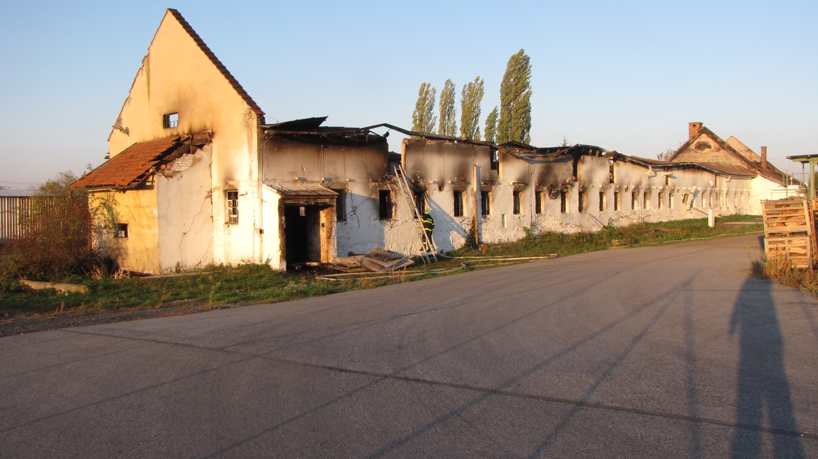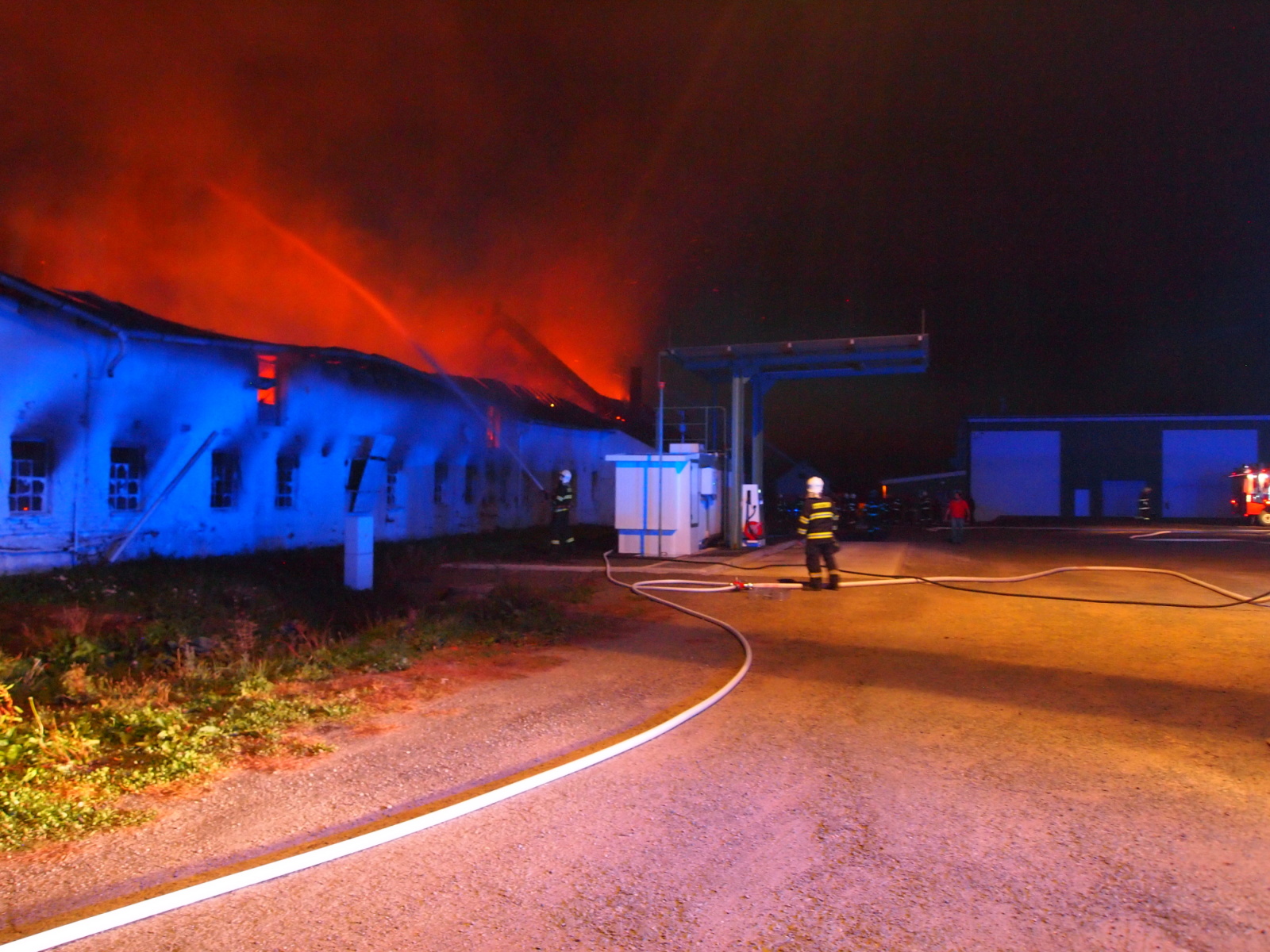 středisku ohlášena krátce po 21. hodině. V té době už měly jednotky ukončenou evakuaci materiálu a strojů z těsné blízkosti objektu a začalo náročné hašení jednotlivých ohnisek, která se nacházela pod propadlou střechou.