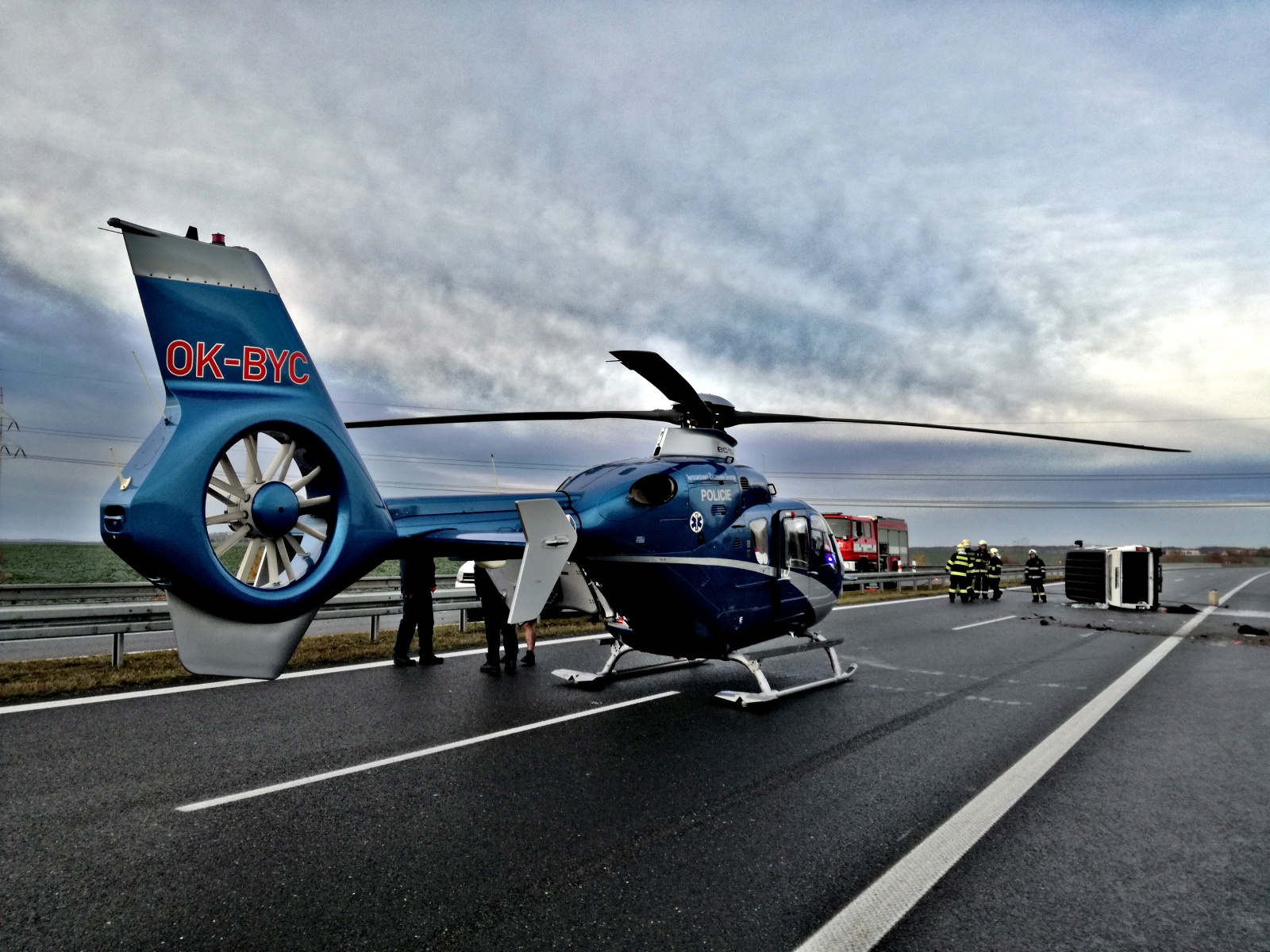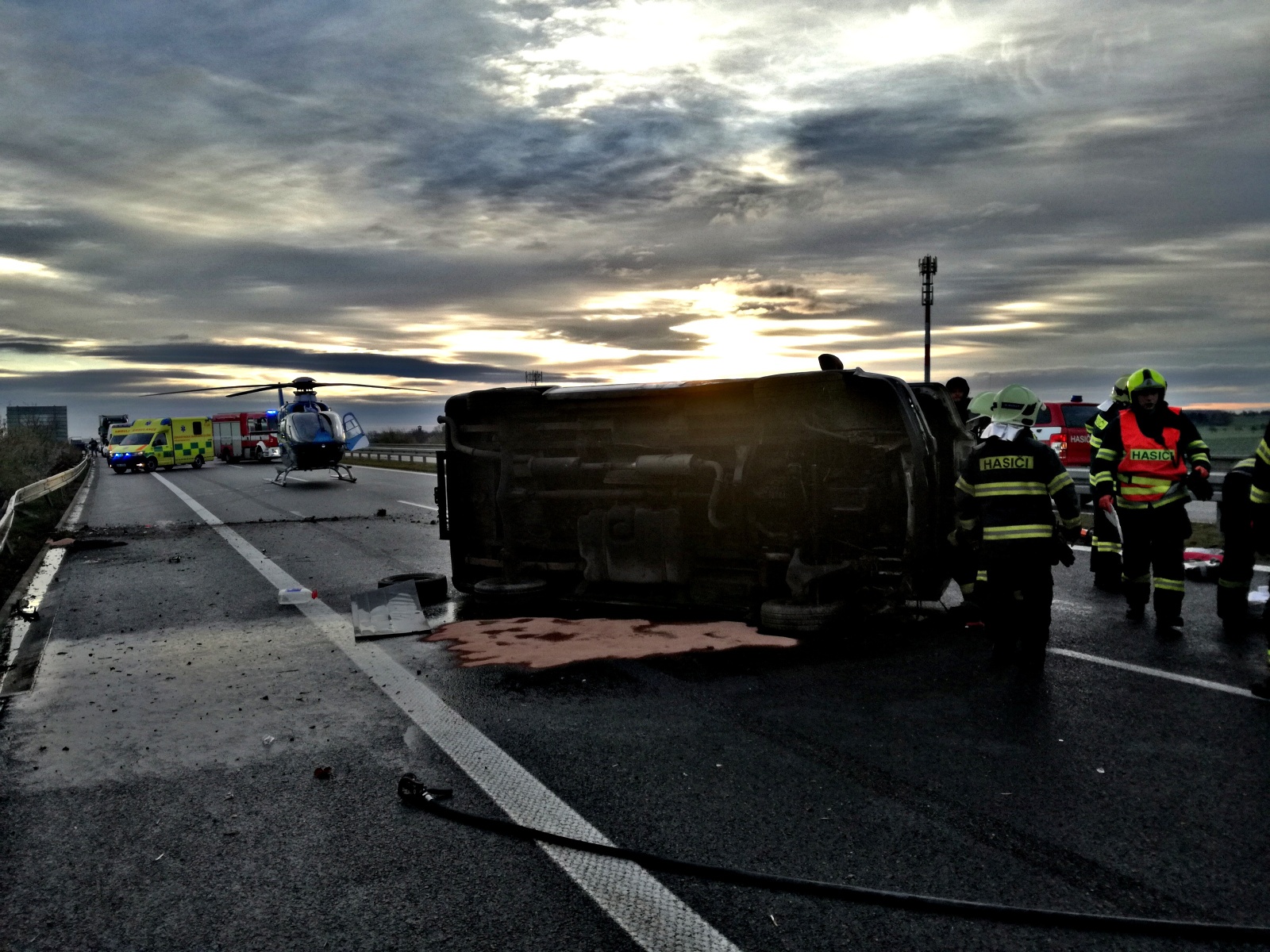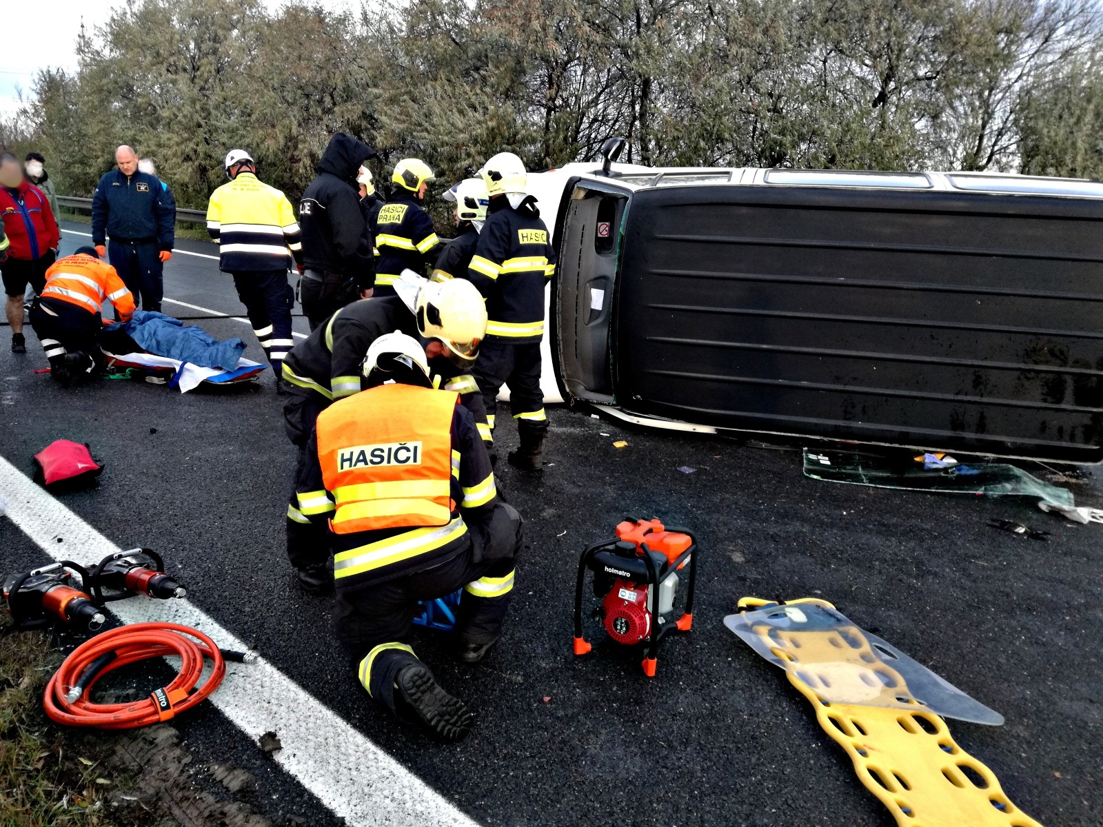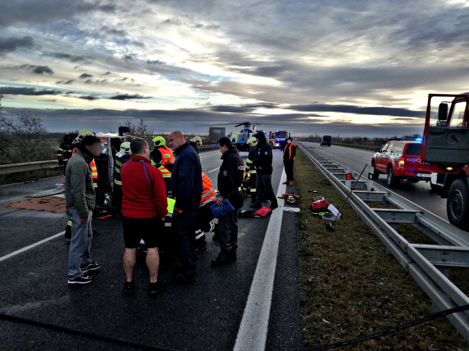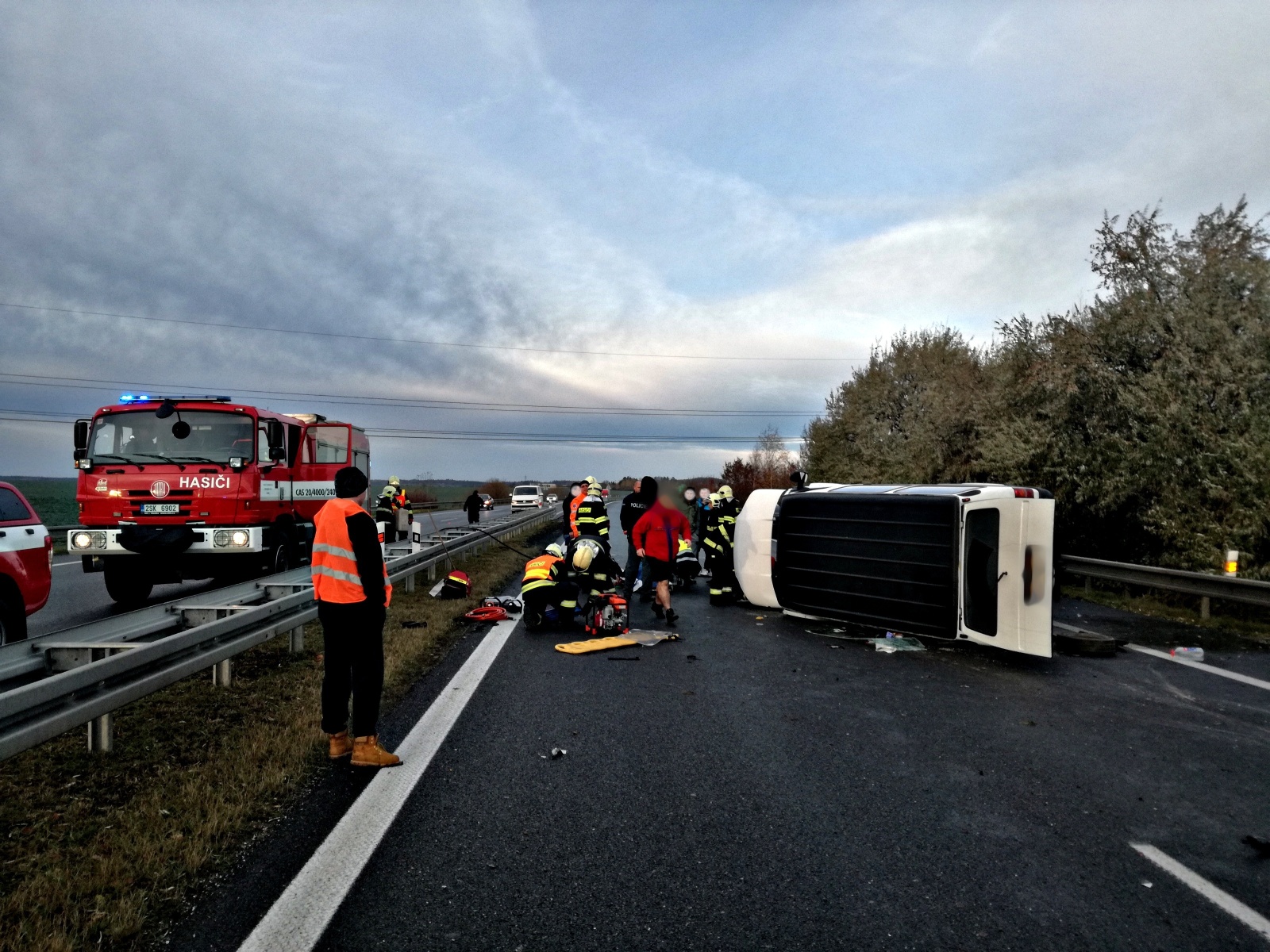 Po příjezdu na místo hasiči zjistili, že dodávka narazila do svodidel a skončila na boku uprostřed vozovky. Uvnitř vozidla cestoval řidič a dalších šest osob, z nichž jedna byla zaklíněna s těžkým zraněním. Ostatní cestující už byli mimo havarované vozidlo s lehčími zraněními, řidič vyvázl bez úhony na zdraví.