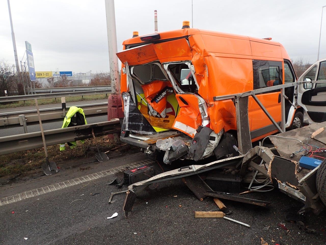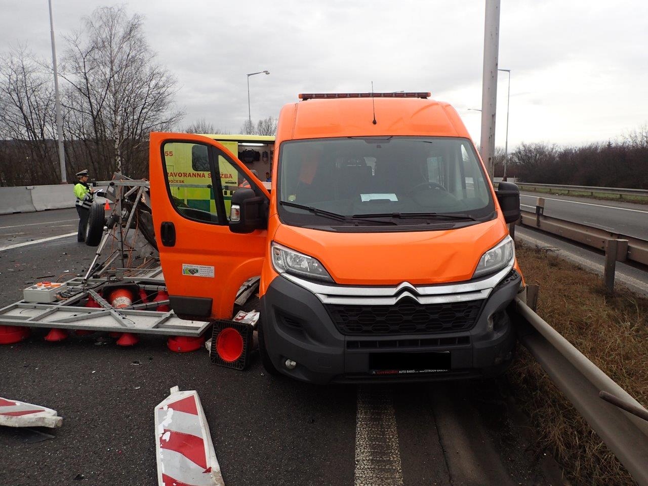 K další vážné nehodě došlo krátce po třinácté hodině na dálnici D10 ve směru z Prahy do Turnova v úrovni sjezdu do Mladé Boleslavi, kdy řidič osobního automobilu ve vysoké rychlosti narazil zezadu do přívěsného vozíku pracovníků údržby, kteří prováděli práce v rychlém jízdním pruhu.