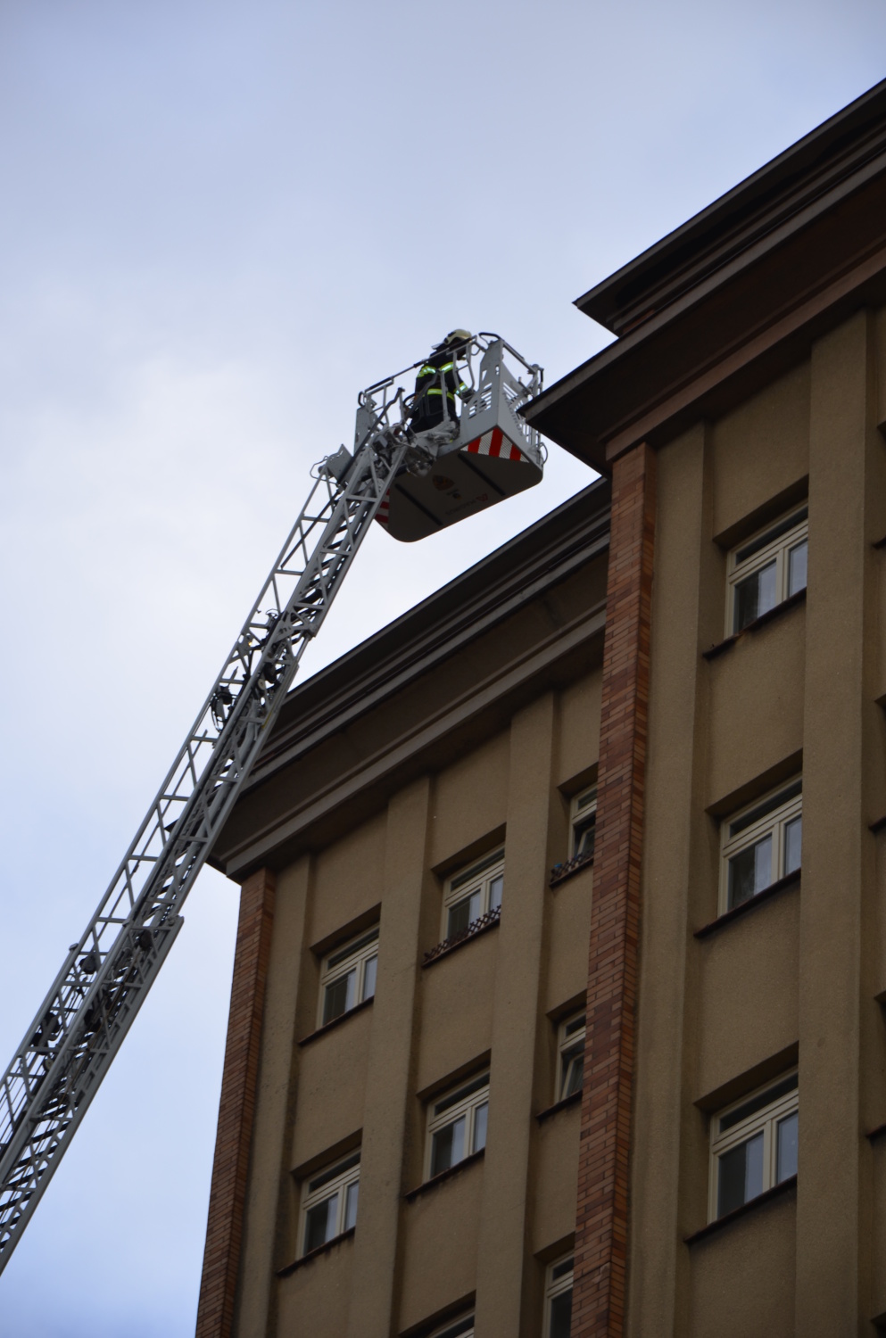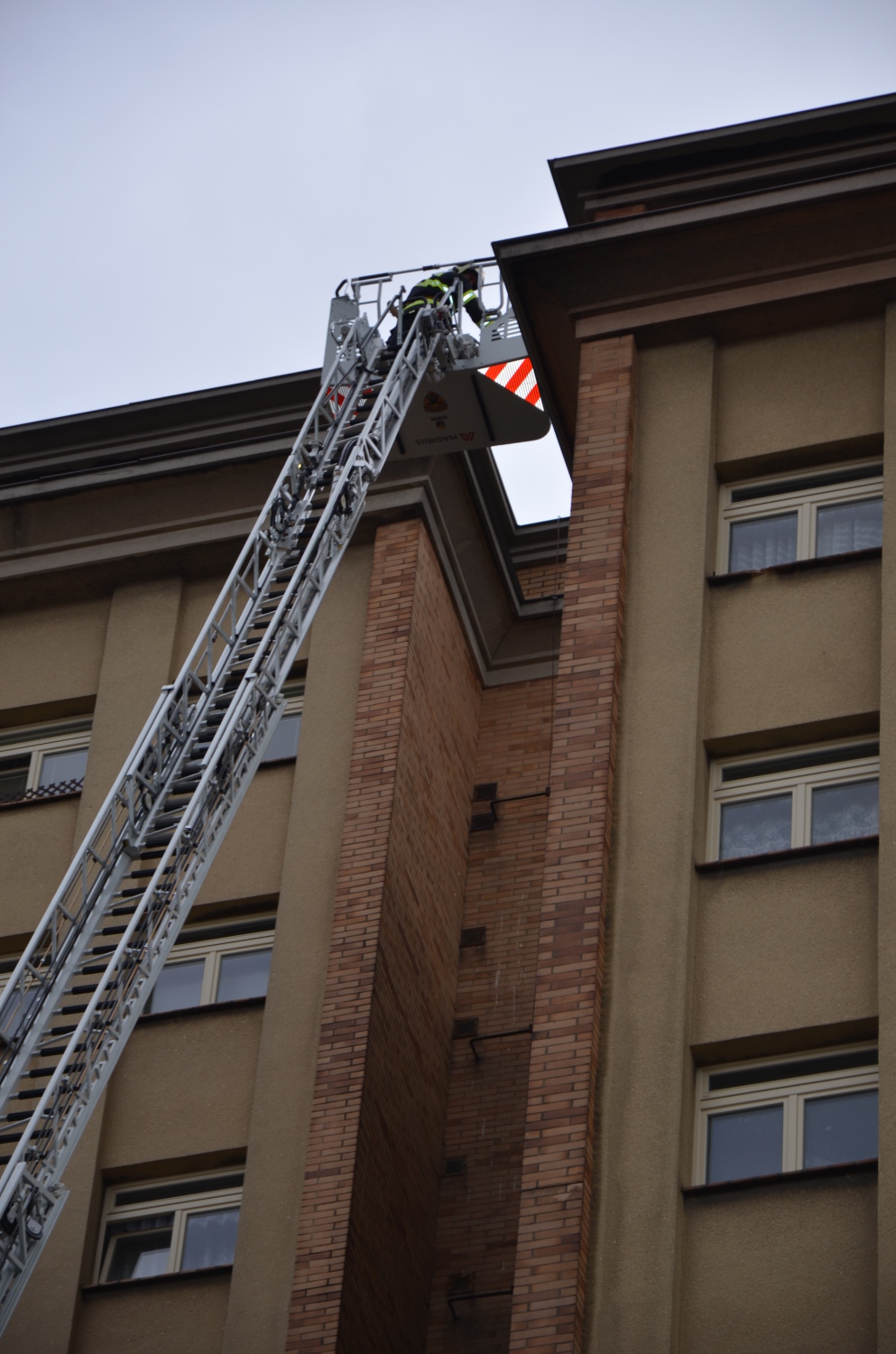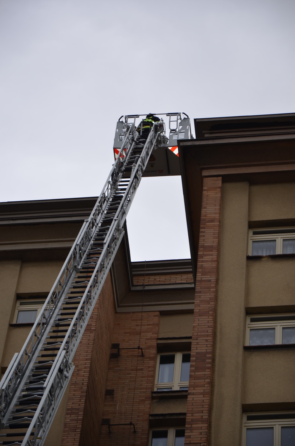 Nejprve hasiči zkusili najet k západní straně objektu popředu, i tak se ale podařilo dostat s košem nad okna v nejvyšším patře. Pak s vozem na stejné místo k budově zacouvali, čímž se k ní se základnou žebříku i více přiblížili. A výsledek se dostavil, neboť se tak koš pohodlně přehoupl až nad úroveň boční terasy na střeše věžáku.