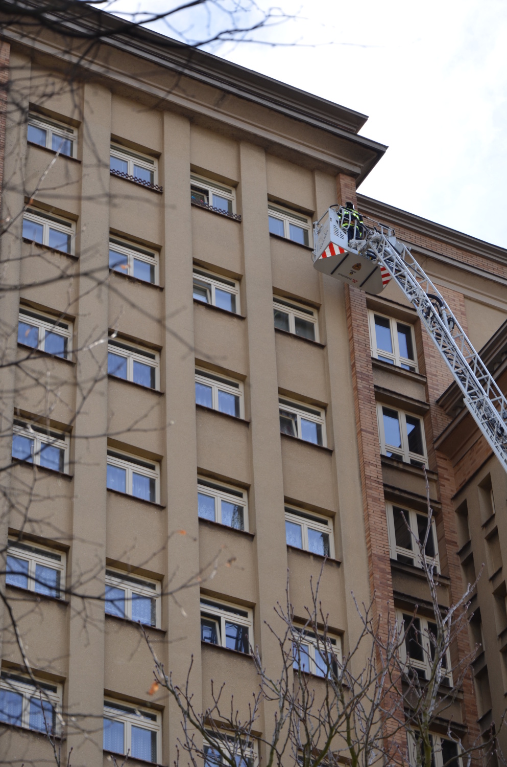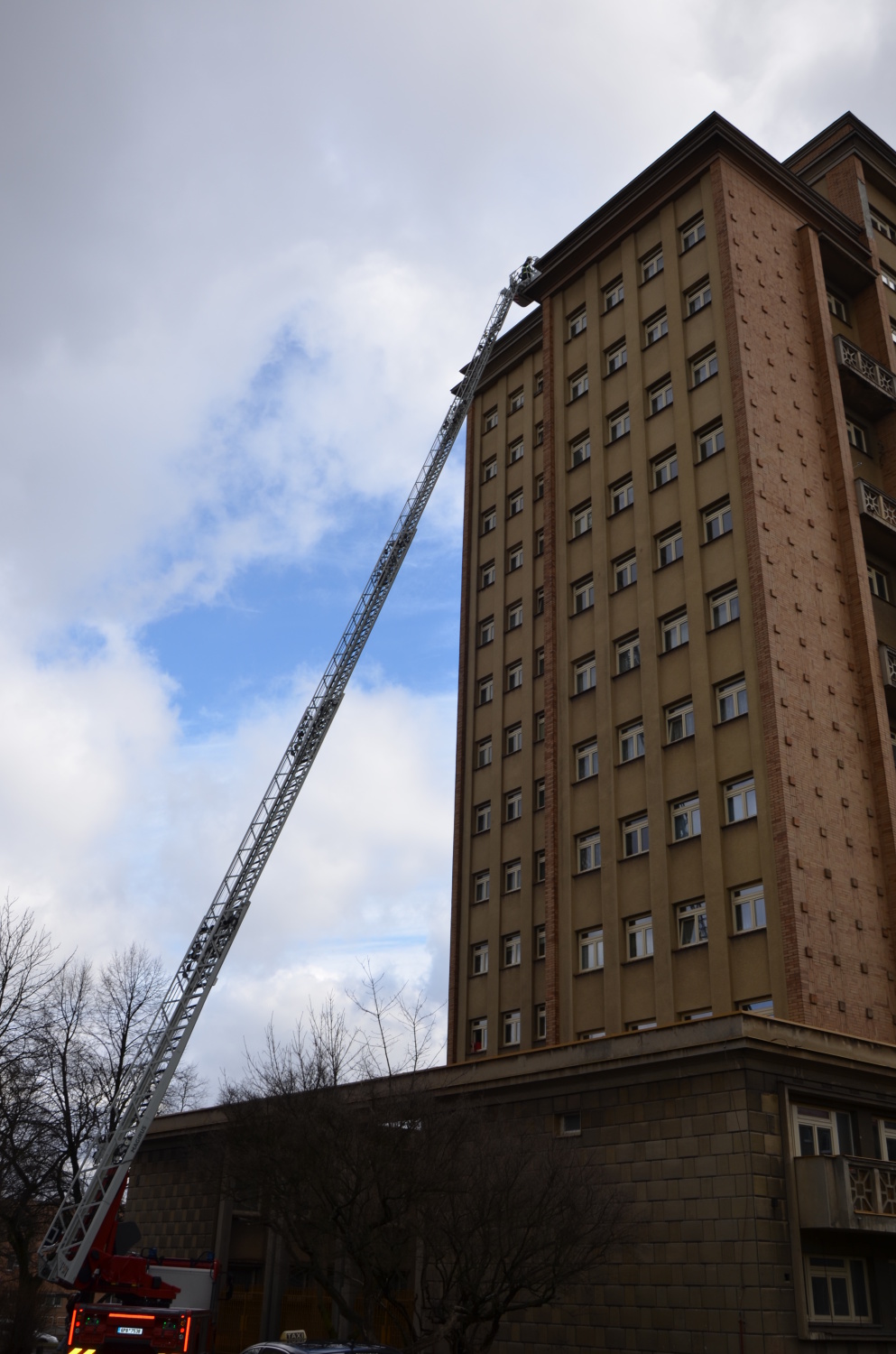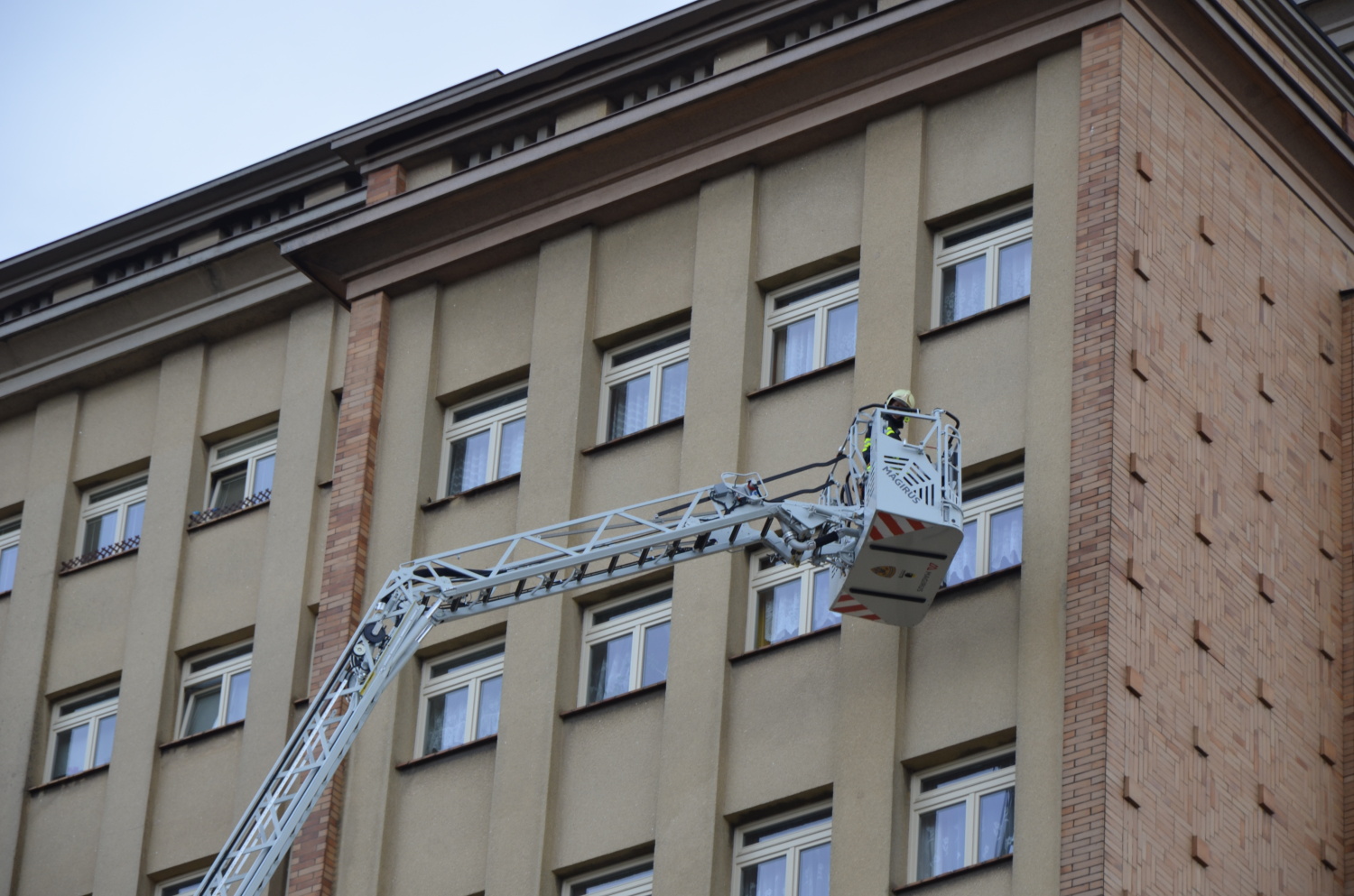 Nejprve hasiči zkusili najet k západní straně objektu popředu, i tak se ale podařilo dostat s košem nad okna v nejvyšším patře. Pak s vozem na stejné místo k budově zacouvali, čímž se k ní se základnou žebříku i více přiblížili. A výsledek se dostavil, neboť se tak koš pohodlně přehoupl až nad úroveň boční terasy na střeše věžáku.
