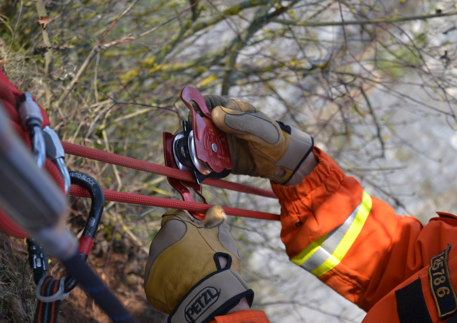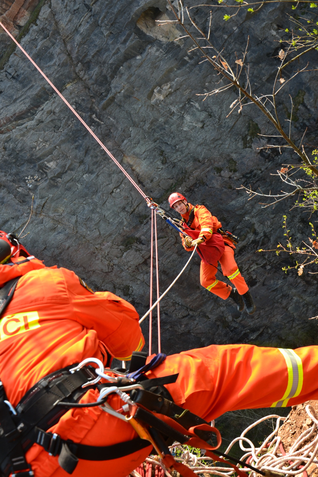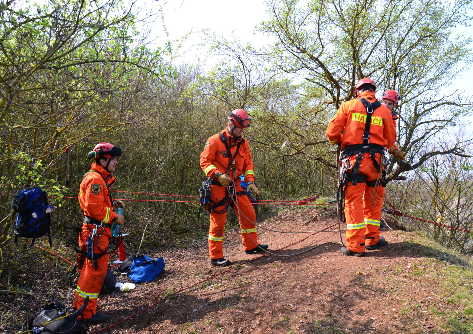 Členové lezeckého družstva si tak mohli vyzkoušet vzájemnou spolupráci při tvoření tohoto poměrně náročného lanového traverzu ve složitém terénu, včetně radiové komunikace.
