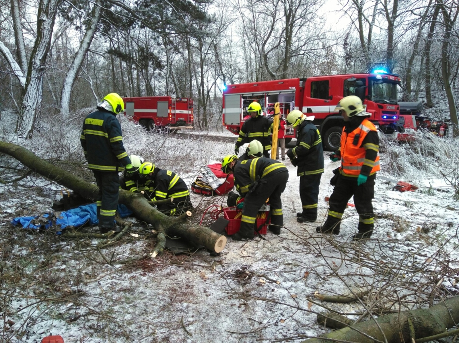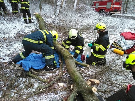 První se na místo dostavila zlonická jednotka, která strom zajistila proti pohybu, odlehčila část stromu odřezáním a osobě poskytovala první pomoc. V tu chvíli se na místo dostavili profesionální hasiči ze Slaného, kteří vysokotlakými pneumatickými vaky strom nadzvedli, pomocí páteřové desky zraněného vyprostili a připravili pro následný transport.
