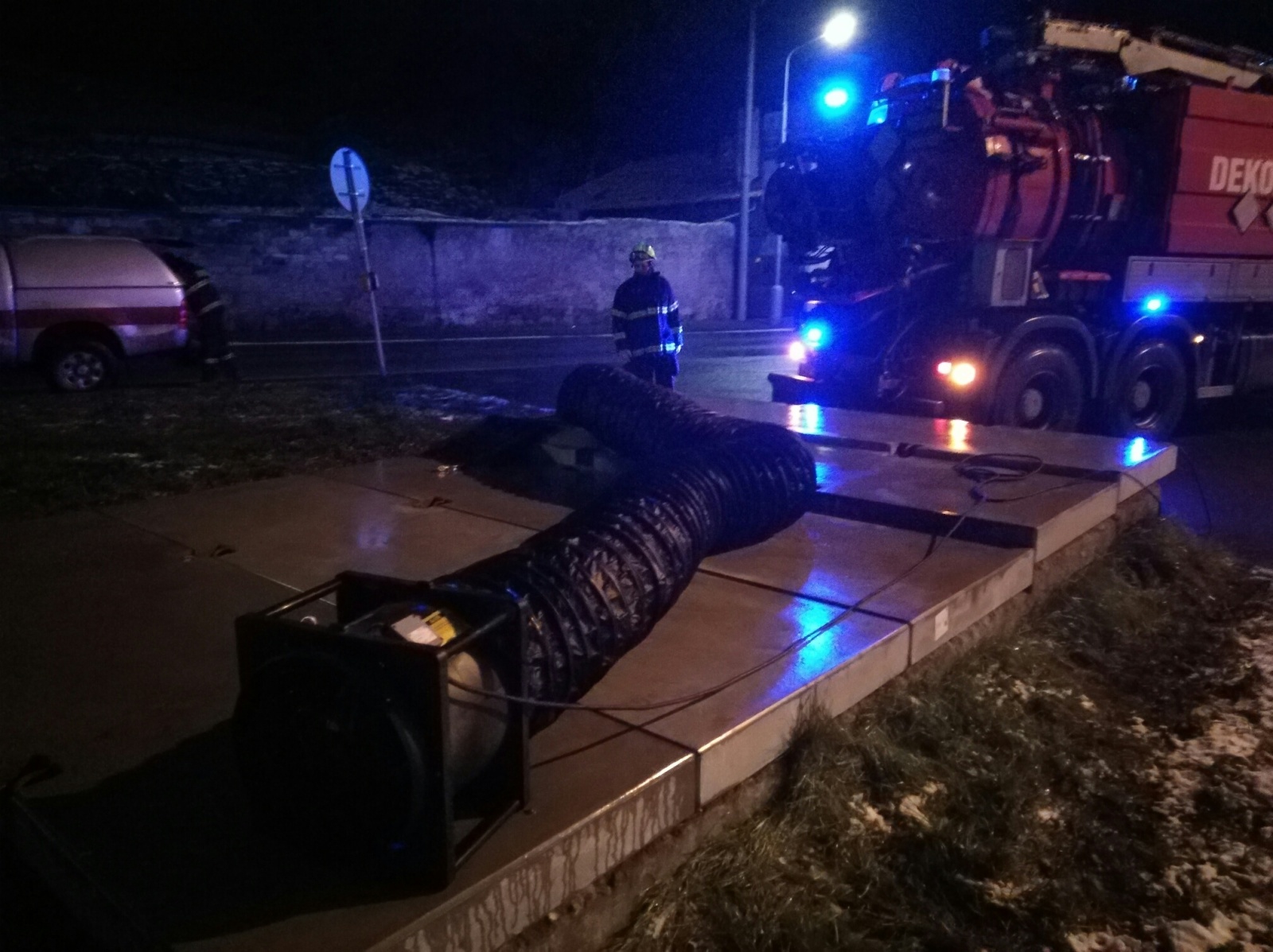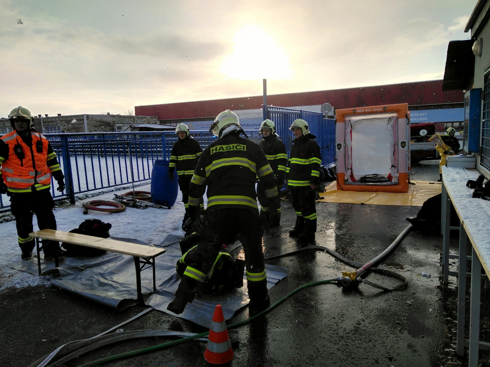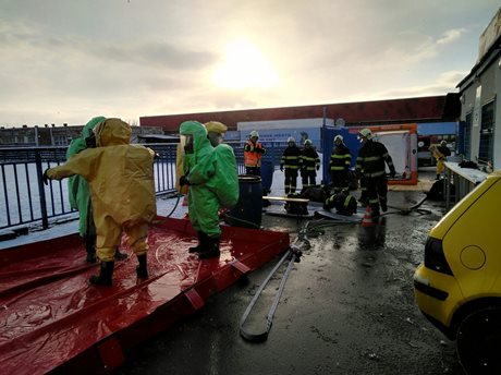 Při manipulaci došlo k pádu naskladněné nebezpečné látky a zasažení jednoho pracovníka, který zůstal zavalený pod barely. První se k události dostavila profesionální jednotka ze Slaného, která na místě postavila provizorní dekontaminační stanoviště a v přetlakových protichemických oblecích provedla průzkum prostoru. Rychlá obhlídka netrvala ani minutu a osoba byla nalezena, dekontaminována a ošetřena.
