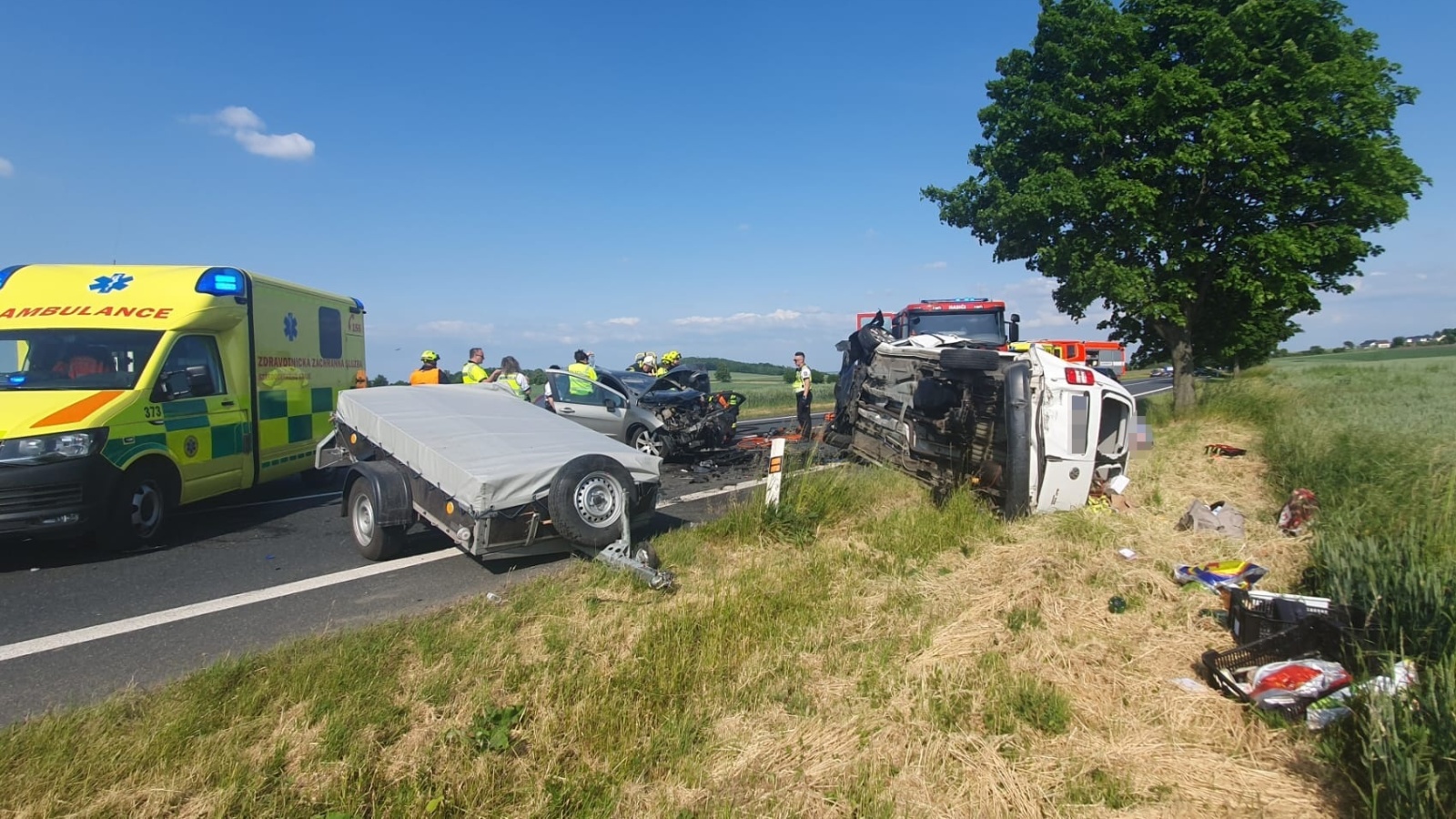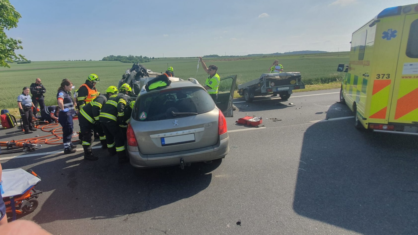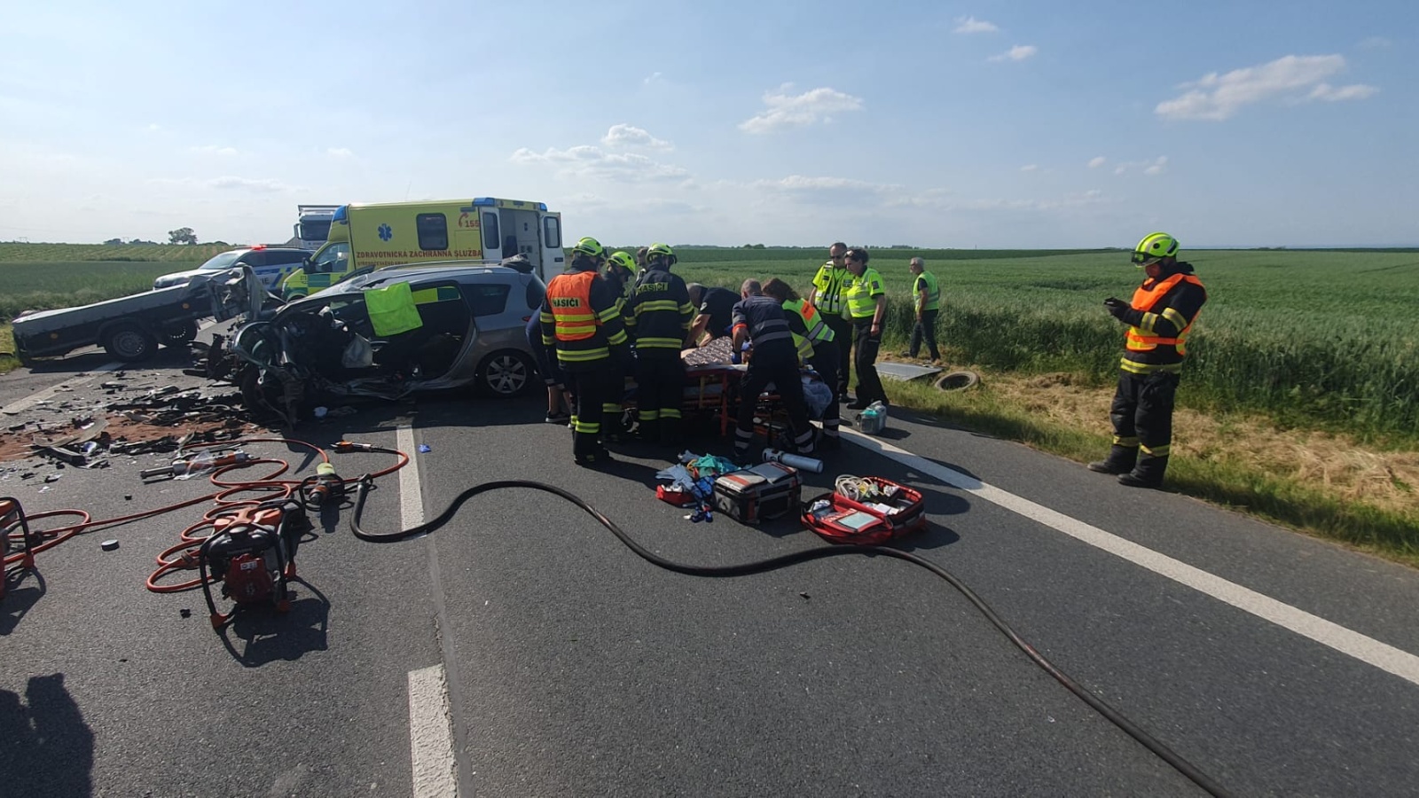 Po příjezdu jednotek na místo bylo upřesněno, že jde o střet dvou osobních automobilů, z nichž jeden táhl přívěsný vozík. Při rychlém průzkumu bylo zjištěno, že se při nehodě zranily tři osoby. Dvě z nich museli hasiči zachránit pomocí hydraulických vyprošťovacích nástrojů. Transport pacientů do nemocnic zajistily po nezbytném ošetření dvě letecké záchranné služby a jedna pozemní posádka.