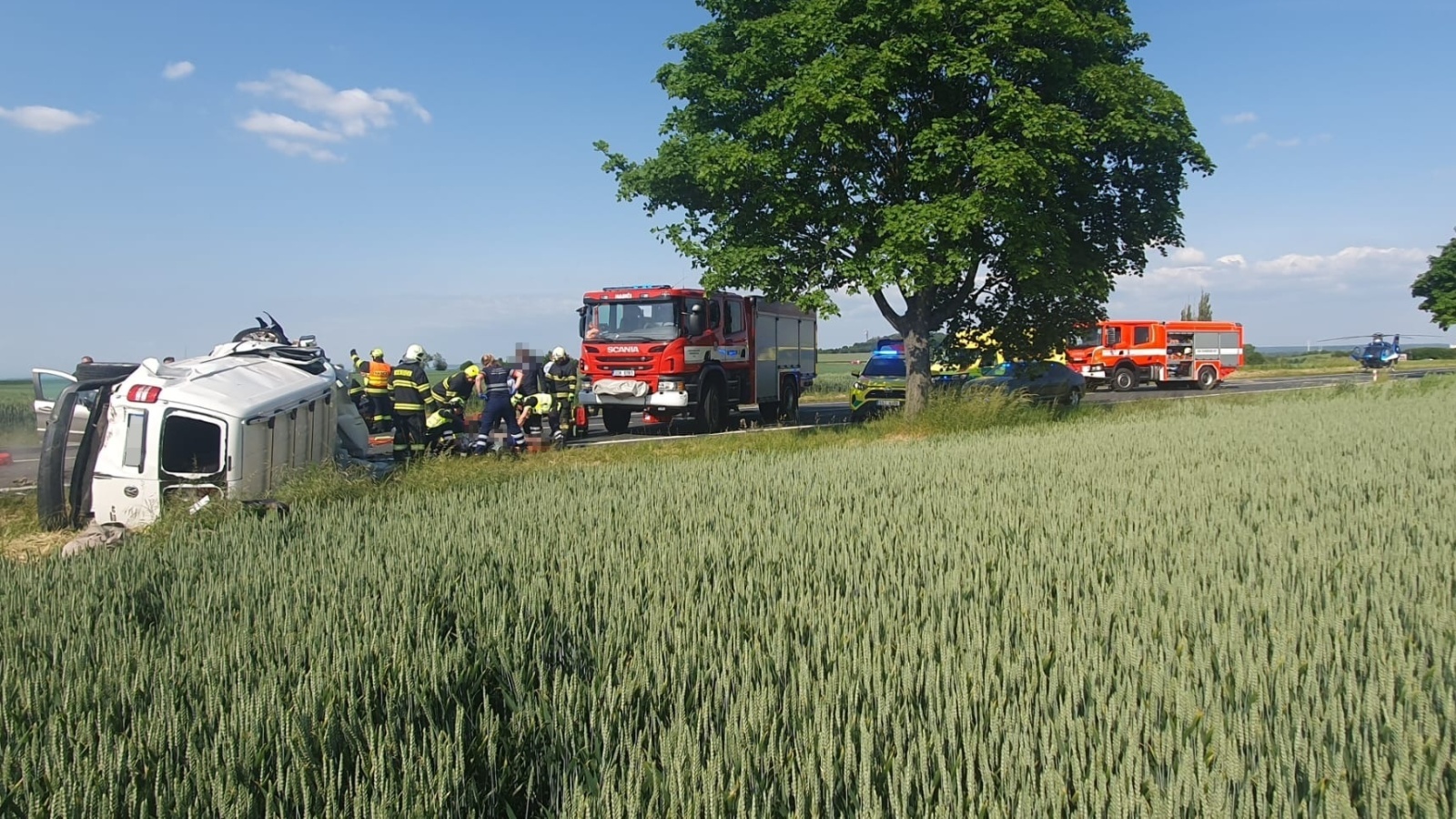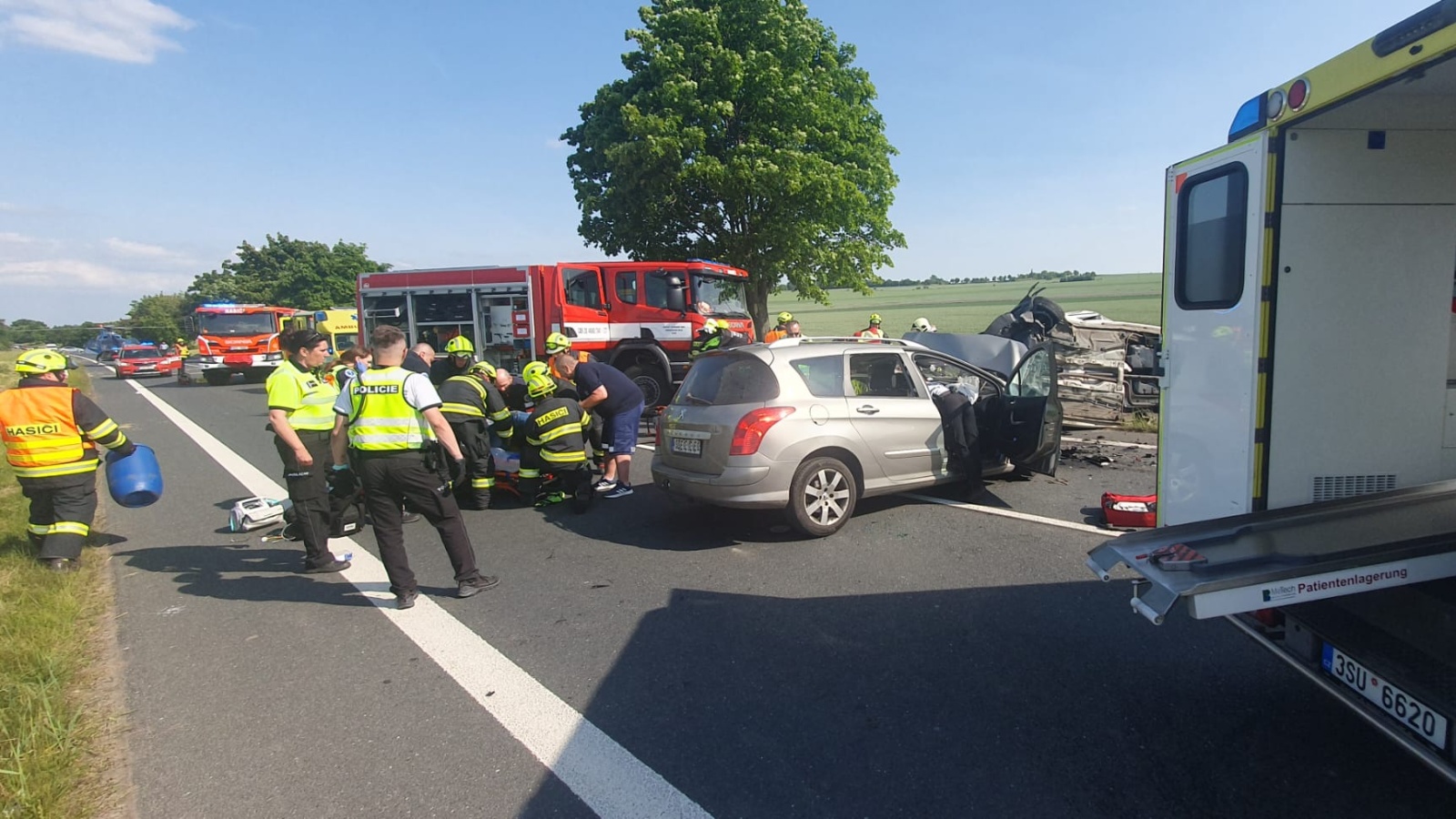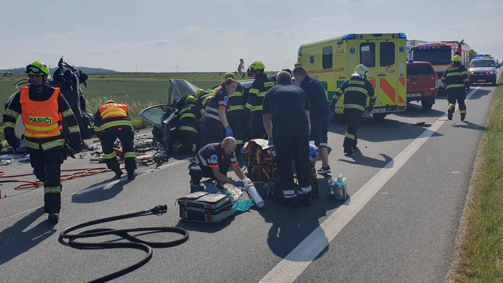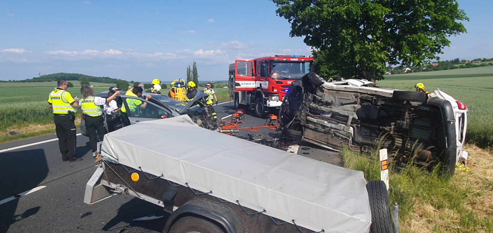 Po příjezdu jednotek na místo bylo upřesněno, že jde o střet dvou osobních automobilů, z nichž jeden táhl přívěsný vozík. Při rychlém průzkumu bylo zjištěno, že se při nehodě zranily tři osoby. Dvě z nich museli hasiči zachránit pomocí hydraulických vyprošťovacích nástrojů. Transport pacientů do nemocnic zajistily po nezbytném ošetření dvě letecké záchranné služby a jedna pozemní posádka.