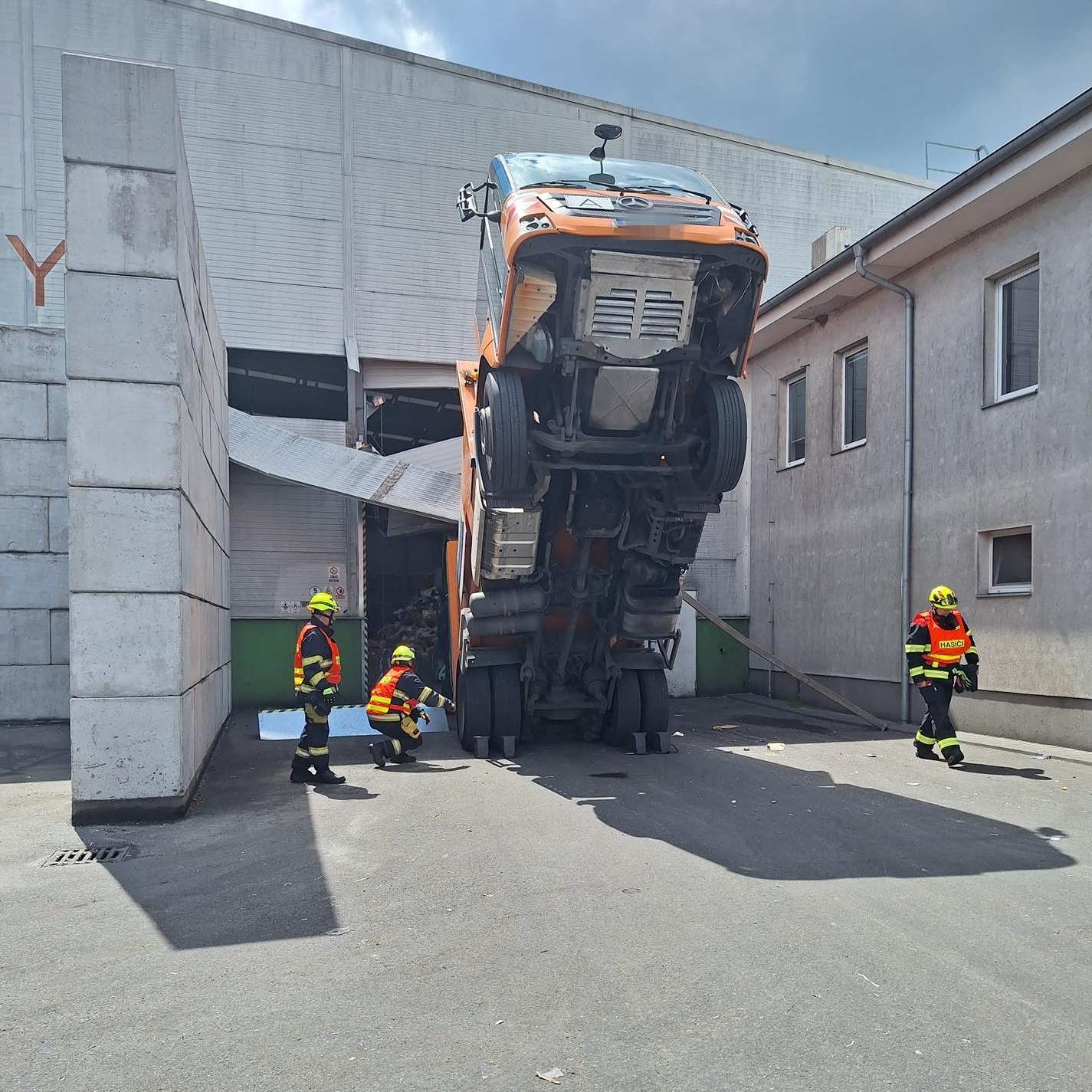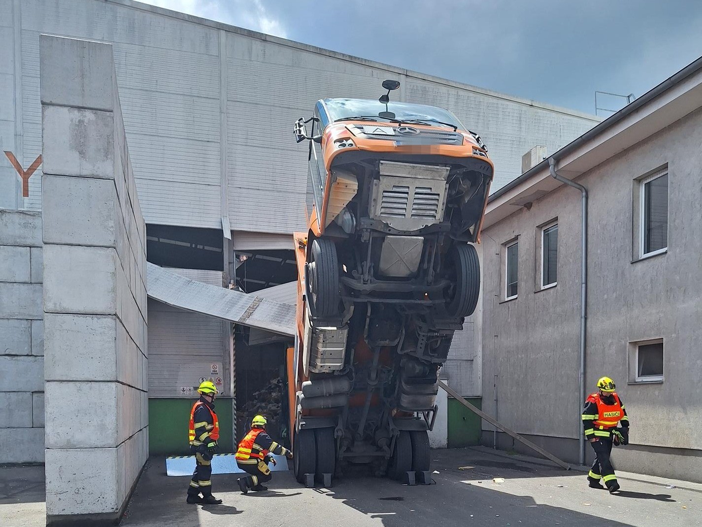 Podle dostupných informací se nákladní vůz pokusil vjet do automatických vrat haly, avšak jejich mechanismus náhle selhal – nebo naopak zafungoval příliš dobře. Vratová konstrukce se totiž spustila tak nešťastně, že zachytila přední část vozidla a doslova ho nadzvedla do vzduchu. Přední kola se odlepila od země, zadní zůstala na zemi – výsledkem bylo auto ve „výklusu“ zavěšené několik metrů nad zemí. Uvnitř seděl šokovaný řidič, bez možnosti bezpečně vystoupit.