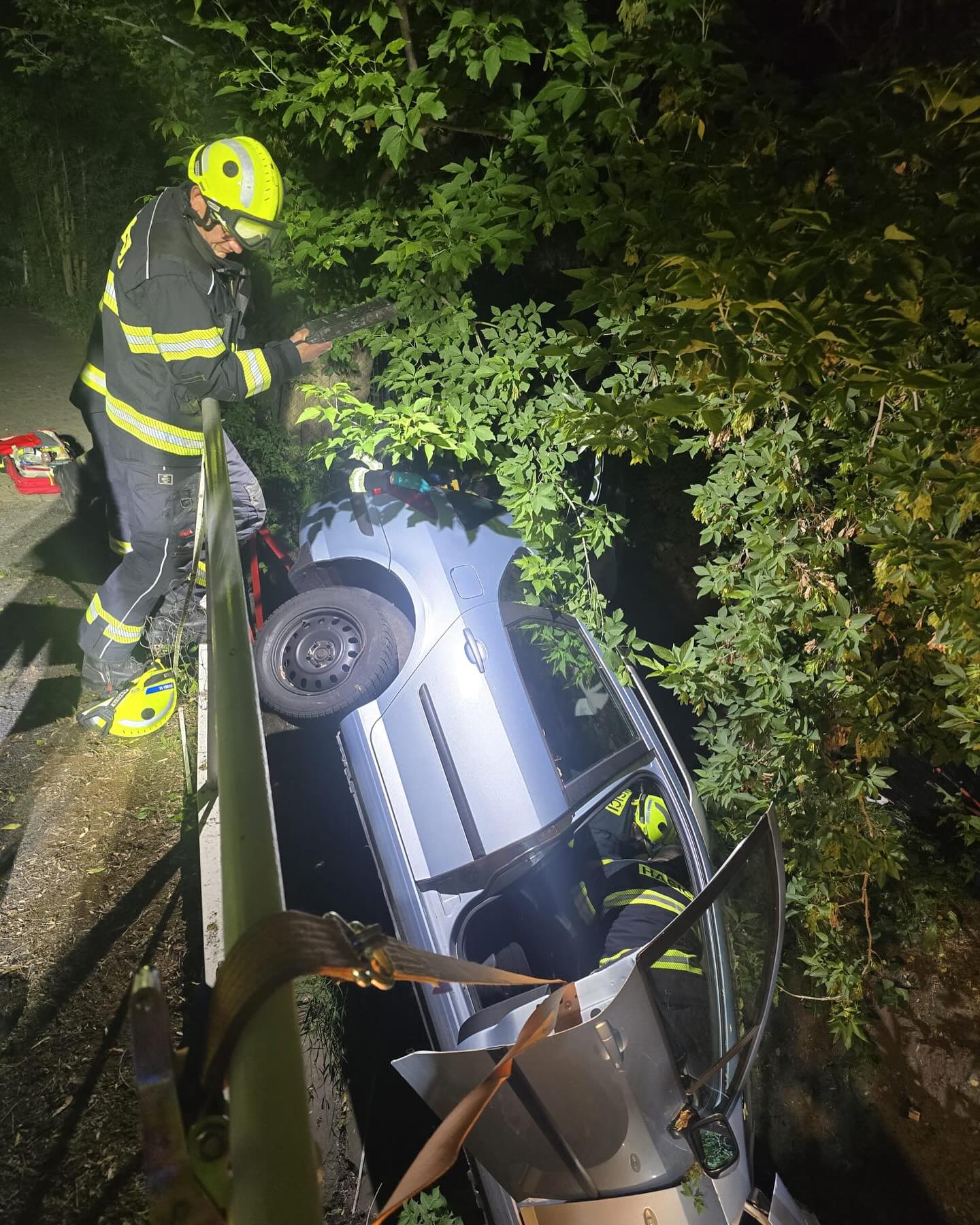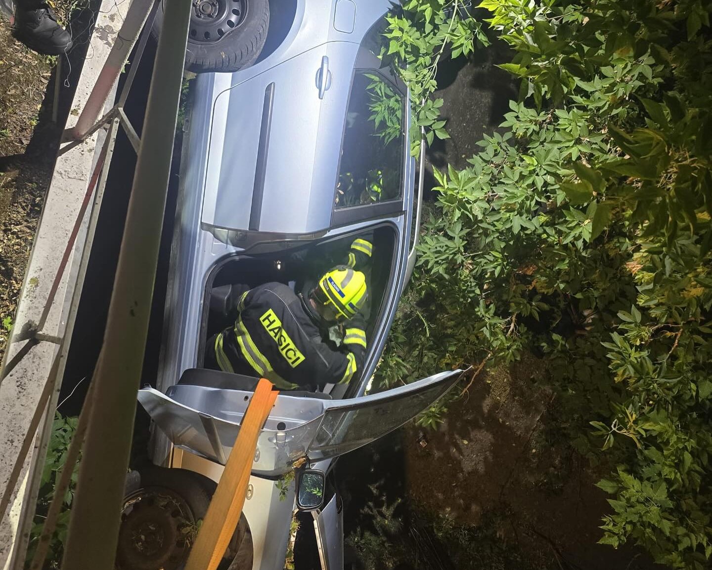 Kladno – V úterý 27. května ve 23:41 zažili kladenští hasiči napínavý zásah, jaký se nevidí každý den. V městské části Dubí došlo k dopravní nehodě, při níž osobní automobil skončil převrácený na boku v příkopu u silničního mostku. Nehoda si vyžádala složitý zásah, pečlivé technické manévry a půlhodinový boj o bezpečné vyproštění zraněného člověka, který uvázl v kabině vozidla.