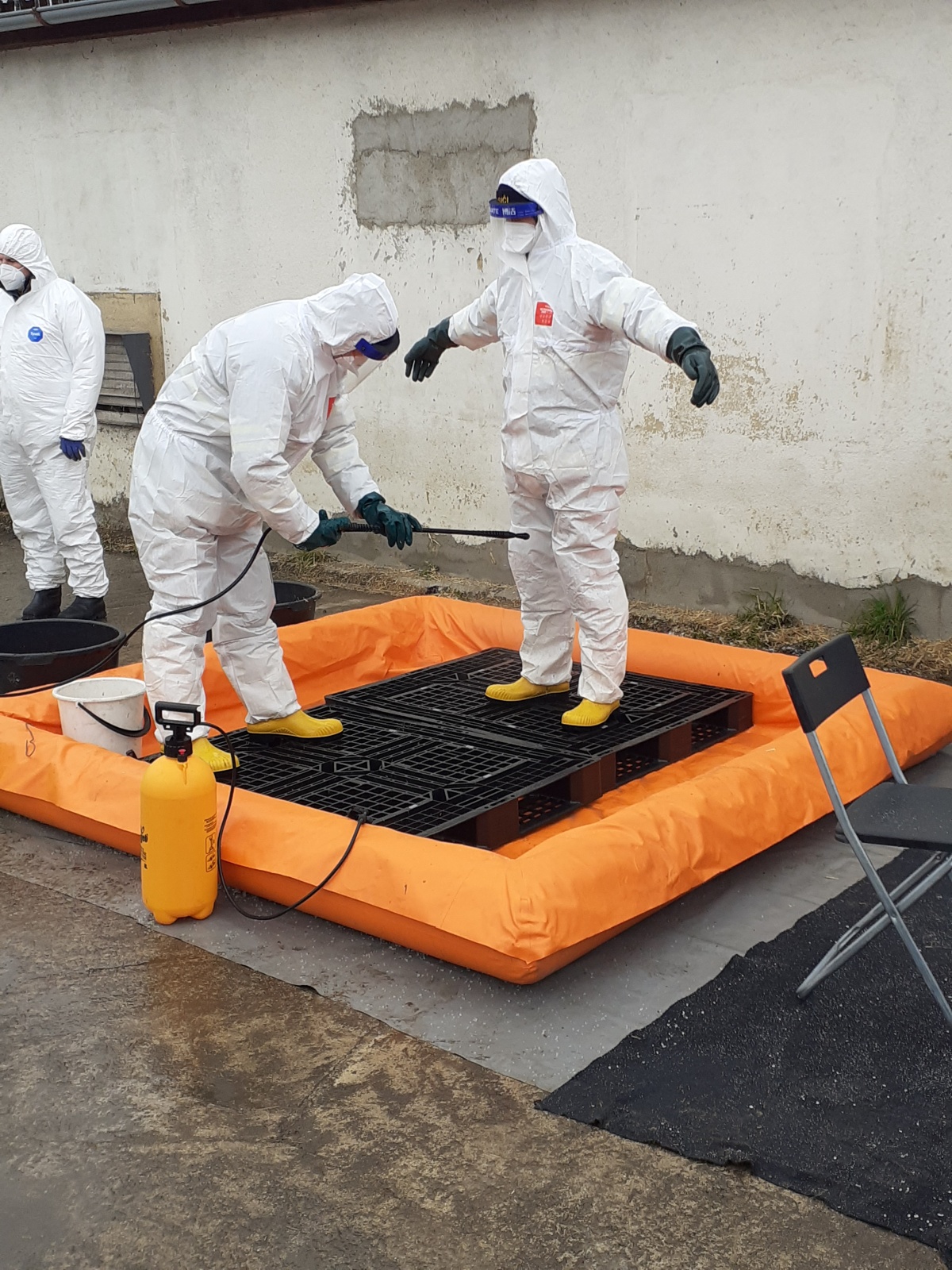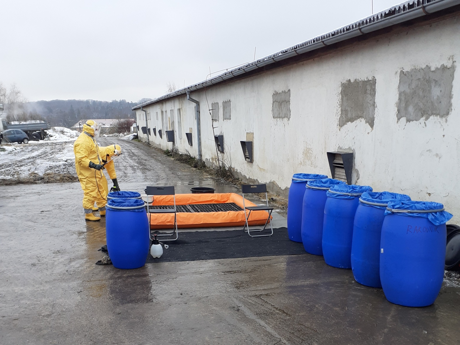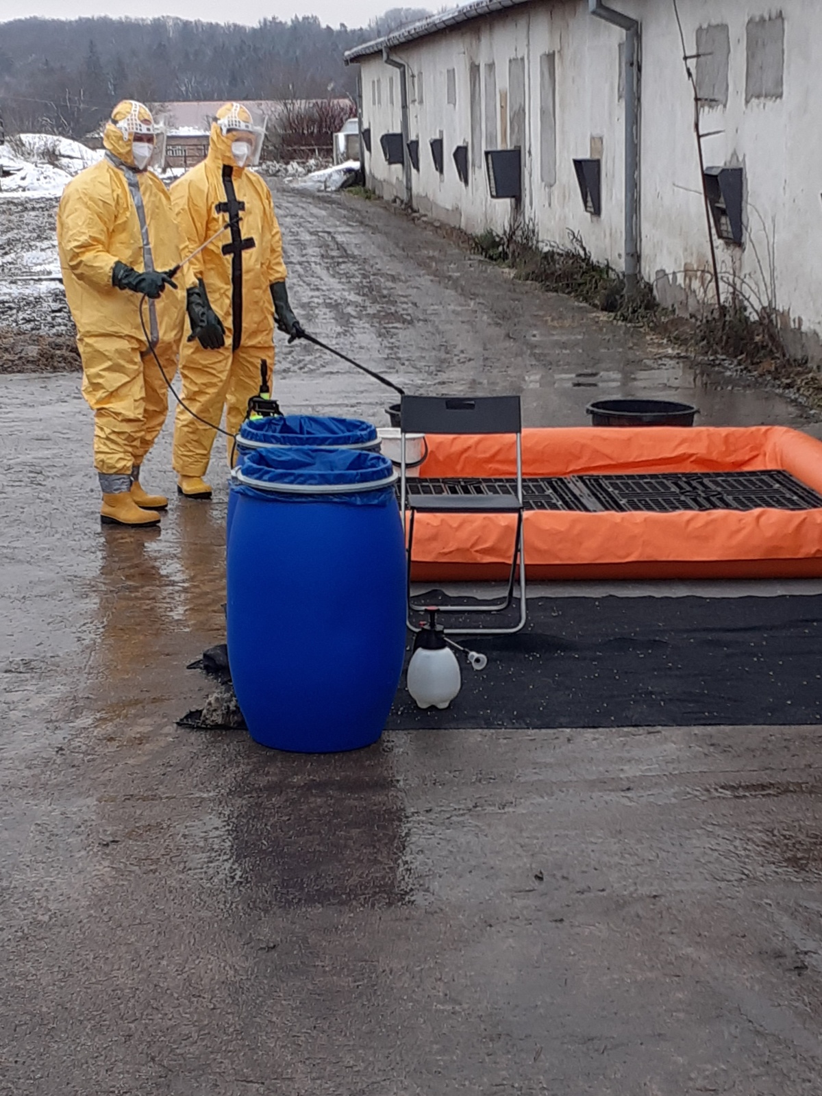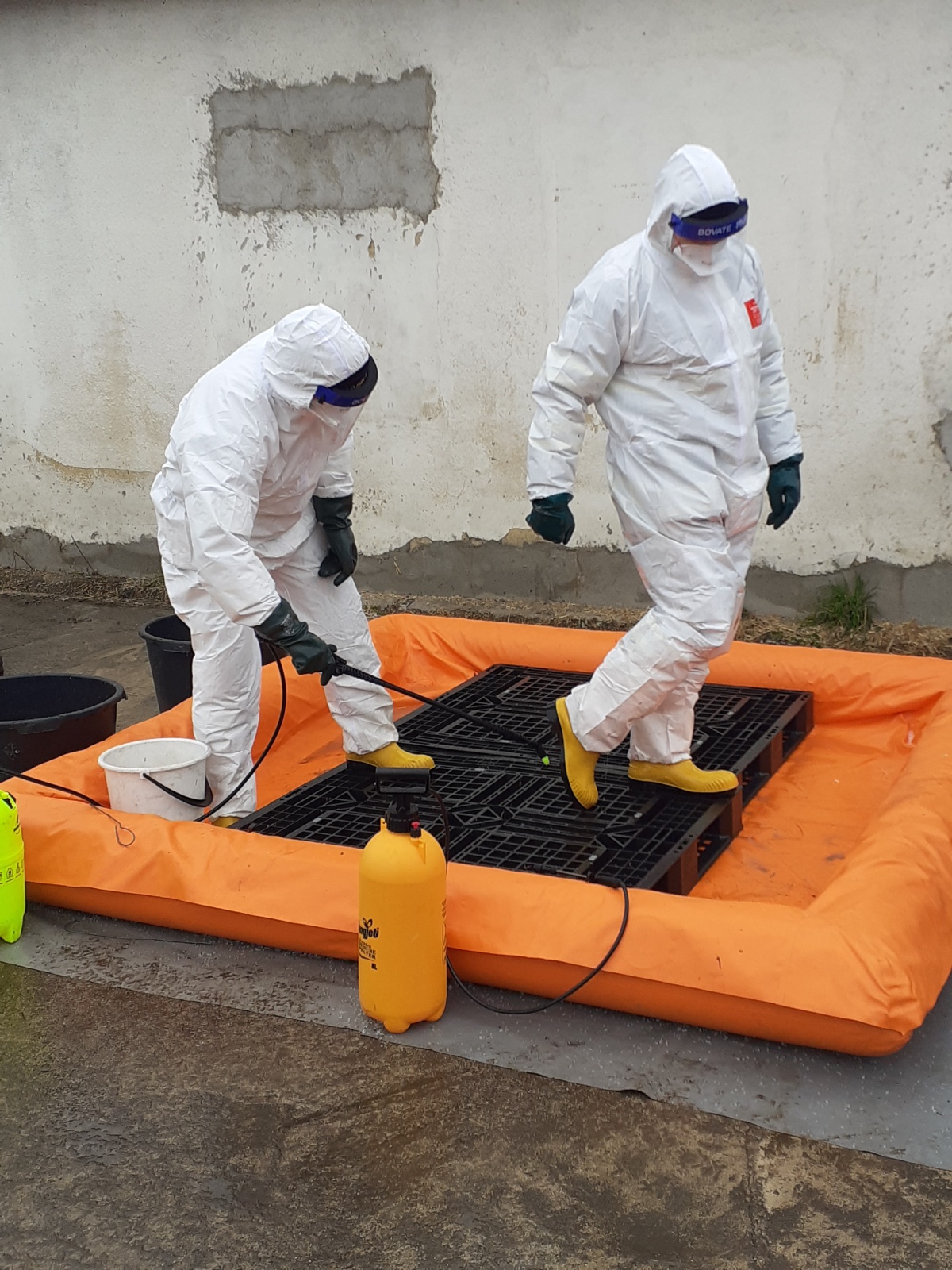 Nejdříve byla vybudována dekontaminační stanoviště, a to jednak pro zasahující a také pro techniku, která se na likvidaci podílela. Veterinární správa na místo zajistila čtyři kontejnery, ve kterých mělo dojít k usmrcování kachen.