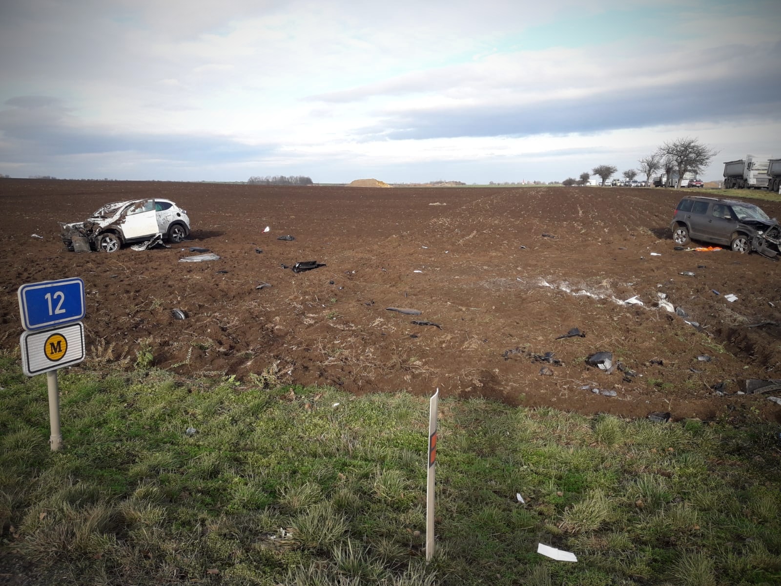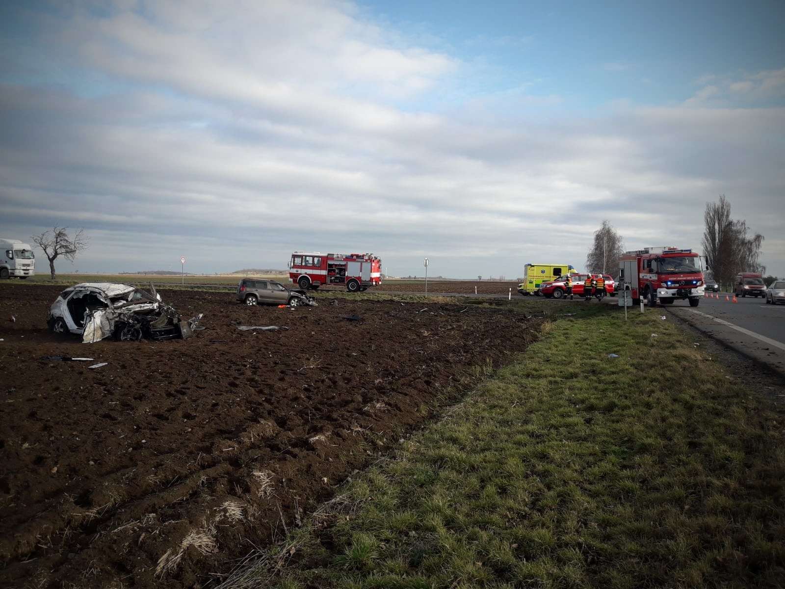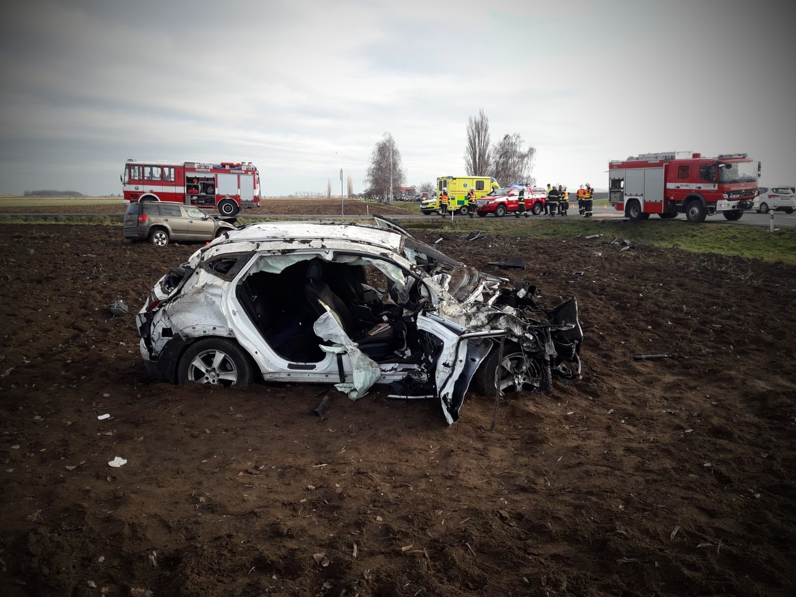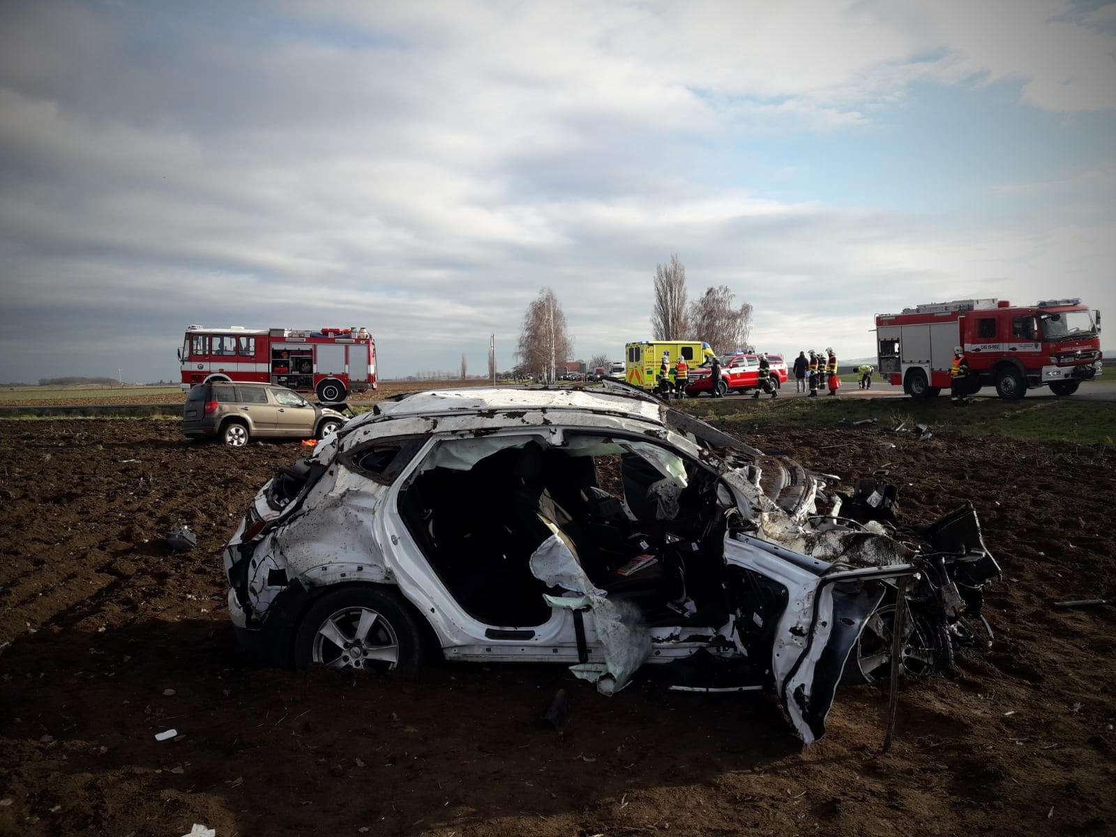Následkem nehody se obě auta převrátila přes střechu a skončila na kolech v poli. V každém voze zůstal zaklíněný řidič v bezvědomí....