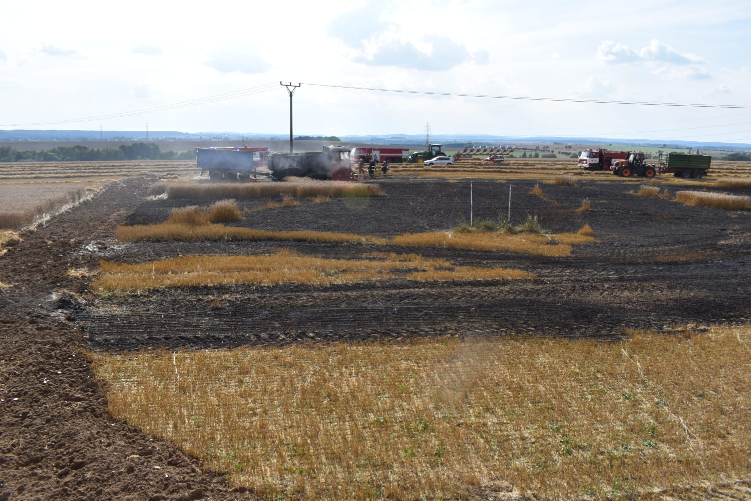 První jednotka byla na místě za osm minut od ohlášení události. Velitel zásahu potvrdil požár nákladní soupravy plně naložené právě sklizeným zrnem a také části pole se vzrostlým obilím na ploše cca 30x30 metrů. Požár vozidla byl lokalizován za necelou čtvrthodinu jedním vysokotlakým a jedním C proudem, na dohašení pak byla použita pěna. Hořící pole hasiči dohasili po několika minutách pomocí dvou C proudů. Celý zásah probíhal v dýchací technice. Dalšímu šíření plamenů do porostu pomohlo i oborání části pole.