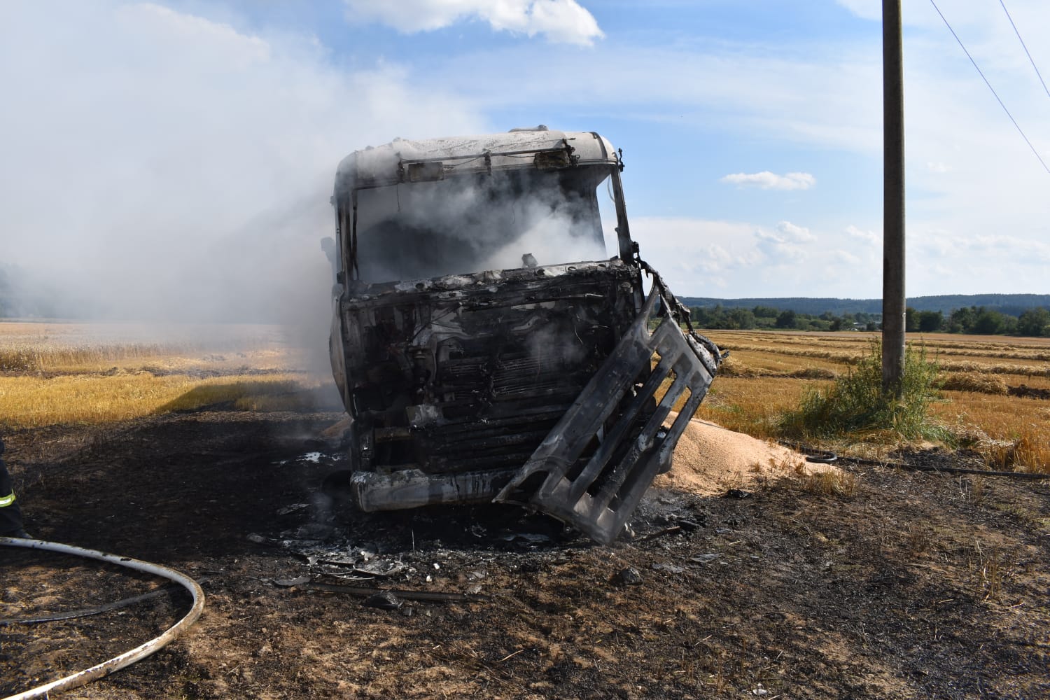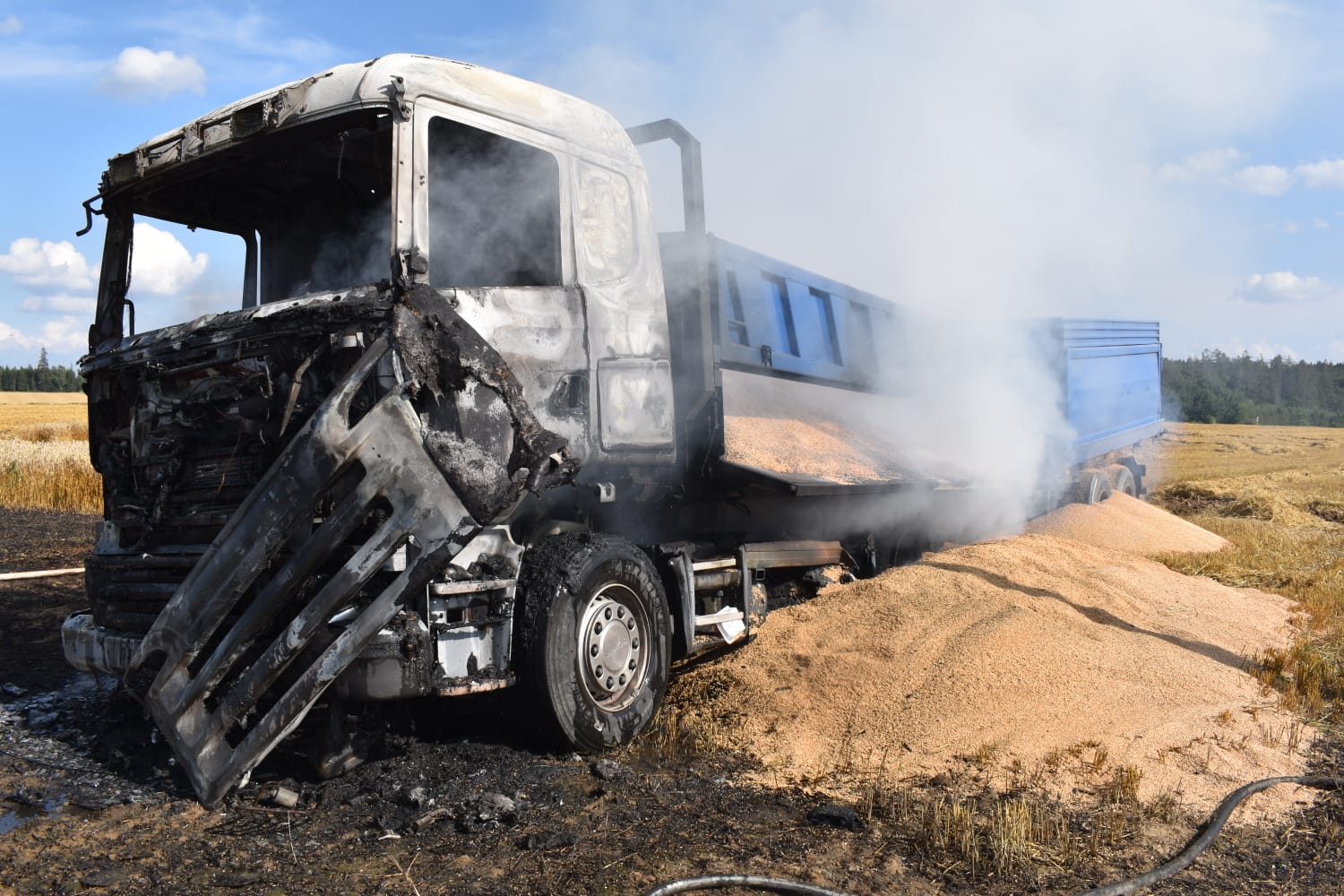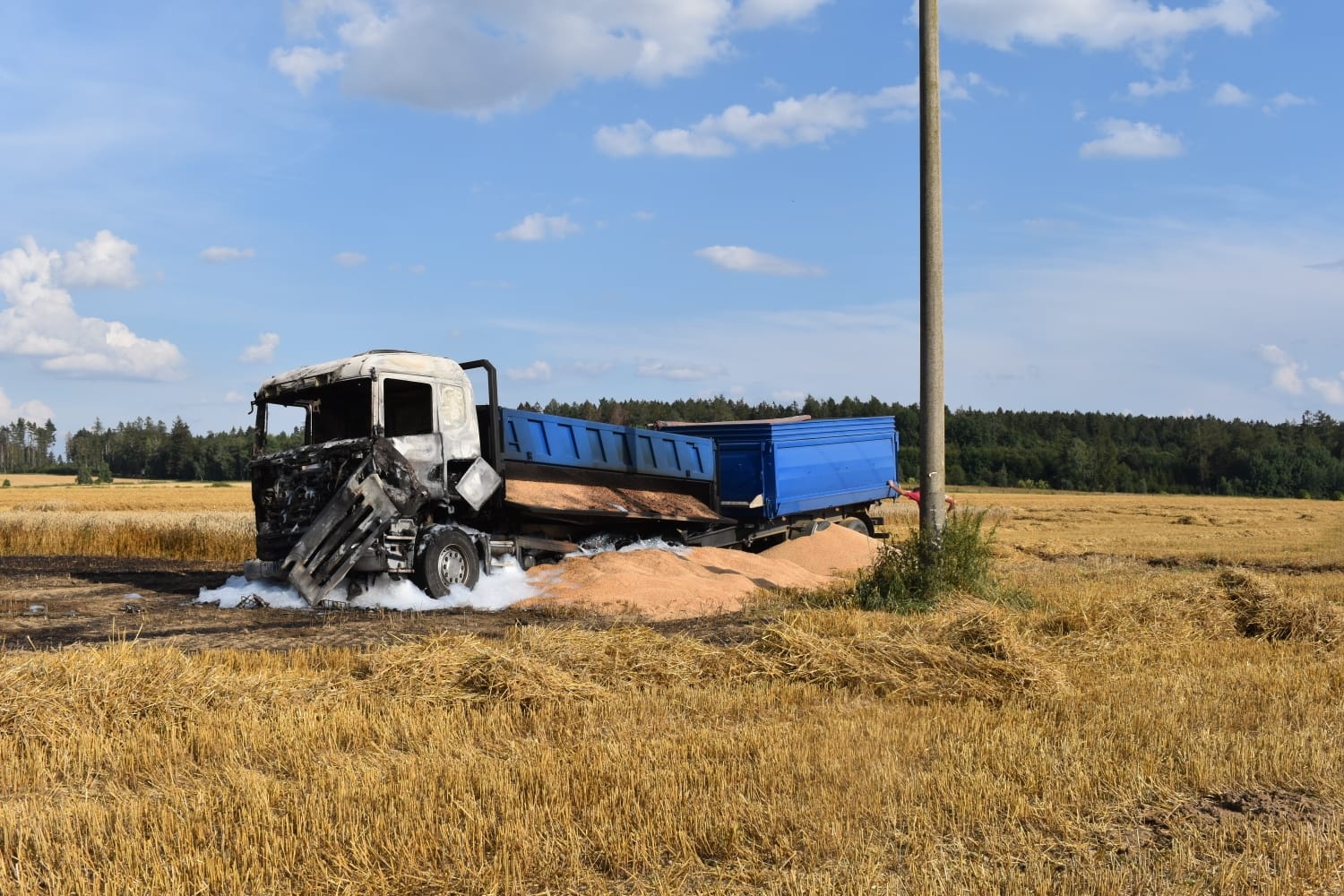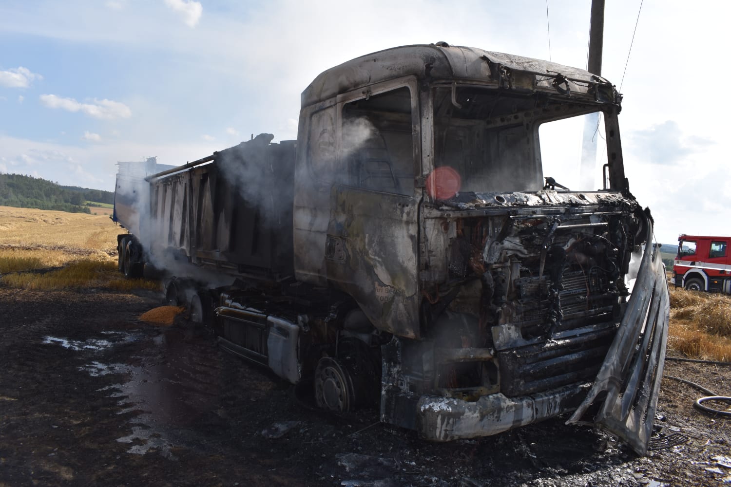 V pondělí 17. srpna dvě minuty po šestnácté hodině přijala tísňová linka středočeských hasičů informaci o požáru nákladního automobilu naloženého obilím na poli v katastru obce Onomyšl nedaleko Uhlířských Janovic.