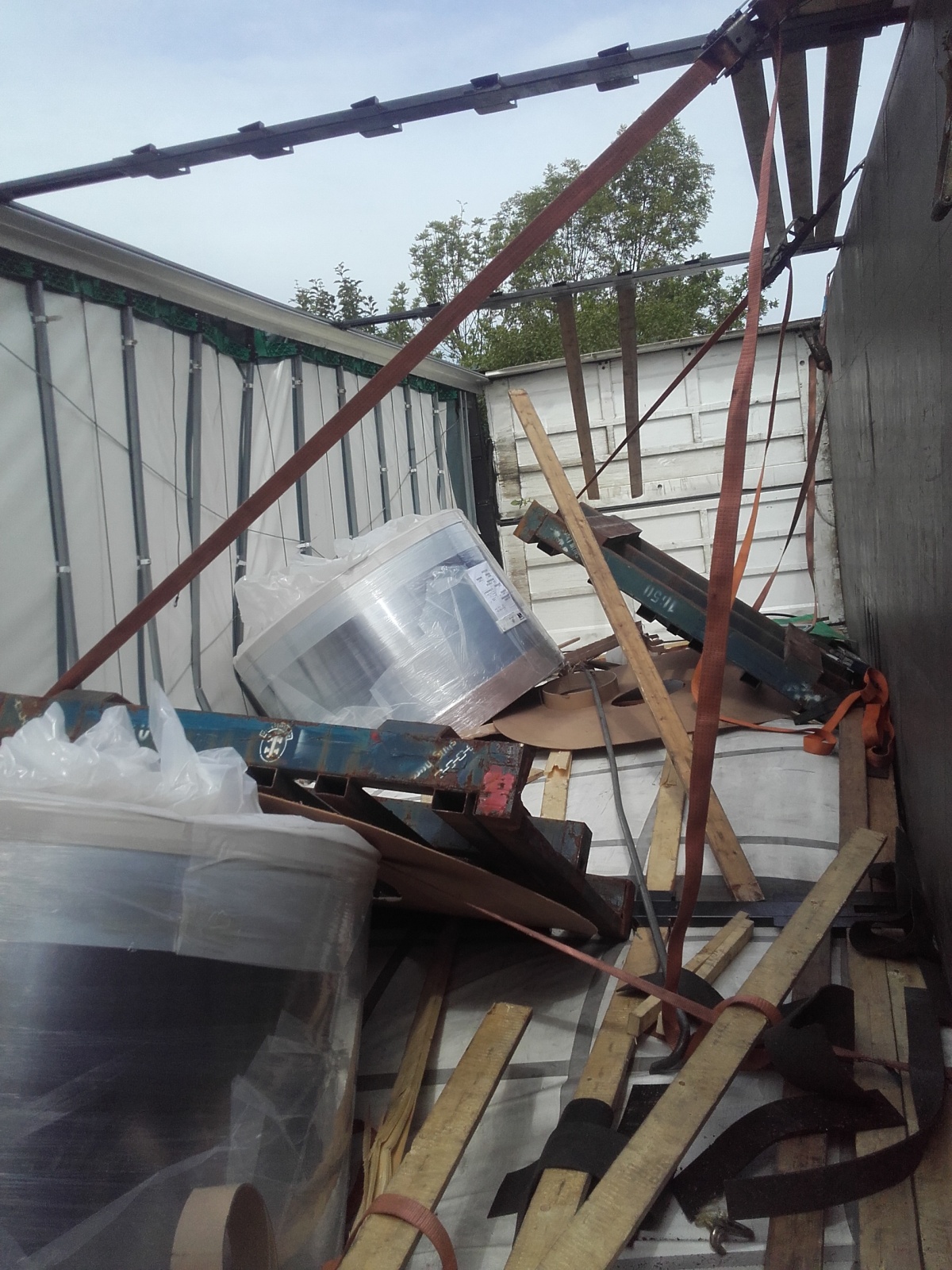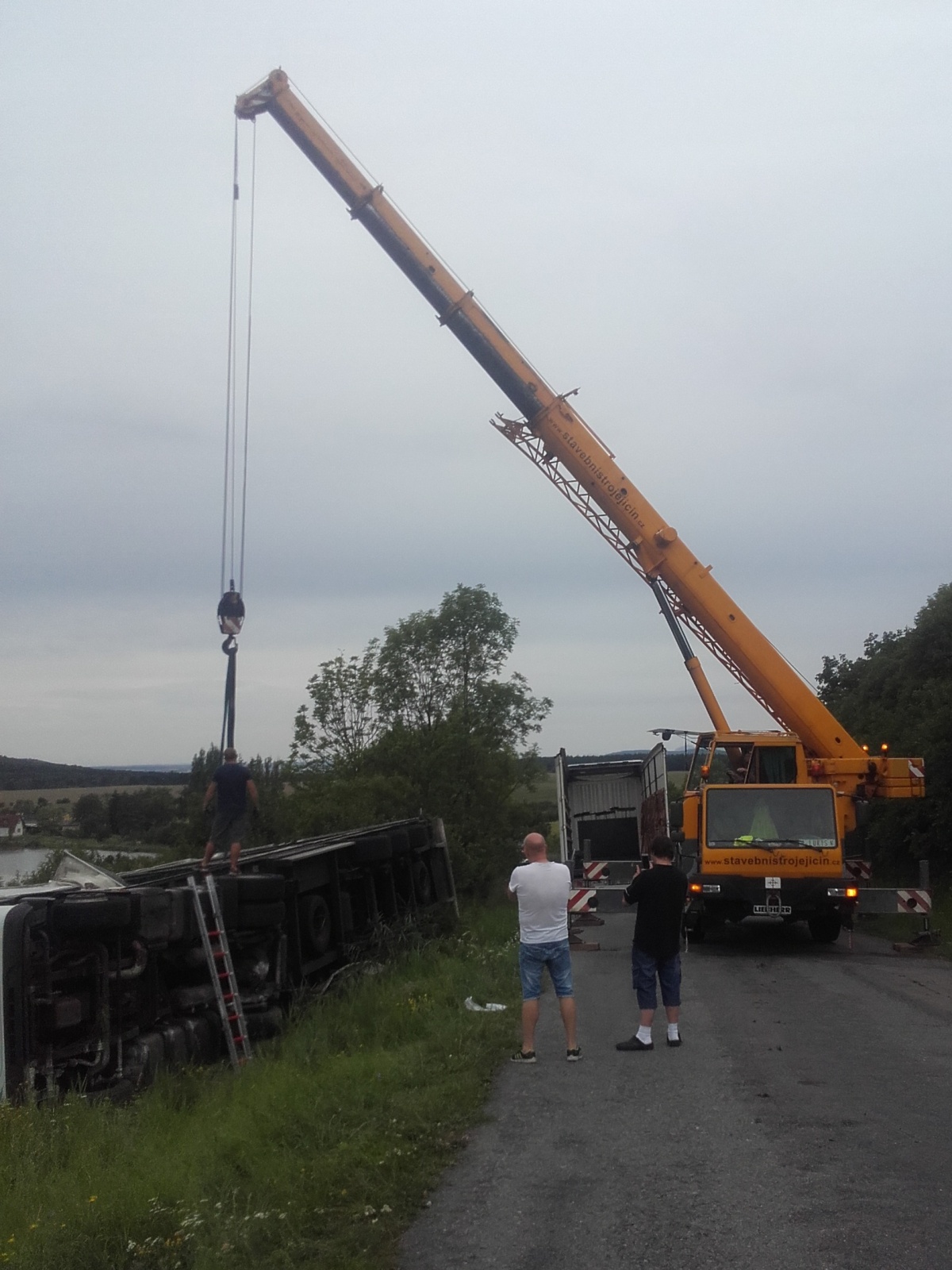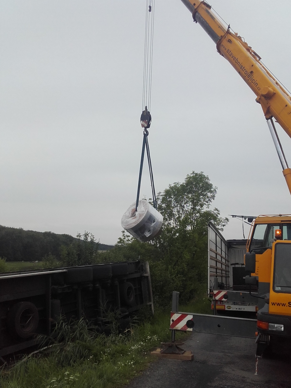 Po příjezdu jednotky na místo bylo zjištěno, že jde o havárii tahače s návěsem, který skončil převrácený na boku na louce vedle silnice a řidič se už nachází mimo vozidlo. Dále bylo zjištěno, že na návěsu byly převáženy dva svitky válcovaného plechu o hmotnosti 10 a 12 tun. Hasiči zastavili únik nafty a na celé soupravě udělali protipožární opatření.
