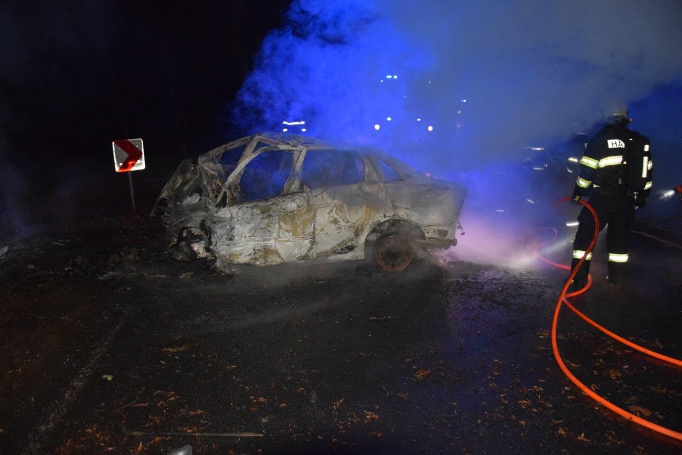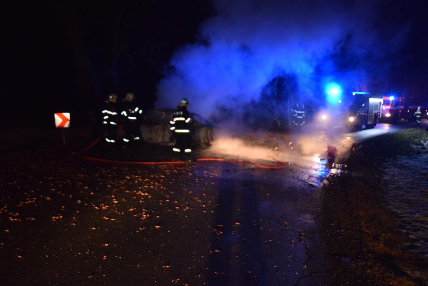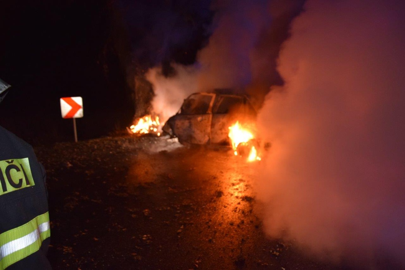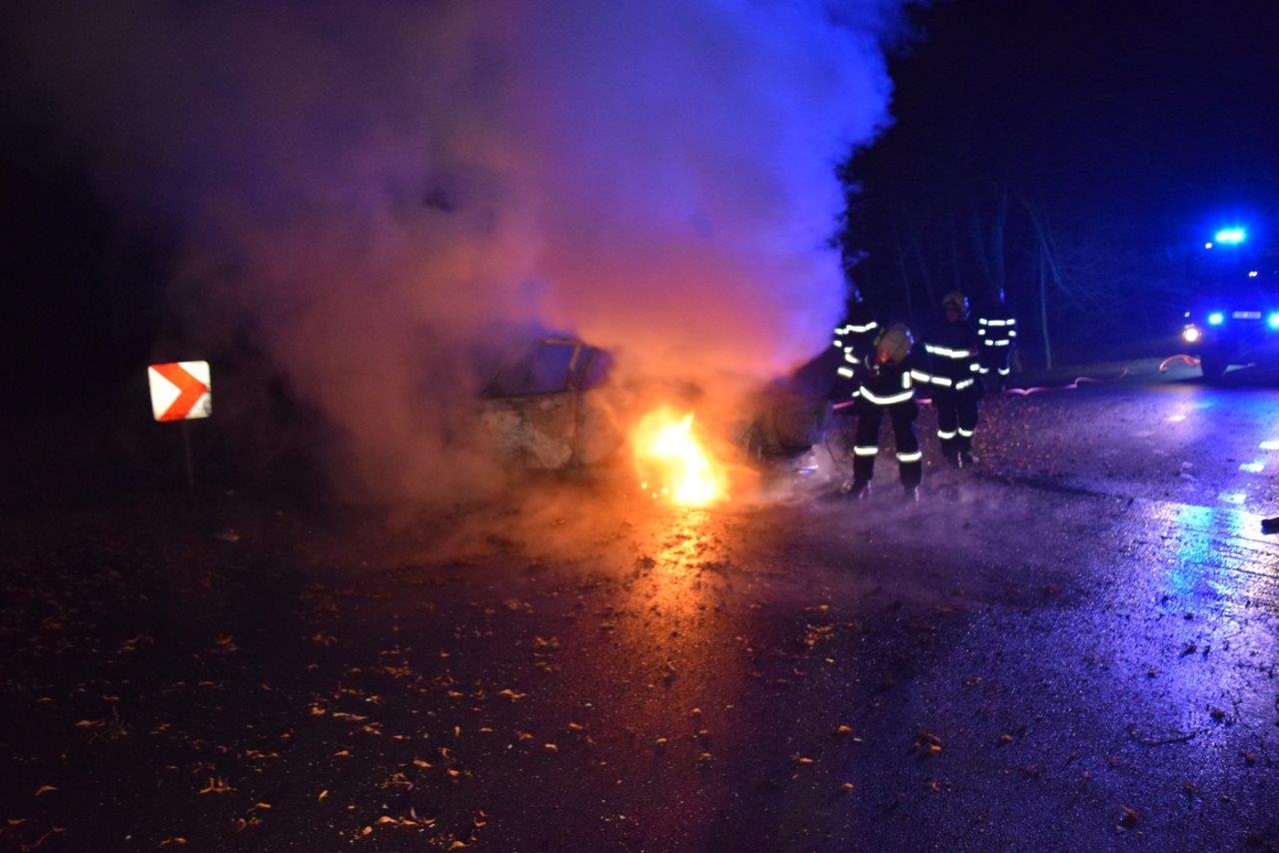 Po příjezdu na místo události bylo průzkumem zjištěno, že se pravděpodobně jedná o havárii osobního auta, které po nárazu do stromu začalo hořet. Automobil byl v tuto dobu už celý zasažený požárem a jednotka se kromě zdolávání požáru vysokotlakem soustředila na vyhledávání osob v okolí vozidla.