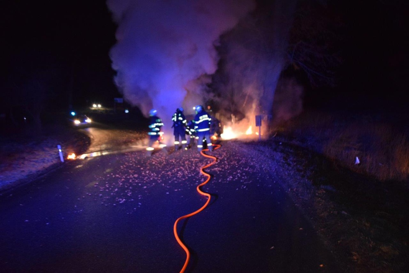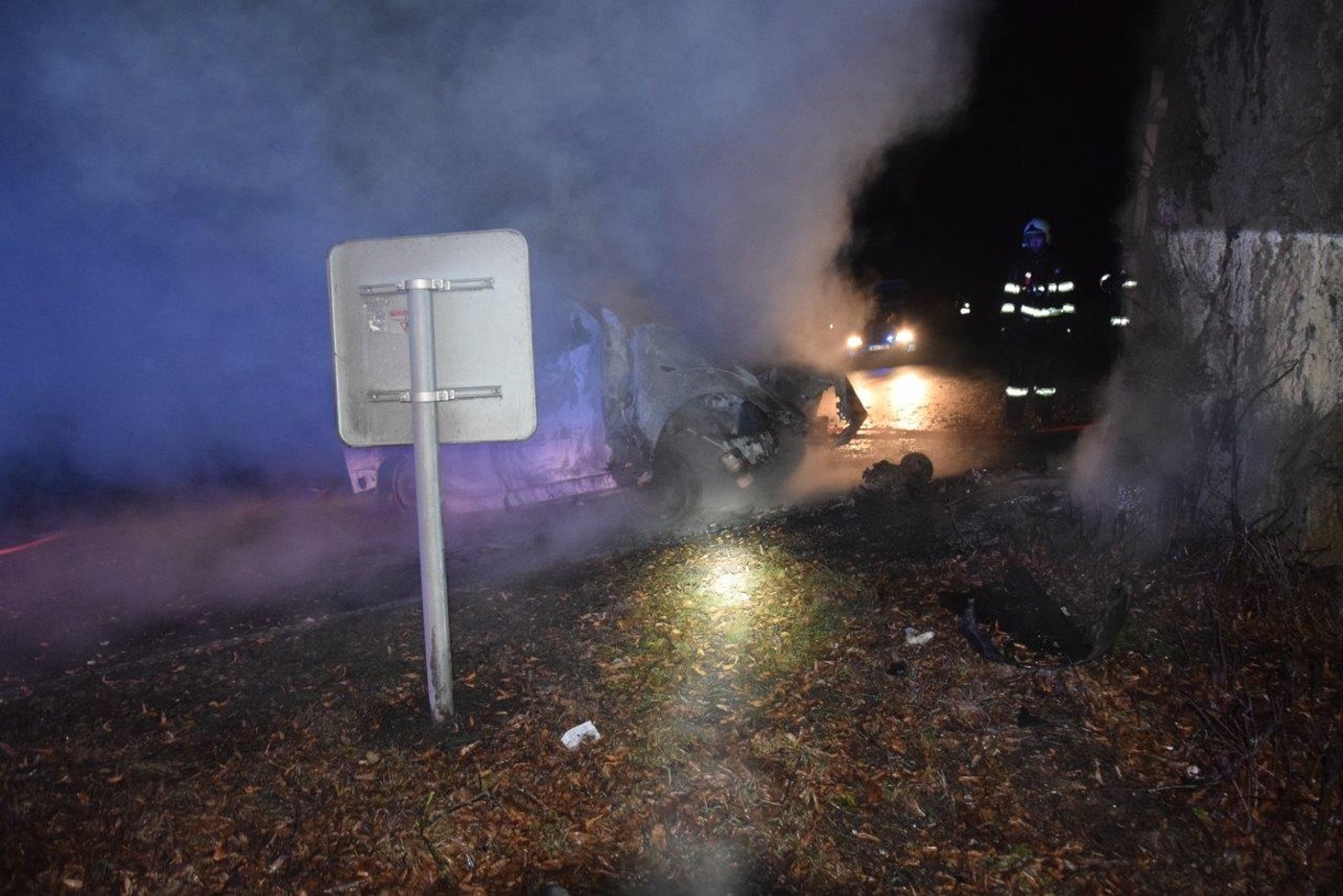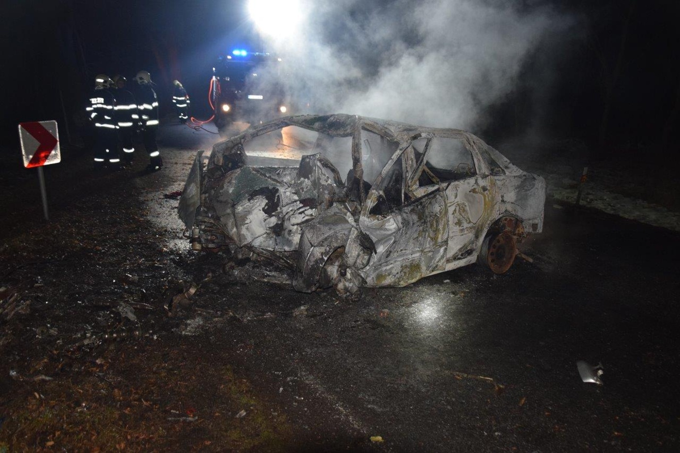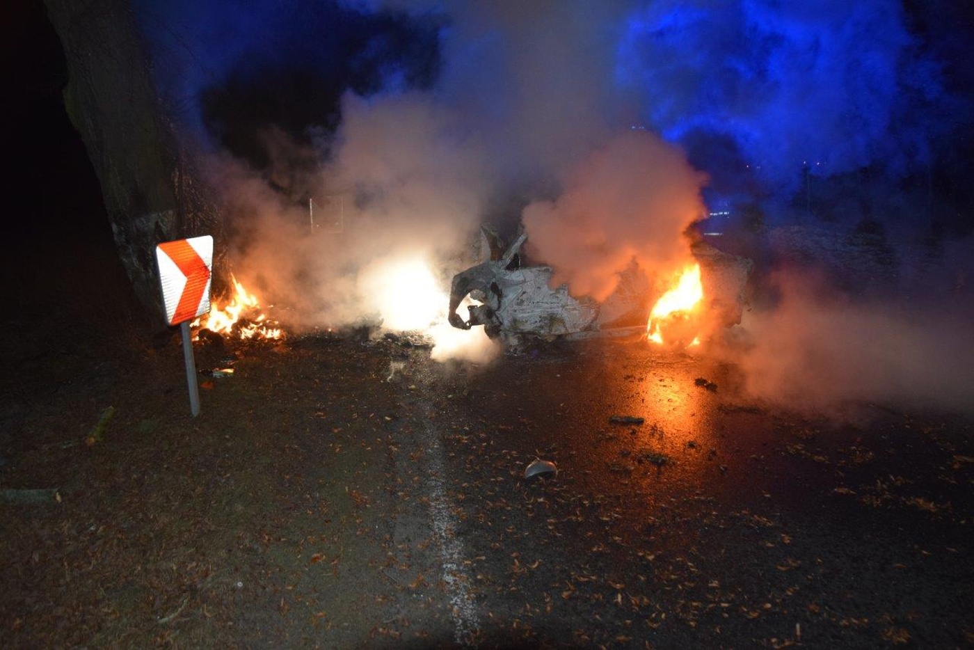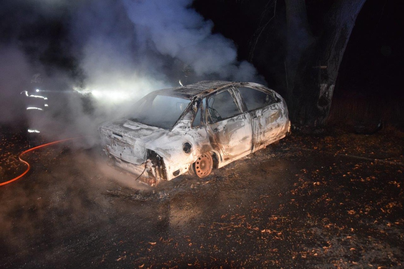 Po příjezdu na místo události bylo průzkumem zjištěno, že se pravděpodobně jedná o havárii osobního auta, které po nárazu do stromu začalo hořet. Automobil byl v tuto dobu už celý zasažený požárem a jednotka se kromě zdolávání požáru vysokotlakem soustředila na vyhledávání osob v okolí vozidla.