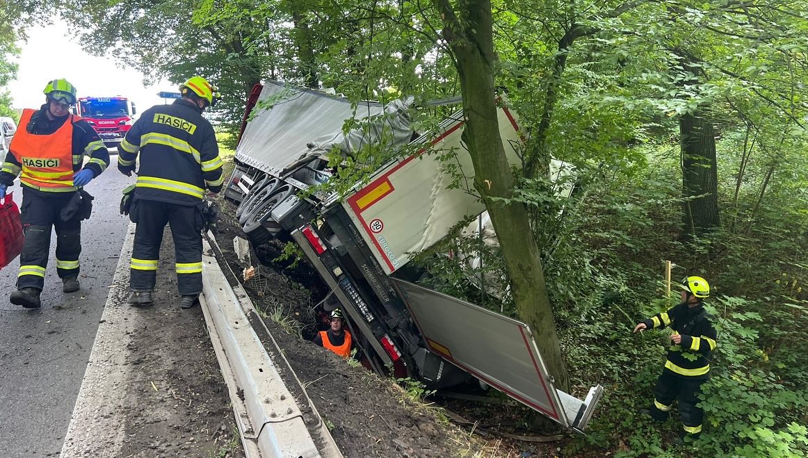 Nákladní auto se pšenicí skončilo v příkopu, hasiči zabránili úniku nafty
