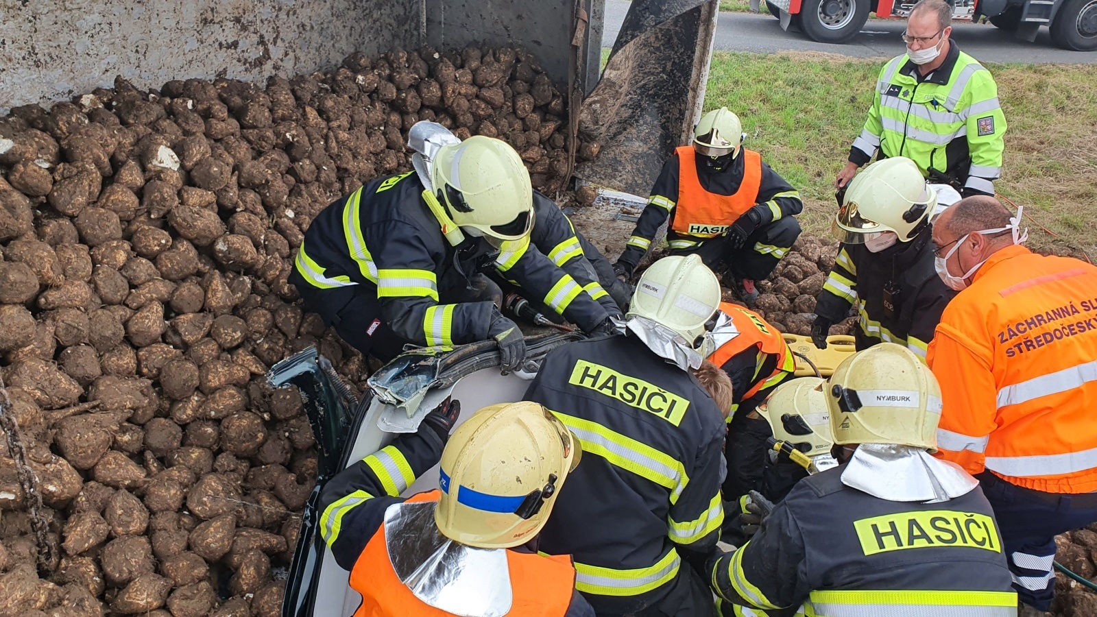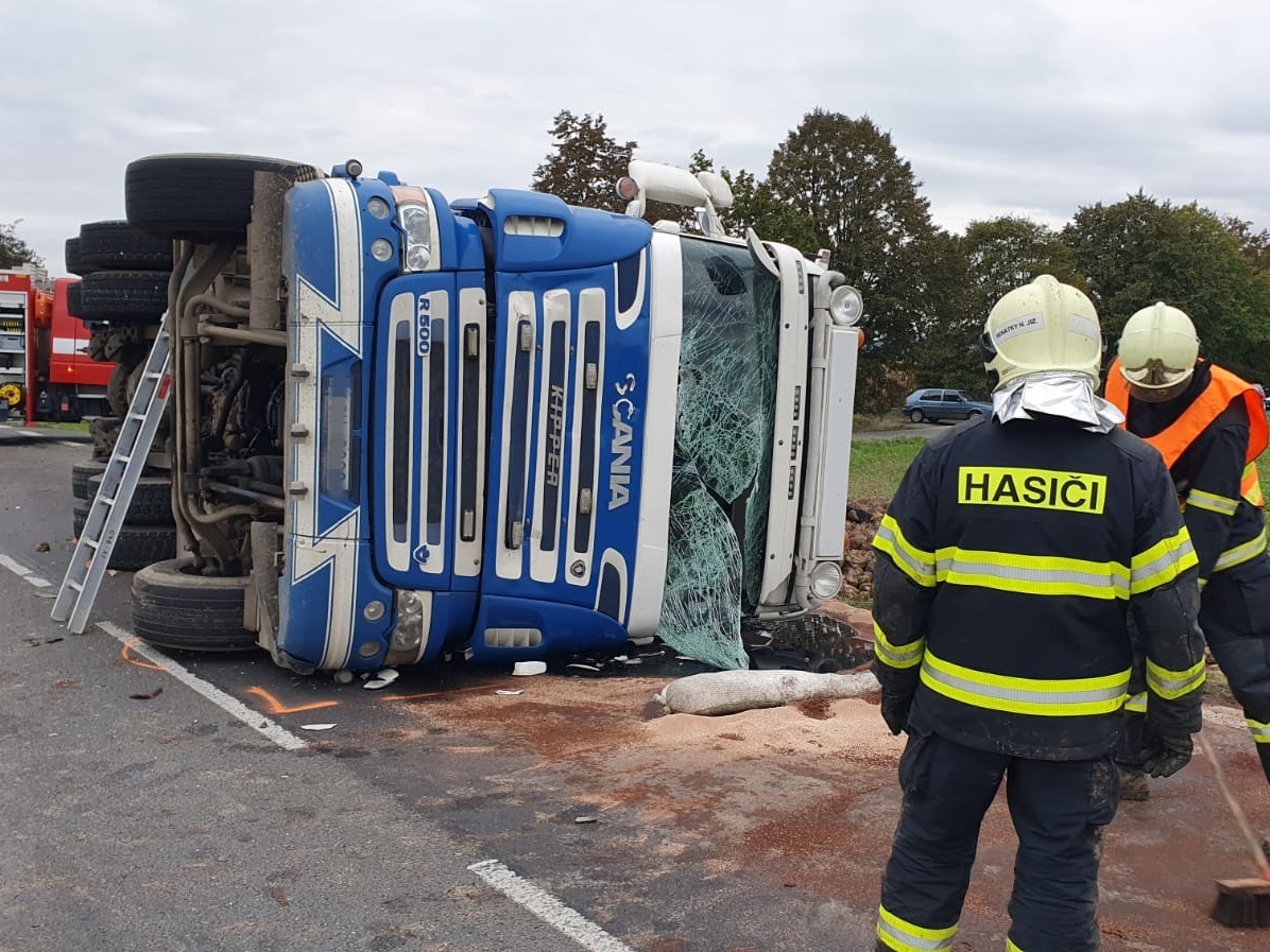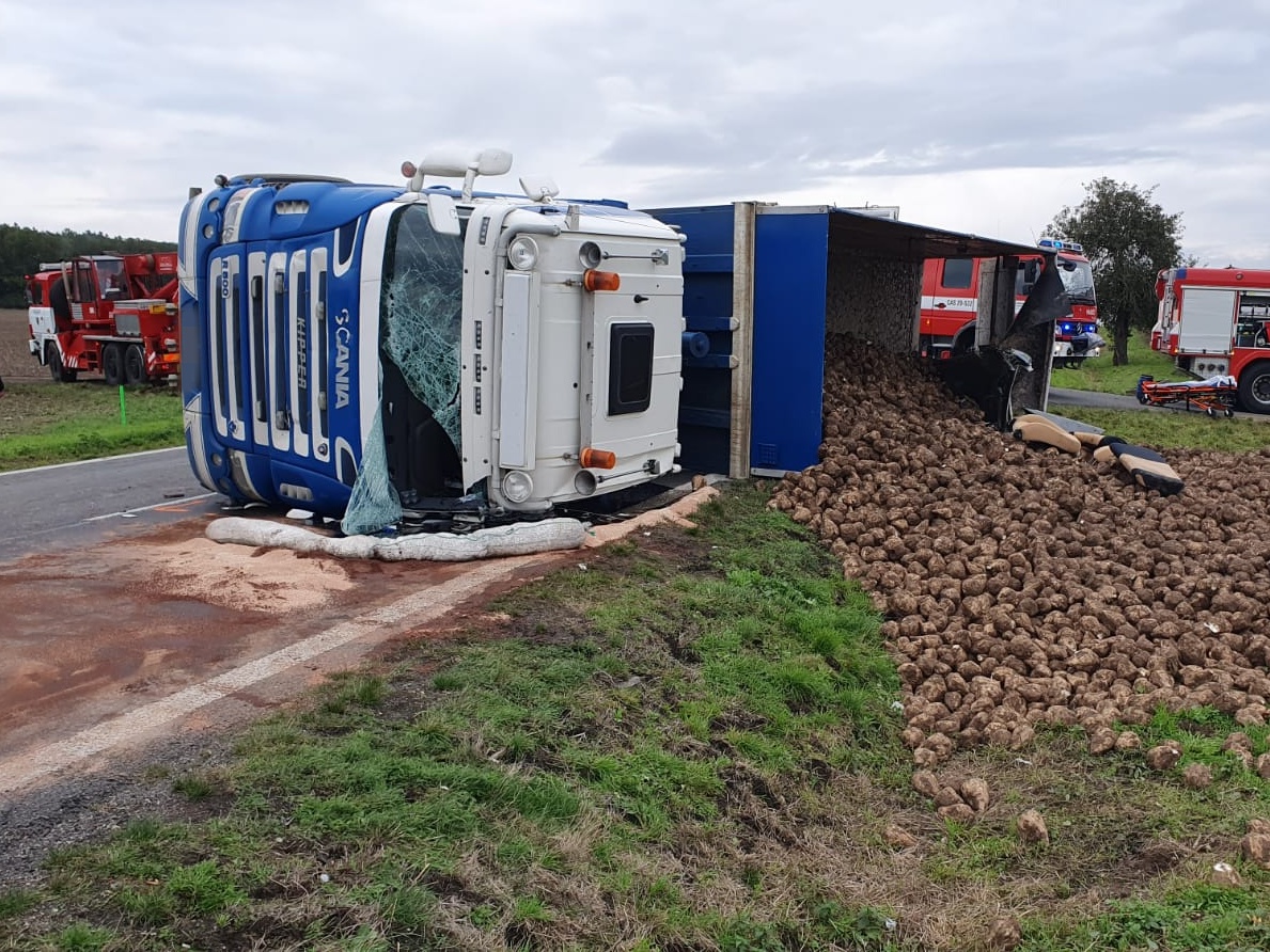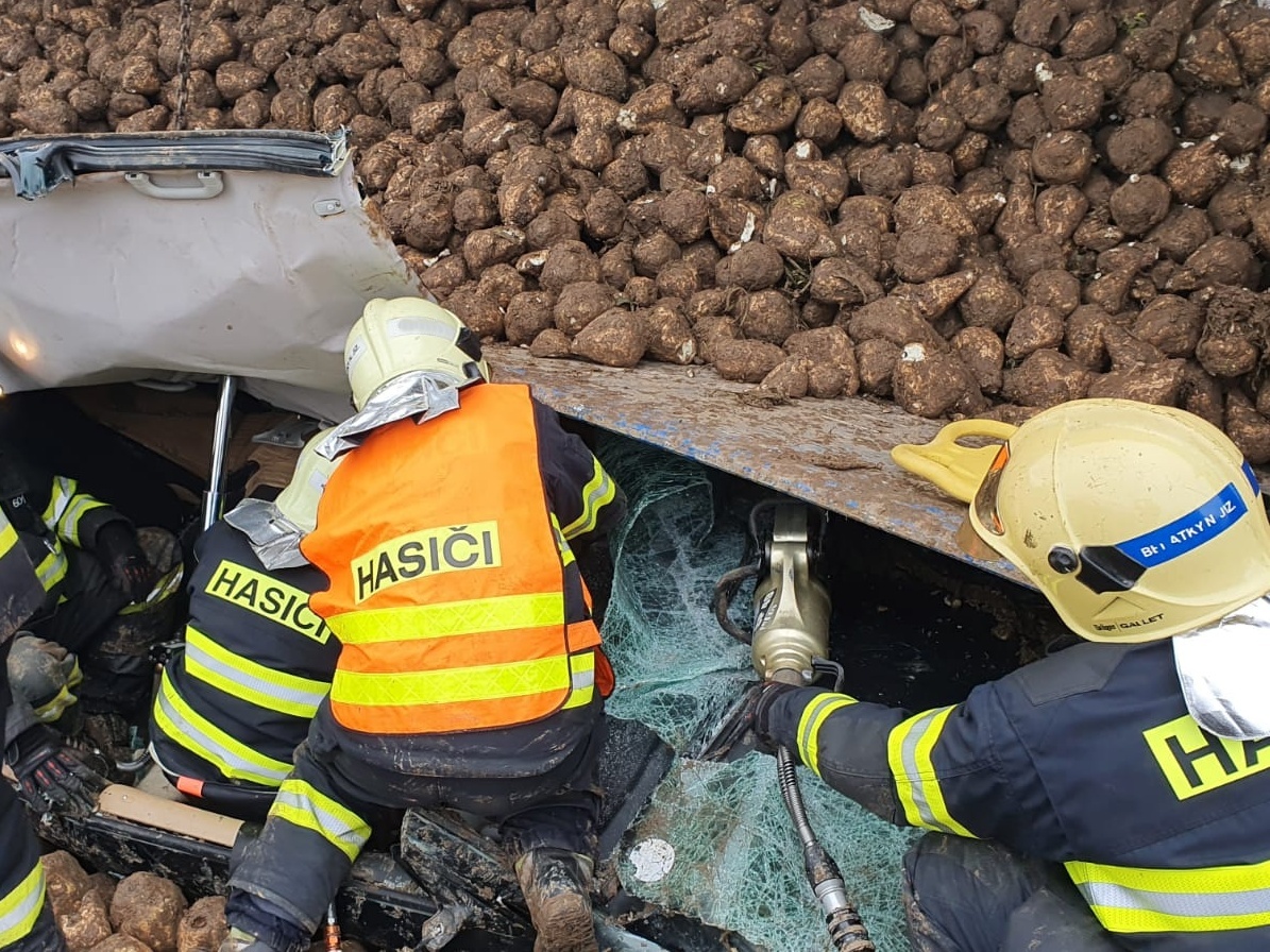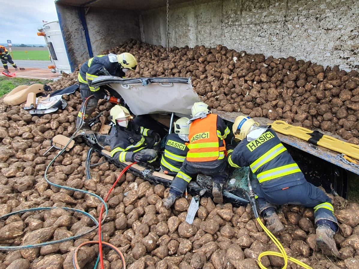 Oznamovatel uvedl, že při střetu došlo k převrácení nákladního automobilu na bok a vysypání převážené řepy s tím, že osobní vozidlo zůstalo uvězněné pod kamionem a částečně zasypané nákladem. Operační důstojník k nehodě vyslal profesionální hasiče ze stanic Benátky nad Jizerou a Nymburk.