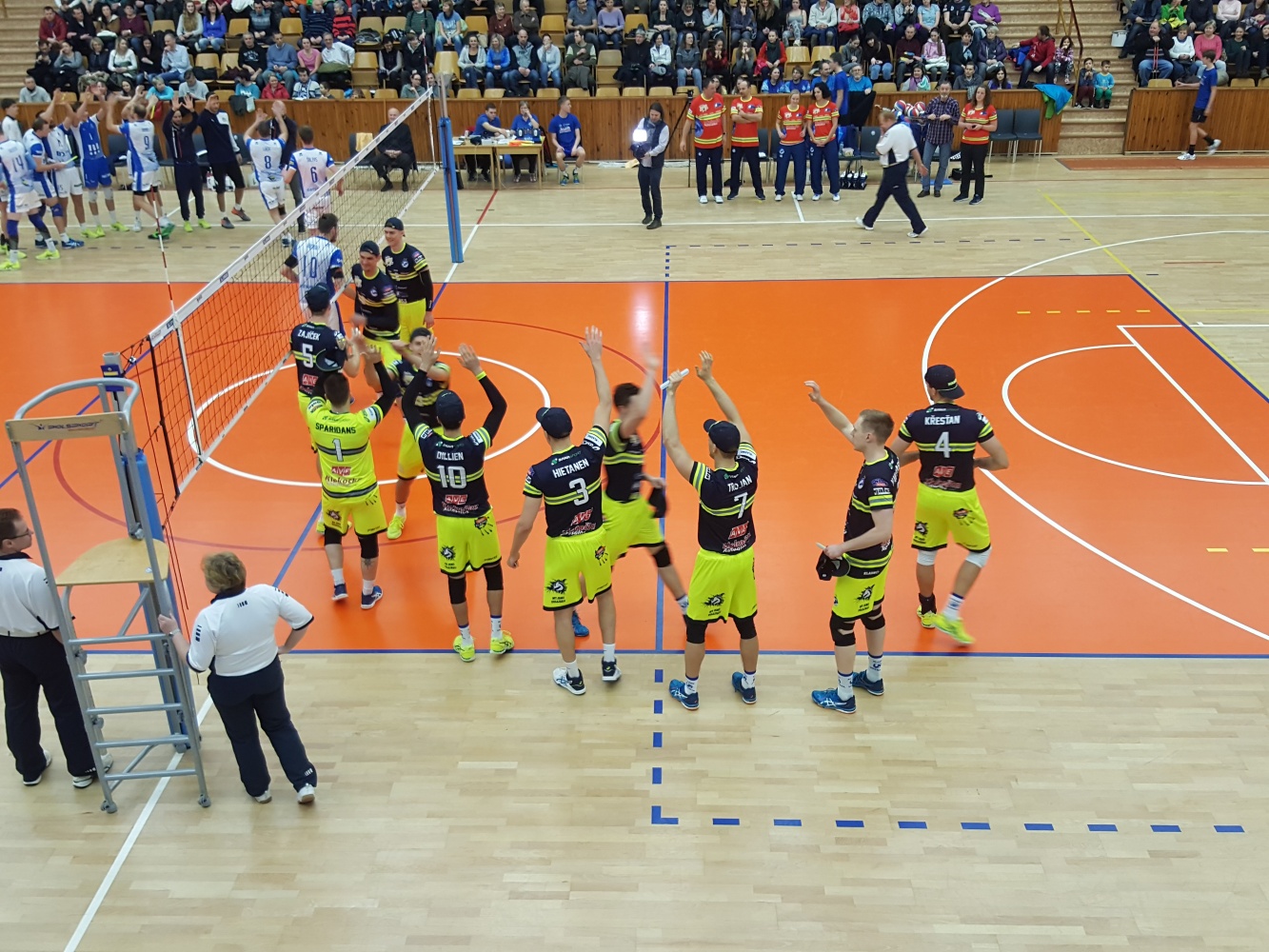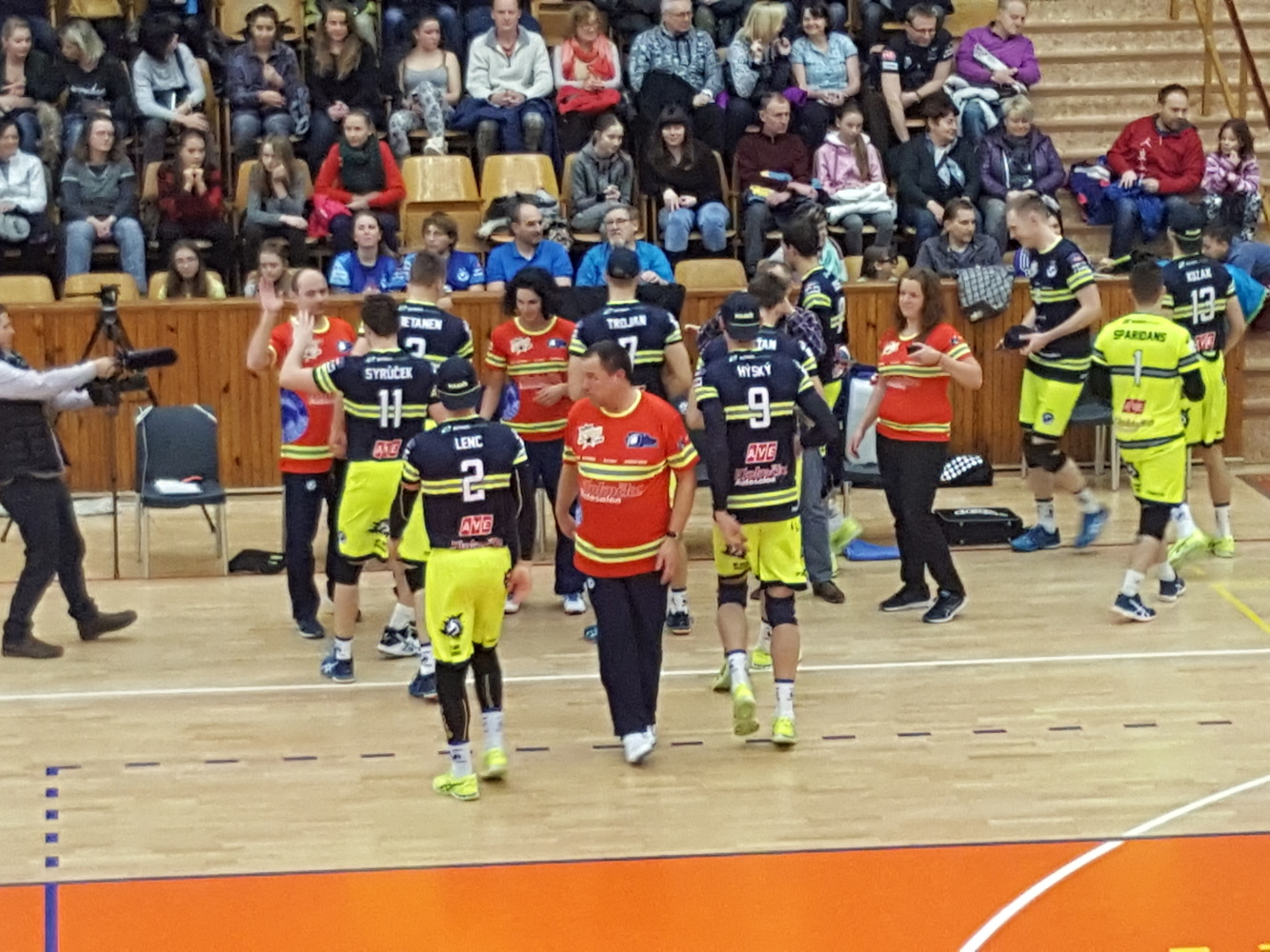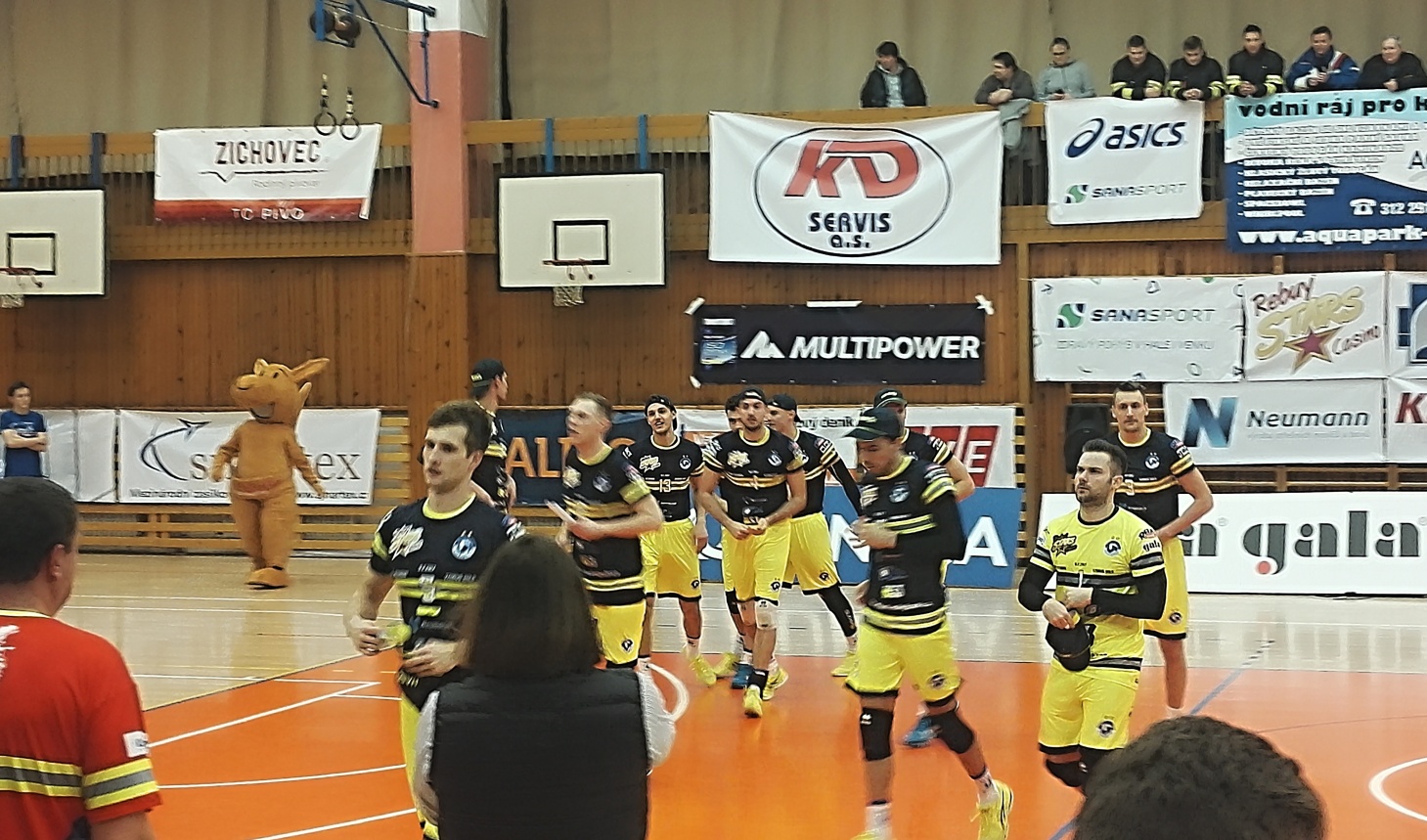 To se téměř zaplněná hala vzápětí dozvěděla i od místního hlasatele a diváci tato slova odměnili dlouhým potleskem, který směřoval i k hasičům přítomným na utkání. Nejnápadnější byla samozřejmě trojice v zásahových oblecích s přilbami, která přijela všechny pozdravit za sloužící směnu A.